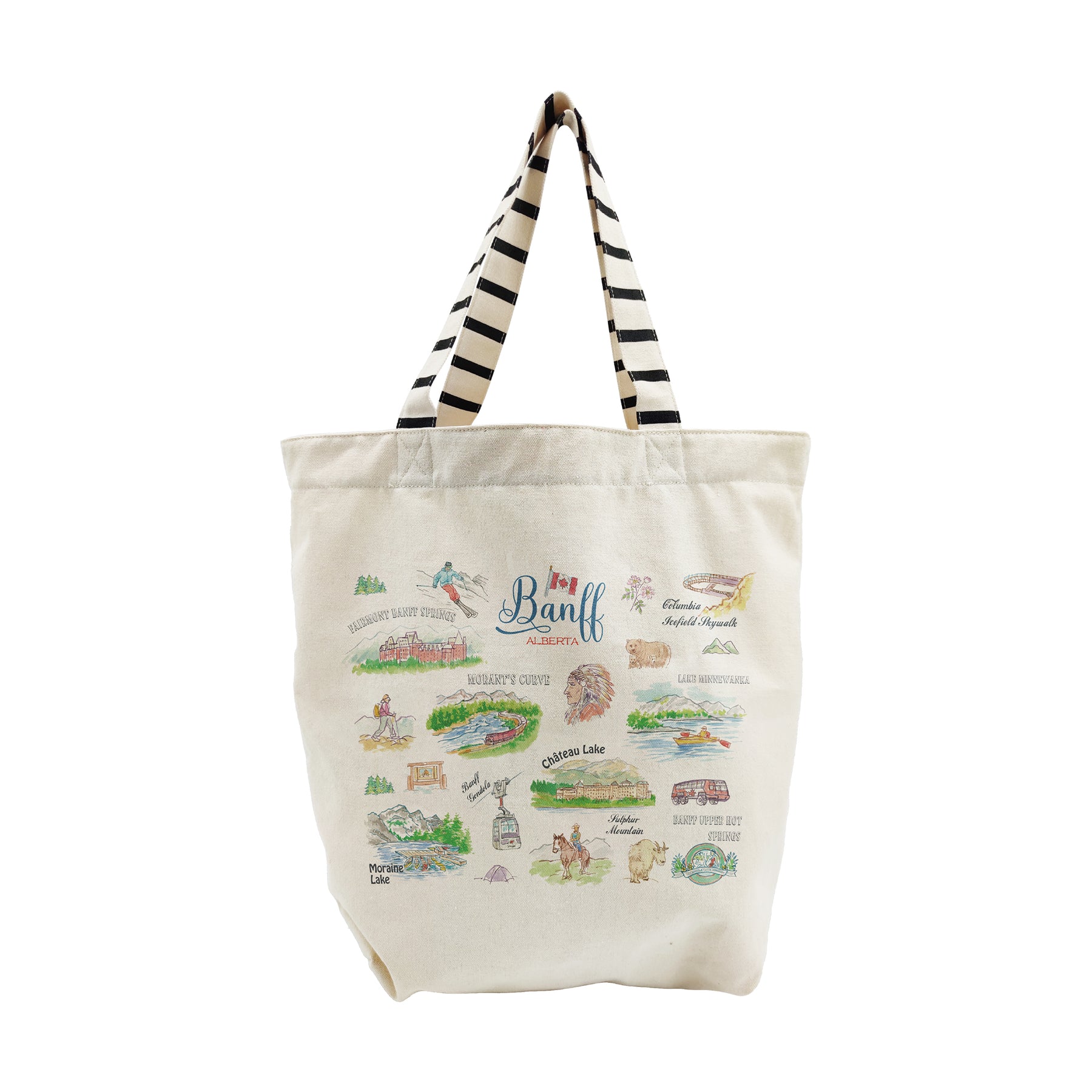 Crafted with a spacious interior, this tote is perfect for carrying books, groceries, or daily essentials. The sturdy striped handles add a modern touch and provide comfortable support for everyday use. Whether for shopping, outings, or as a memorable keepsake, this tote combines practicality with a unique Banff-themed design.