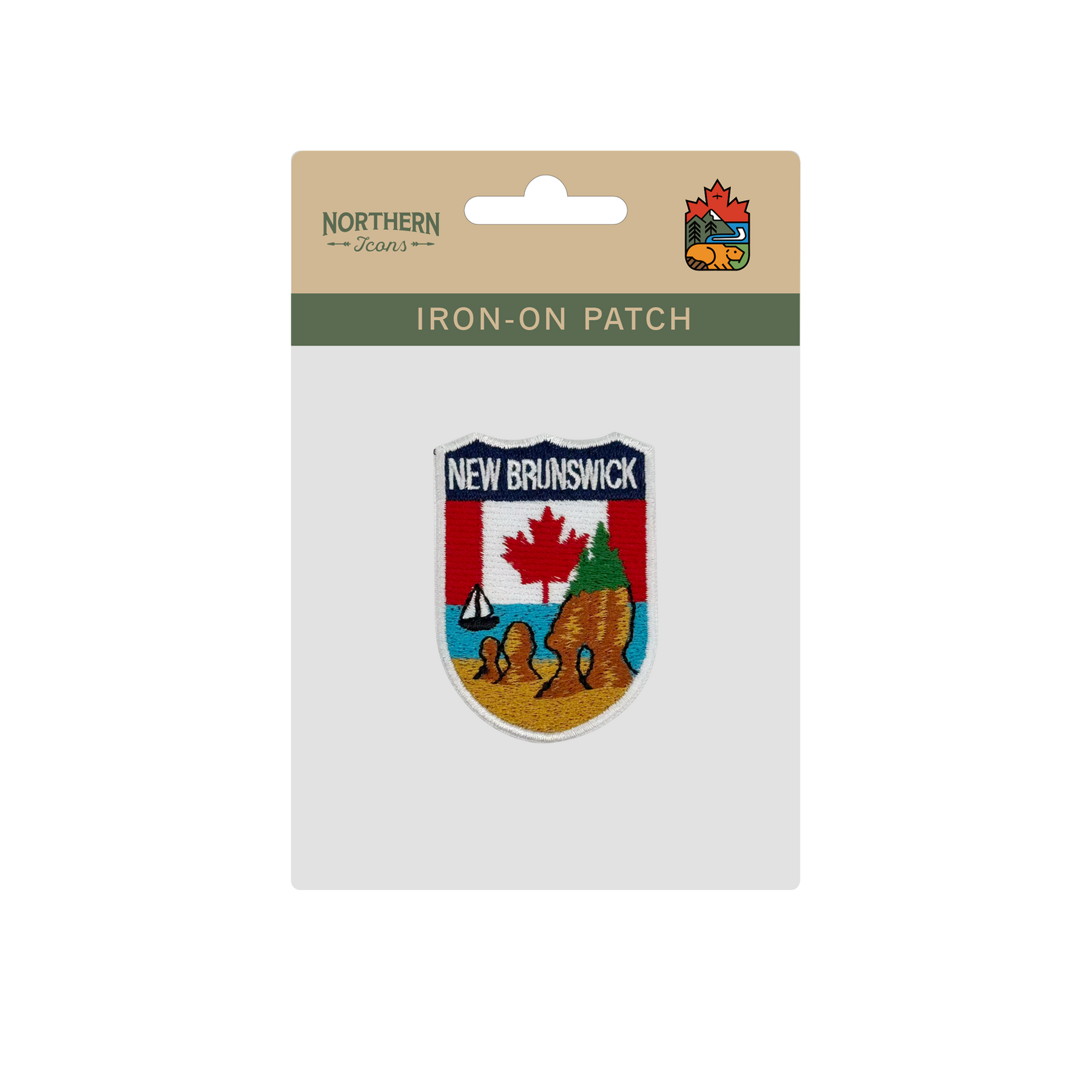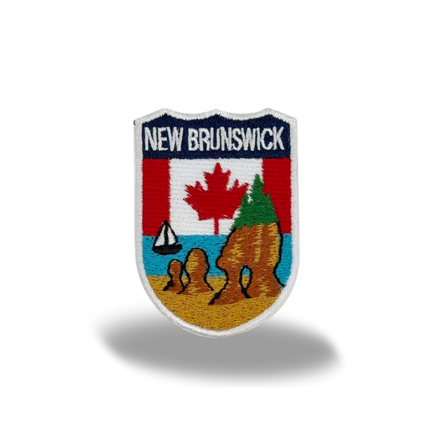 Celebrate the rugged coastline and maritime character of New Brunswick with this Coastal Shield Embroidered Patch. Designed in a classic shield shape, the artwork draws inspiration from the province’s iconic shoreline, featuring sculpted sea stacks, sandy coastal landforms, gentle ocean waves, and a small sailing boat drifting across open water. A bold maple leaf anchors the design in Canadian identity while allowing the coastal scenery to take center stage.