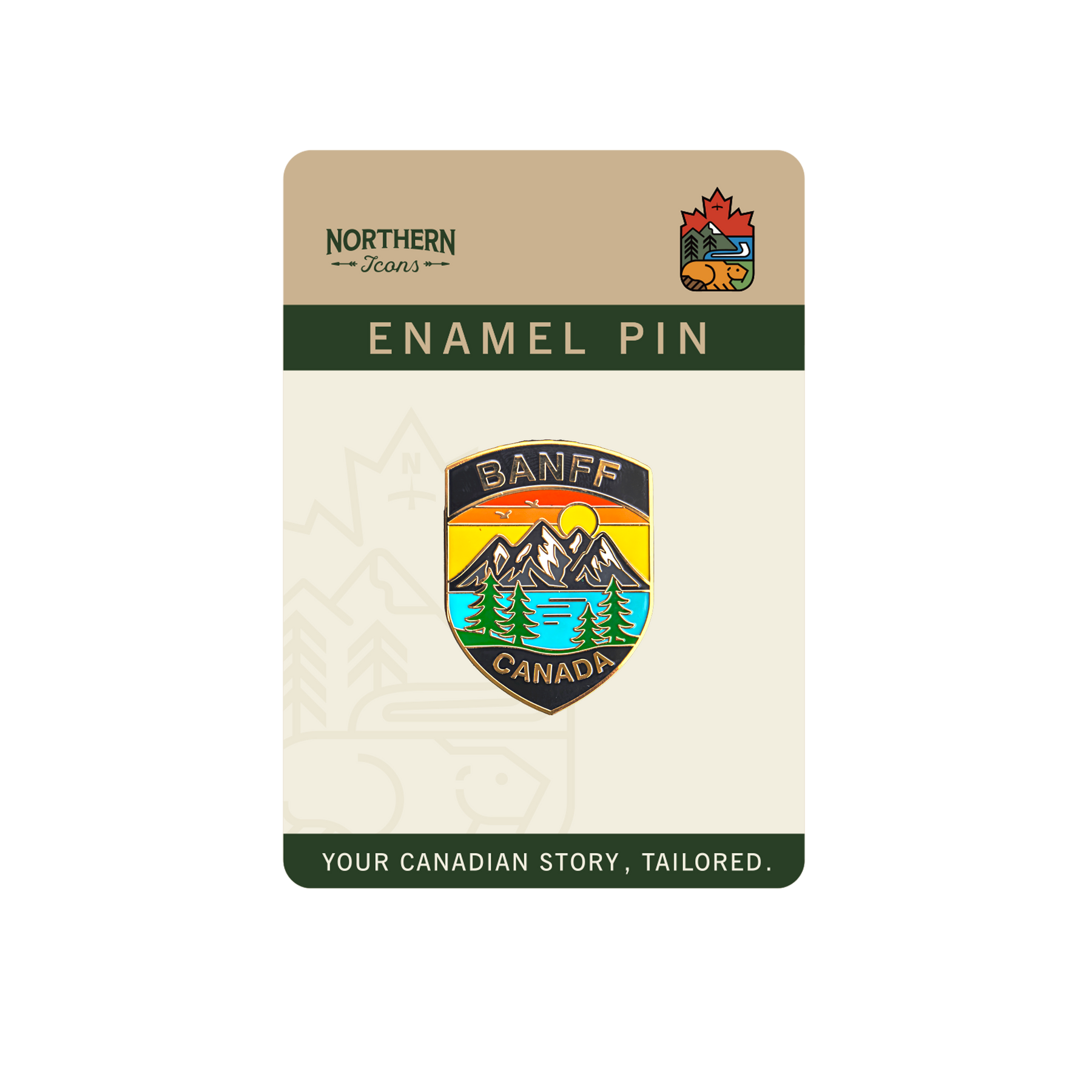 Vibrant Mountain Design: Depicts Banff’s iconic peaks and sunset in rich enamel colors.