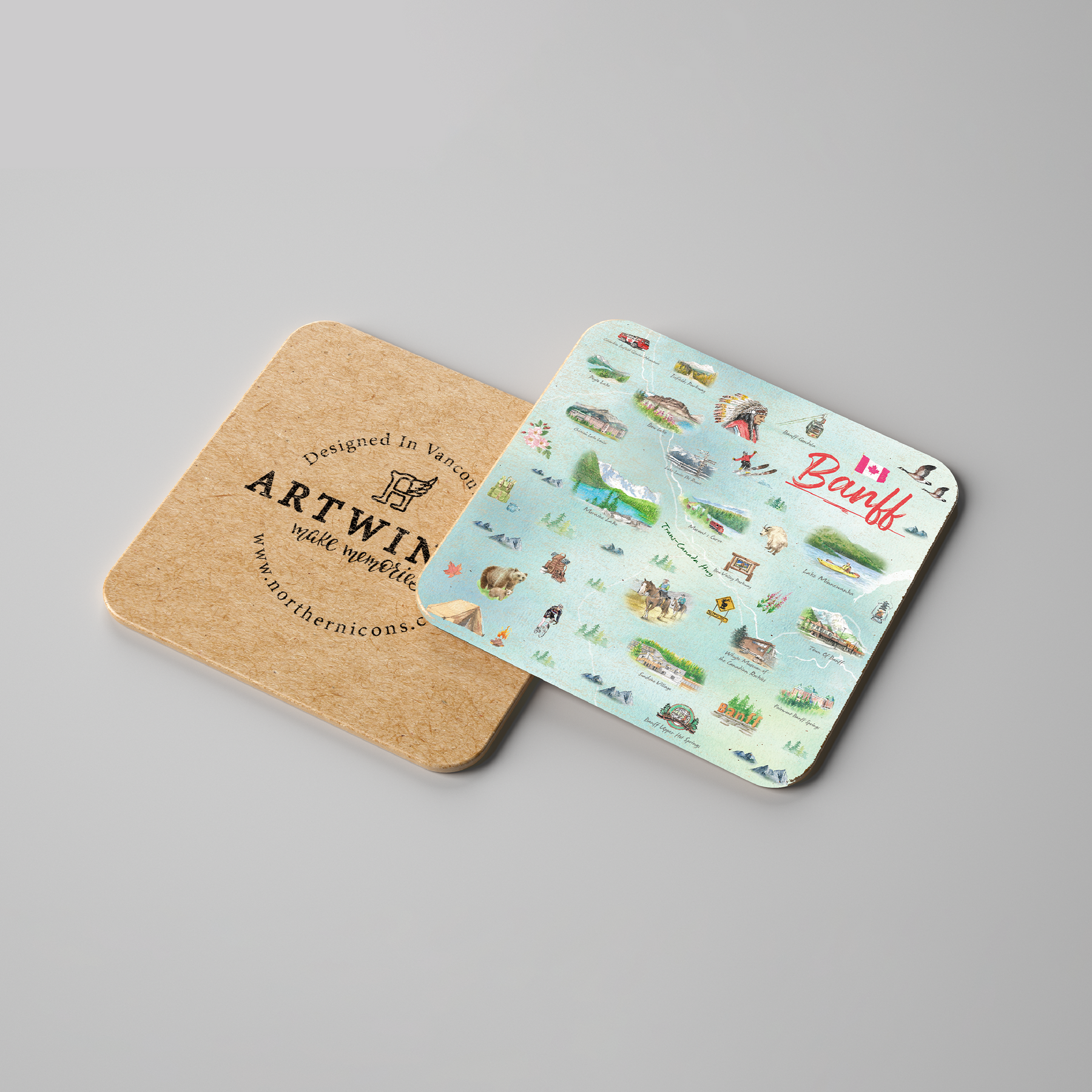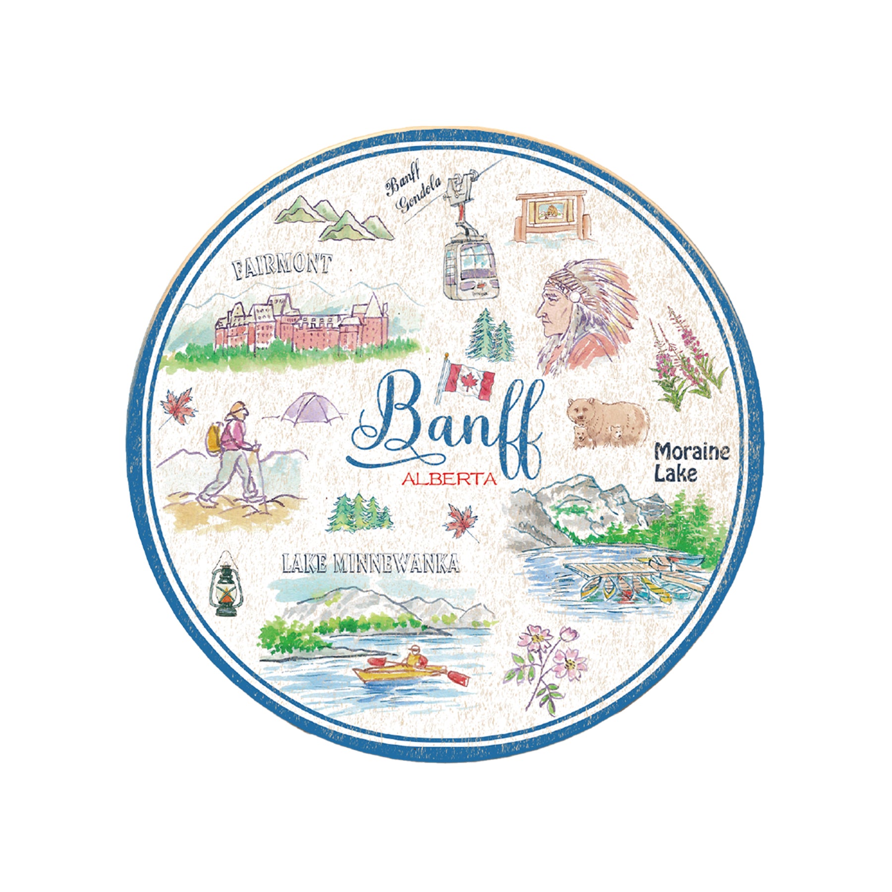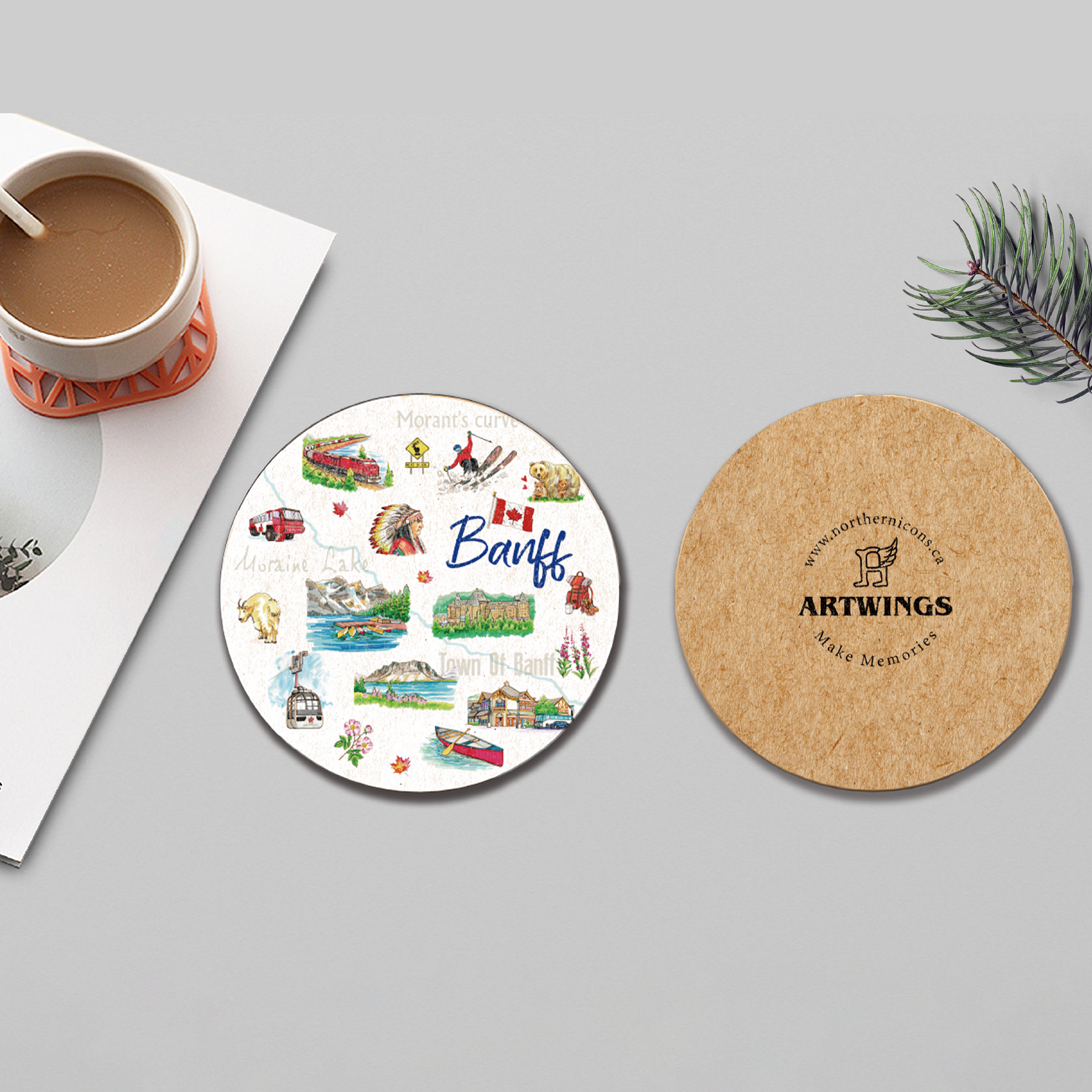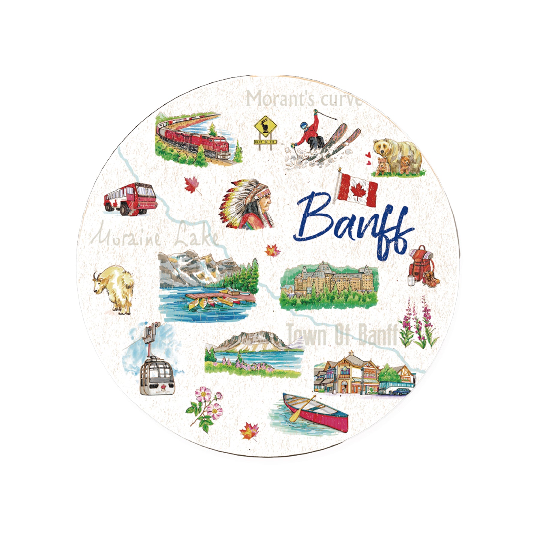 Crafted with a practical design, these coasters are perfect for protecting surfaces from hot or cold drinks while adding a decorative touch to any table. With their colorful and detailed artwork, they also make a thoughtful souvenir or gift for Banff enthusiasts and travelers.