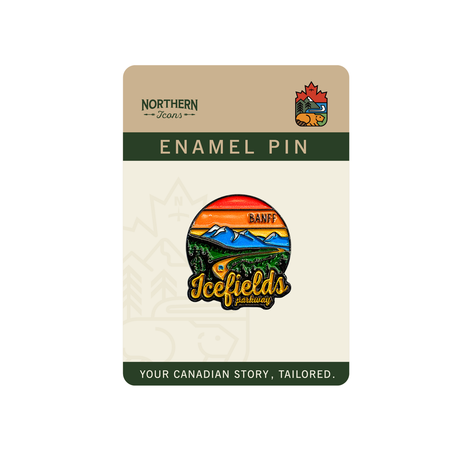 Experience the beauty of Canada’s most iconic highway with this Rocky Mountain Highway Enamel Pin. Showcasing a winding road leading through lush forests and towering mountain peaks beneath a breathtaking sunset, this design captures the spirit of adventure and the awe-inspiring landscapes of the Rockies. The rich enamel colors and intricate craftsmanship make it a striking tribute to one of the world's most scenic drives.