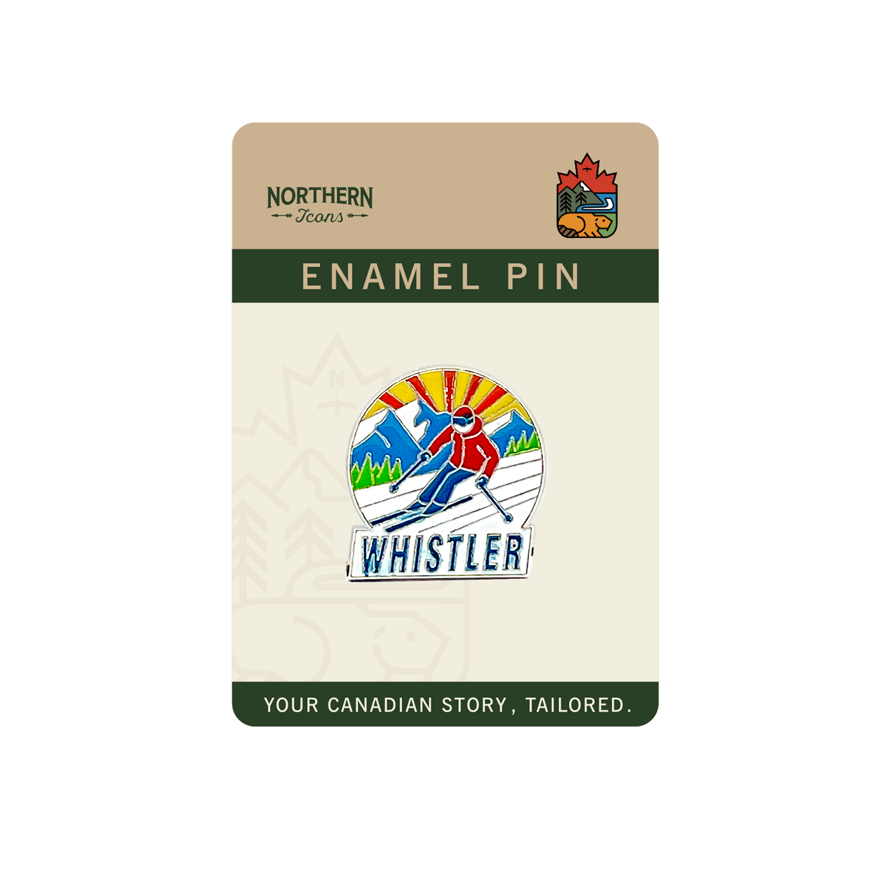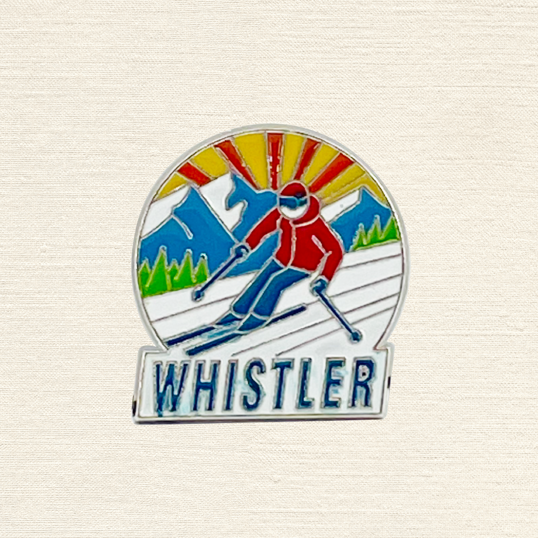 This vibrant enamel pin captures the thrill of skiing in Whistler. A skier in motion carves through fresh snow with majestic mountains and a rising sun in the background. The bold lines and vivid colors bring energy and excitement, symbolizing freedom, adrenaline, and the beauty of winter sports.