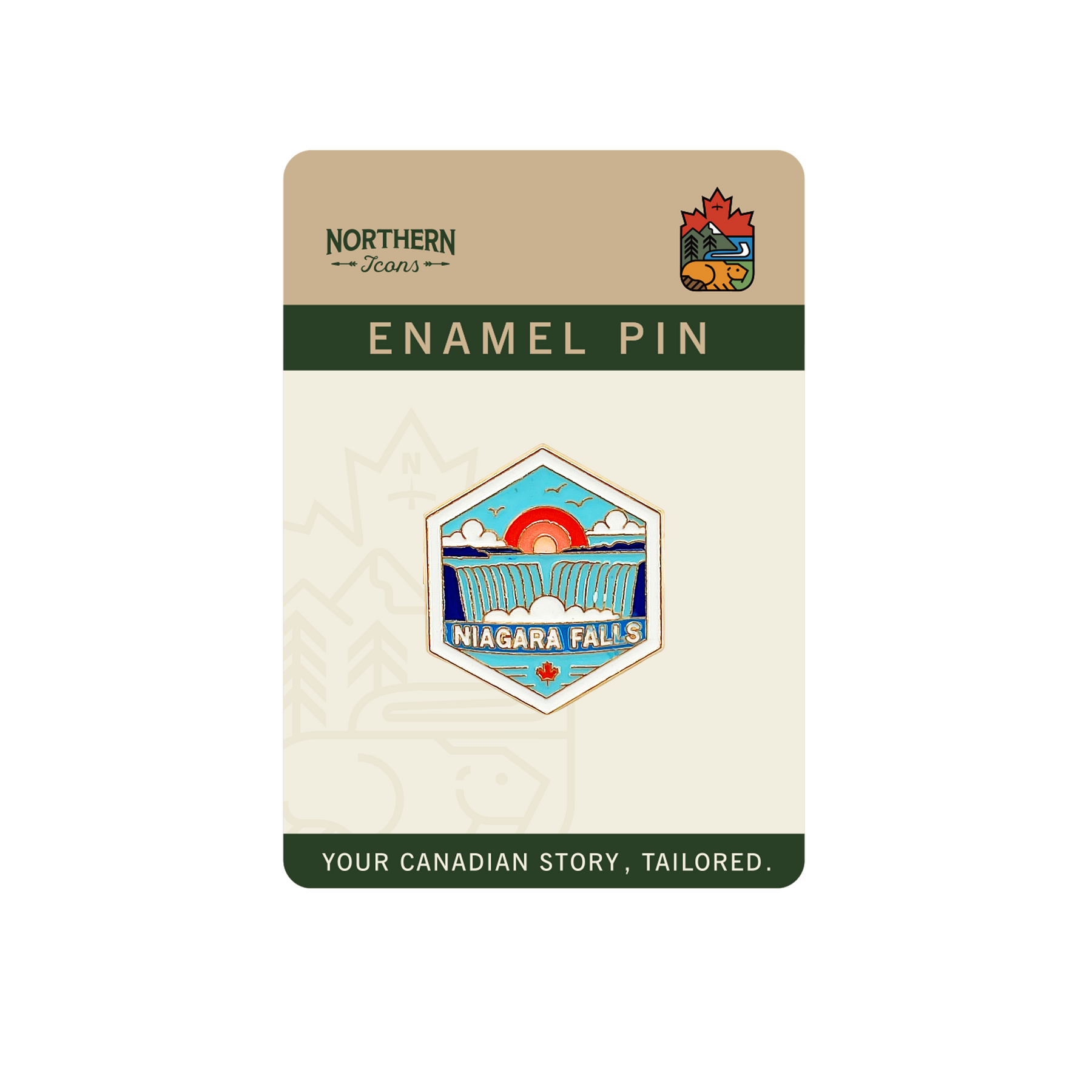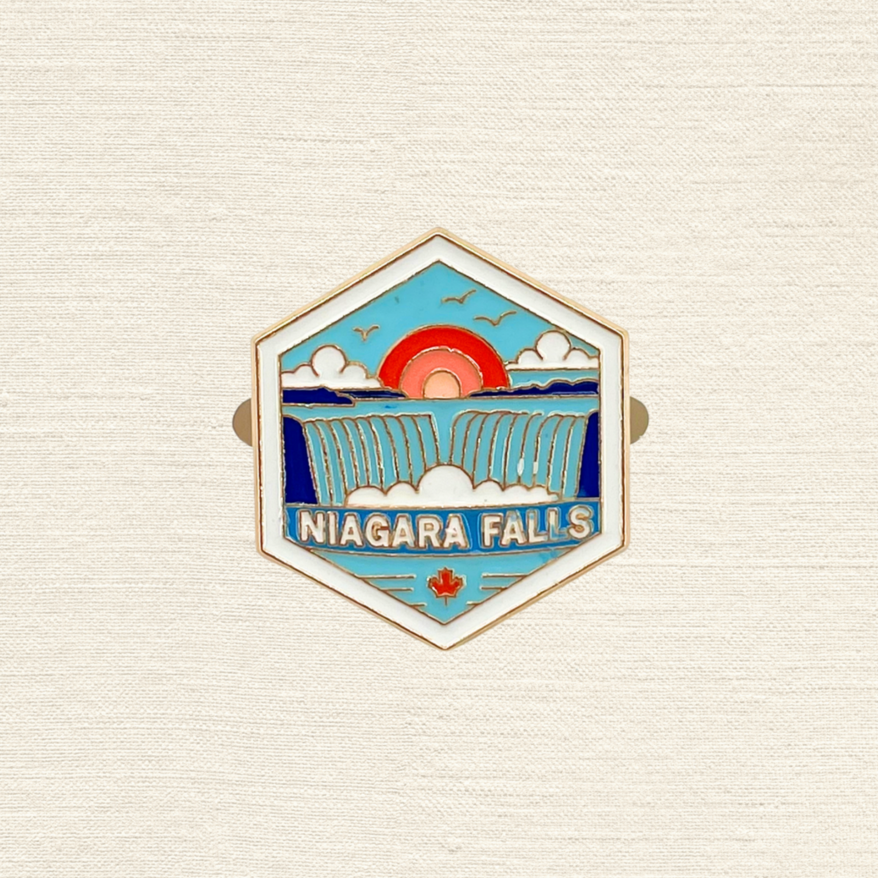 With its bold hexagon shape and serene sunset scene, this pin beautifully captures the iconic Niagara Falls at golden hour. The cascading water, vibrant sky, and soaring birds evoke a moment of peace, awe, and connection to nature’s majesty. The soft, clean lines and balanced composition give this piece a timeless, emblem-like appeal.
