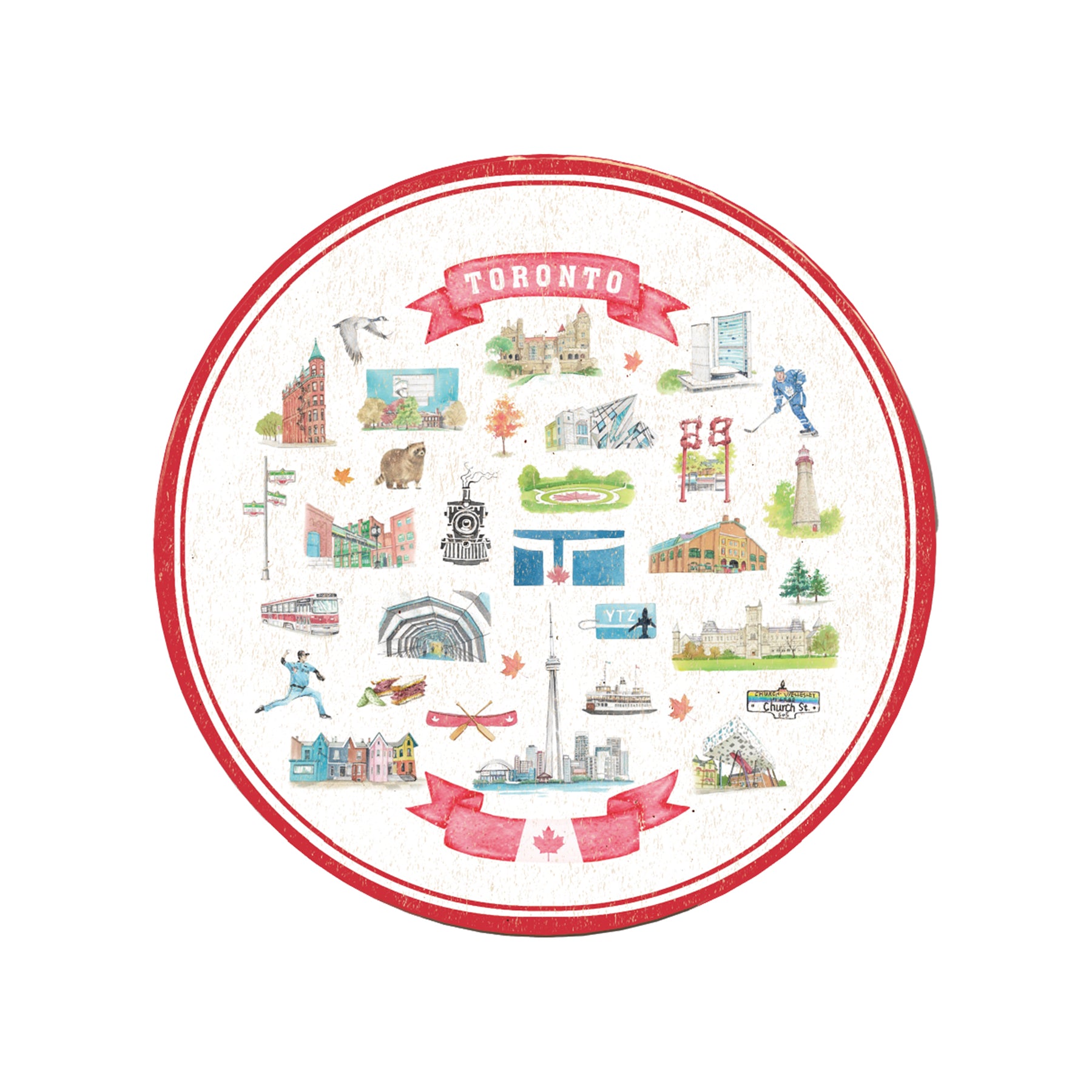 • Artistic city design: Features hand-drawn illustrations of Toronto’s iconic landmarks and symbols.
