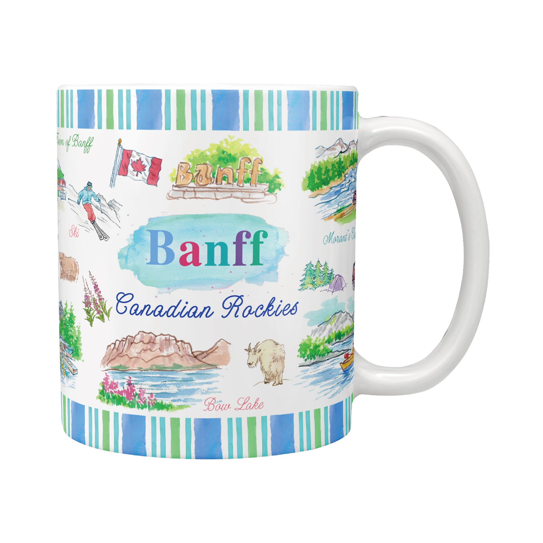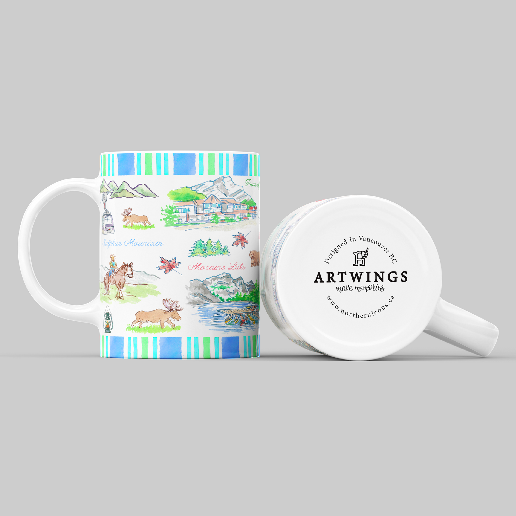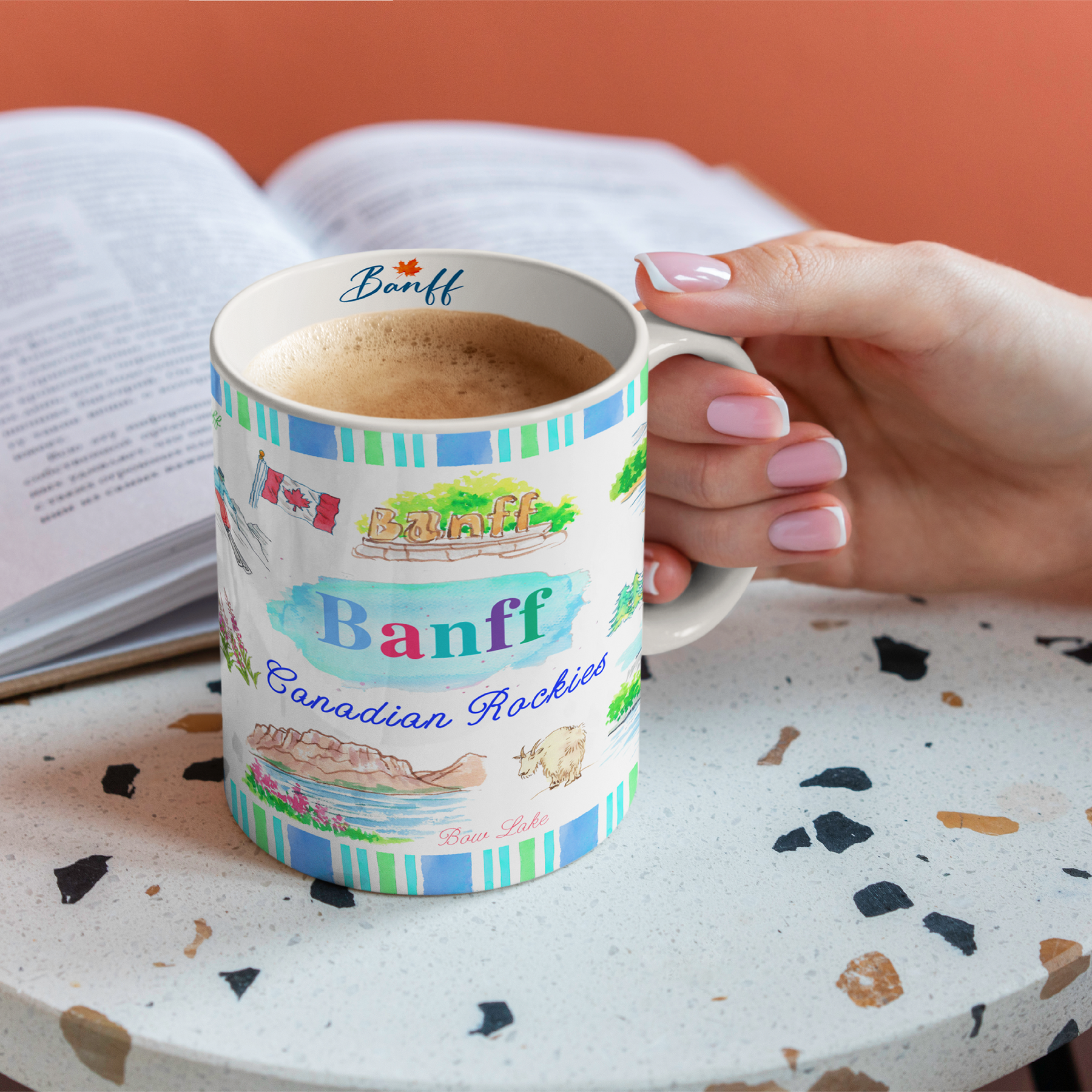 Bring the charm of Banff into your everyday routine with this illustrated 500ml coffee mug. Inspired by the Canadian Rockies, the design features hand-drawn scenes of Banff’s iconic landmarks, mountain landscapes, and local wildlife. The colorful artwork, framed with stripe details, gives the mug a playful canvas-style look that celebrates the beauty of Alberta.