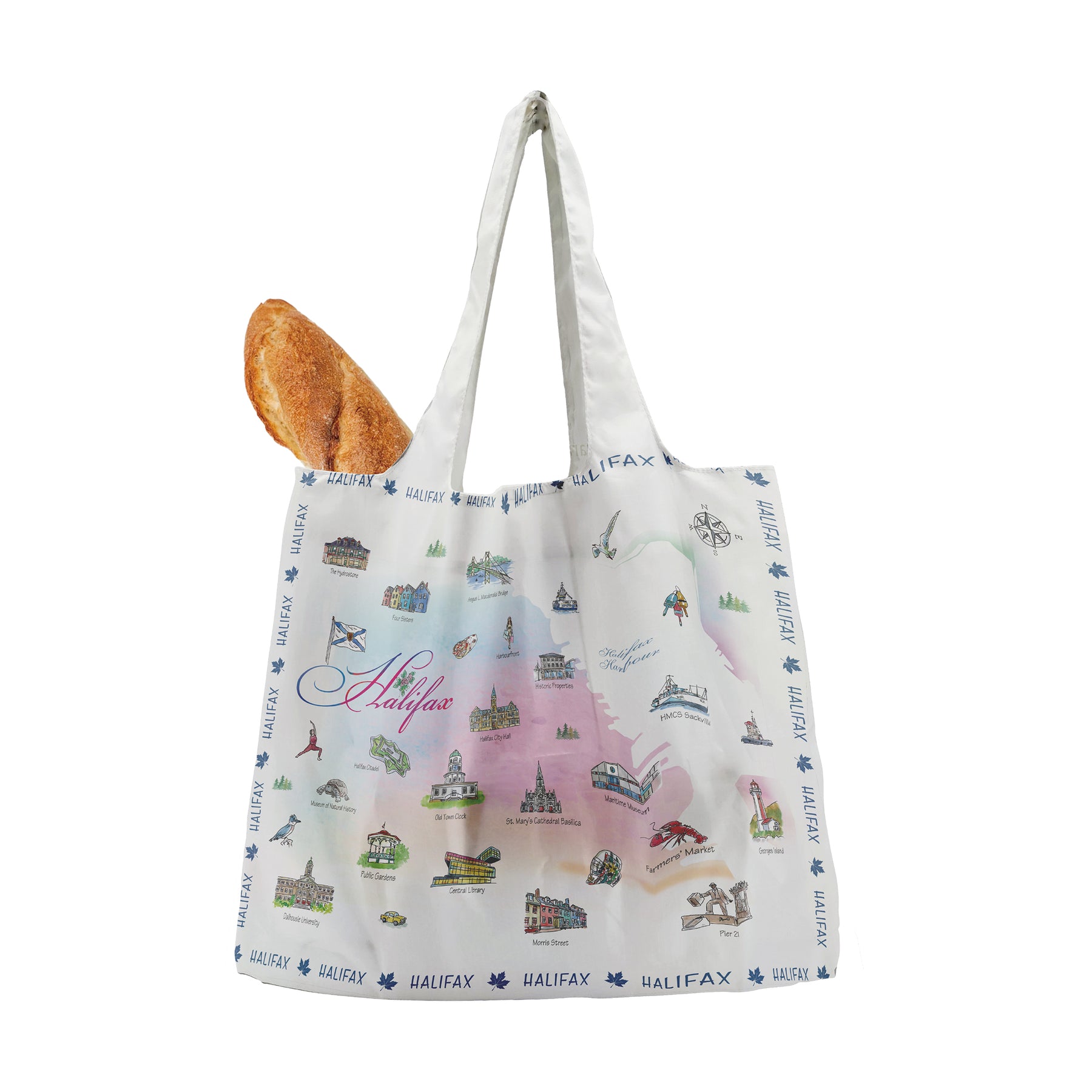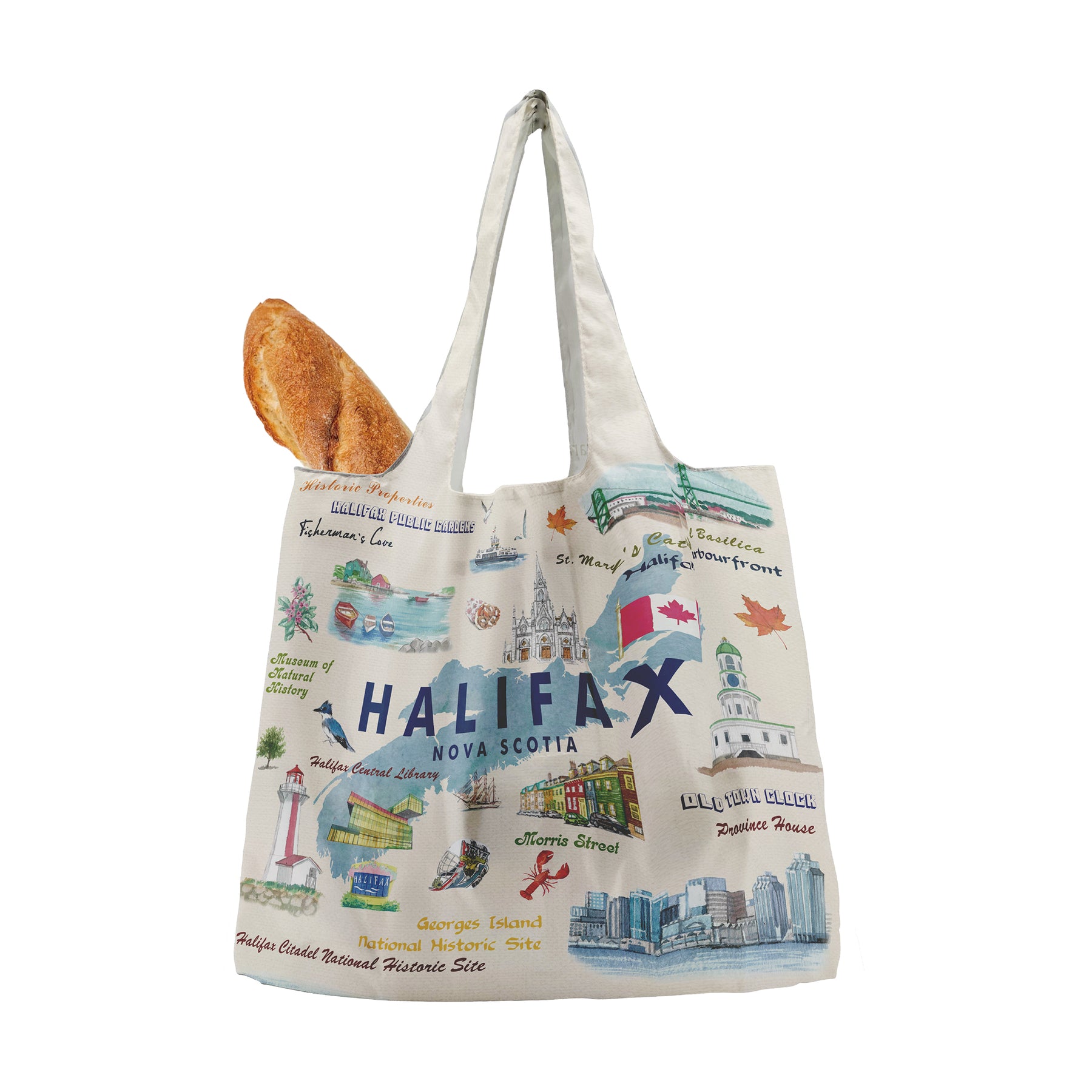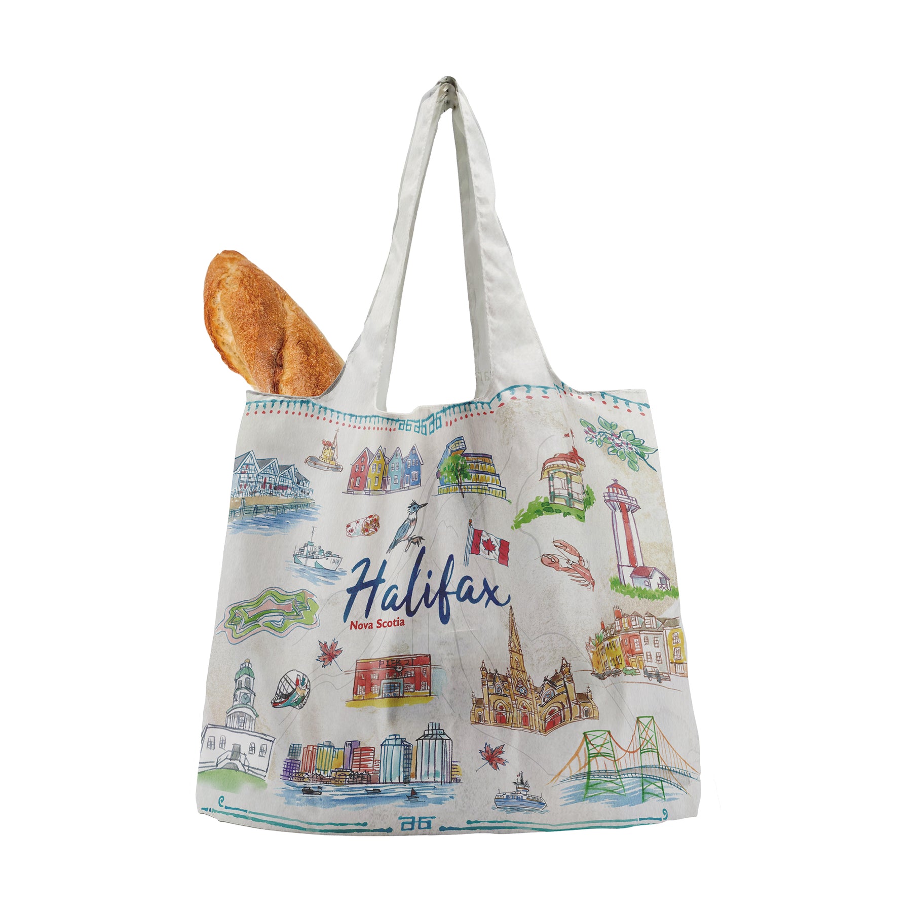 Crafted from lightweight yet durable fabric, this tote folds easily into a compact size, making it ideal for shopping, day trips, or carrying as an extra travel bag. The wide handles provide comfortable support, while the spacious interior allows room for groceries, books, or everyday essentials. It’s a functional, artistic, and memorable accessory inspired by the charm of Nova Scotia’s coastal city.