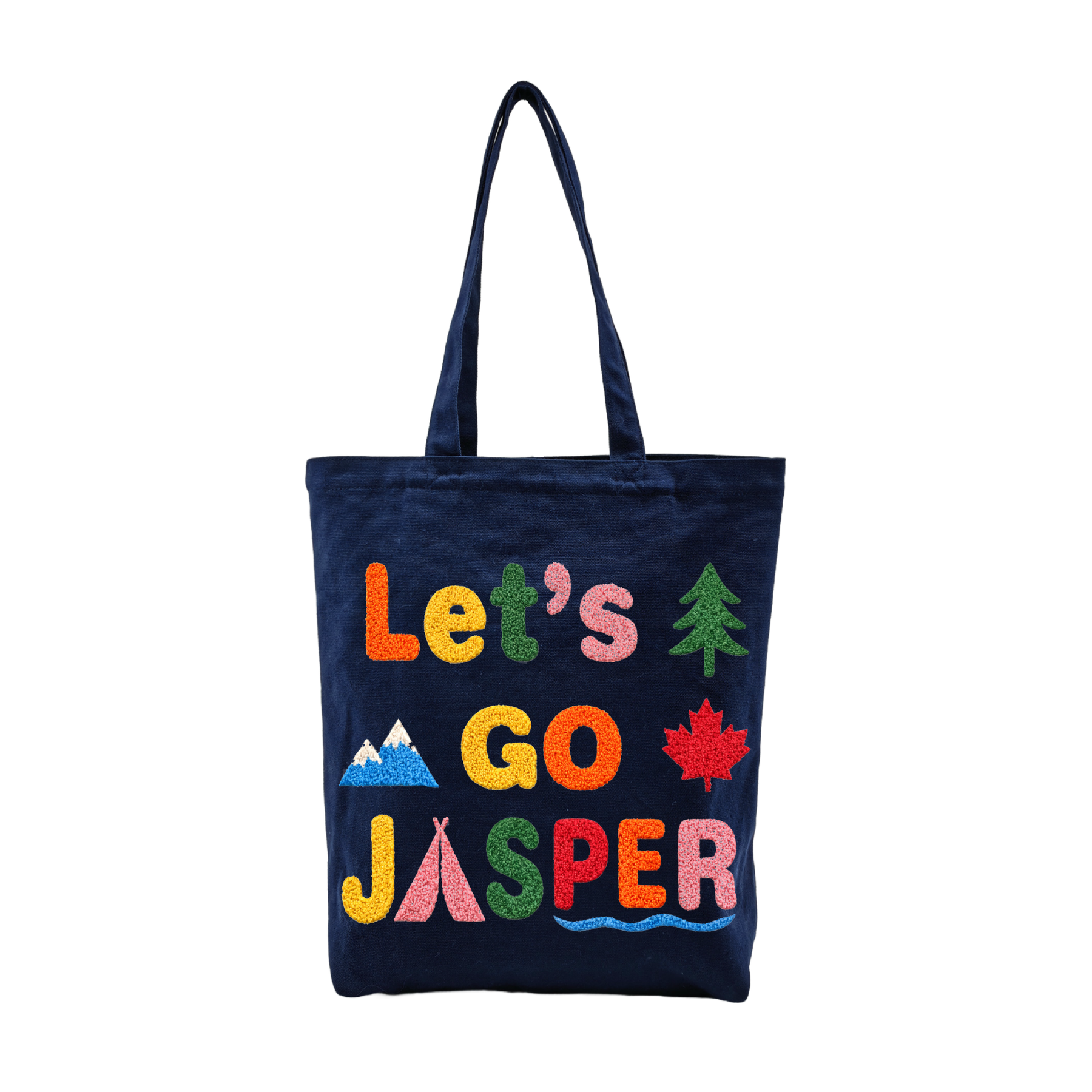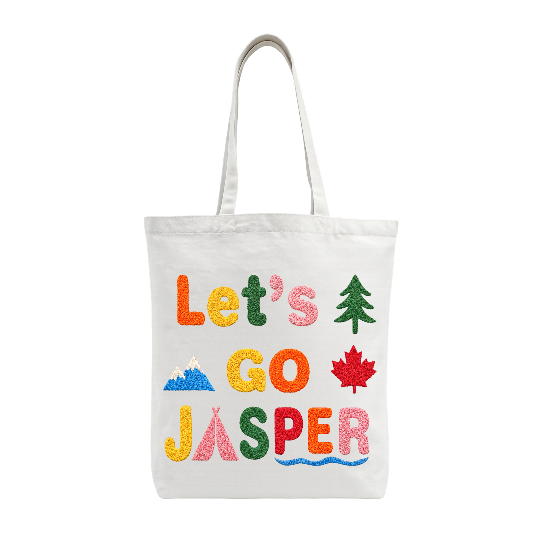 The Let’s Go Jasper Chenille Embroidery Tote Bag captures the spirit of adventure inspired by the breathtaking landscapes of Jasper. The design features bold chenille embroidery lettering that spells “Let’s Go Jasper,” combined with outdoor-themed icons such as mountains, evergreen trees, a maple leaf, and a camping tent. These elements reflect the natural beauty and wilderness experiences associated with Jasper and the Canadian Rockies.