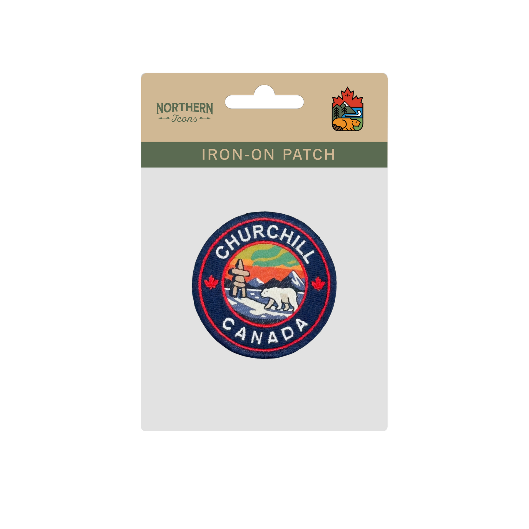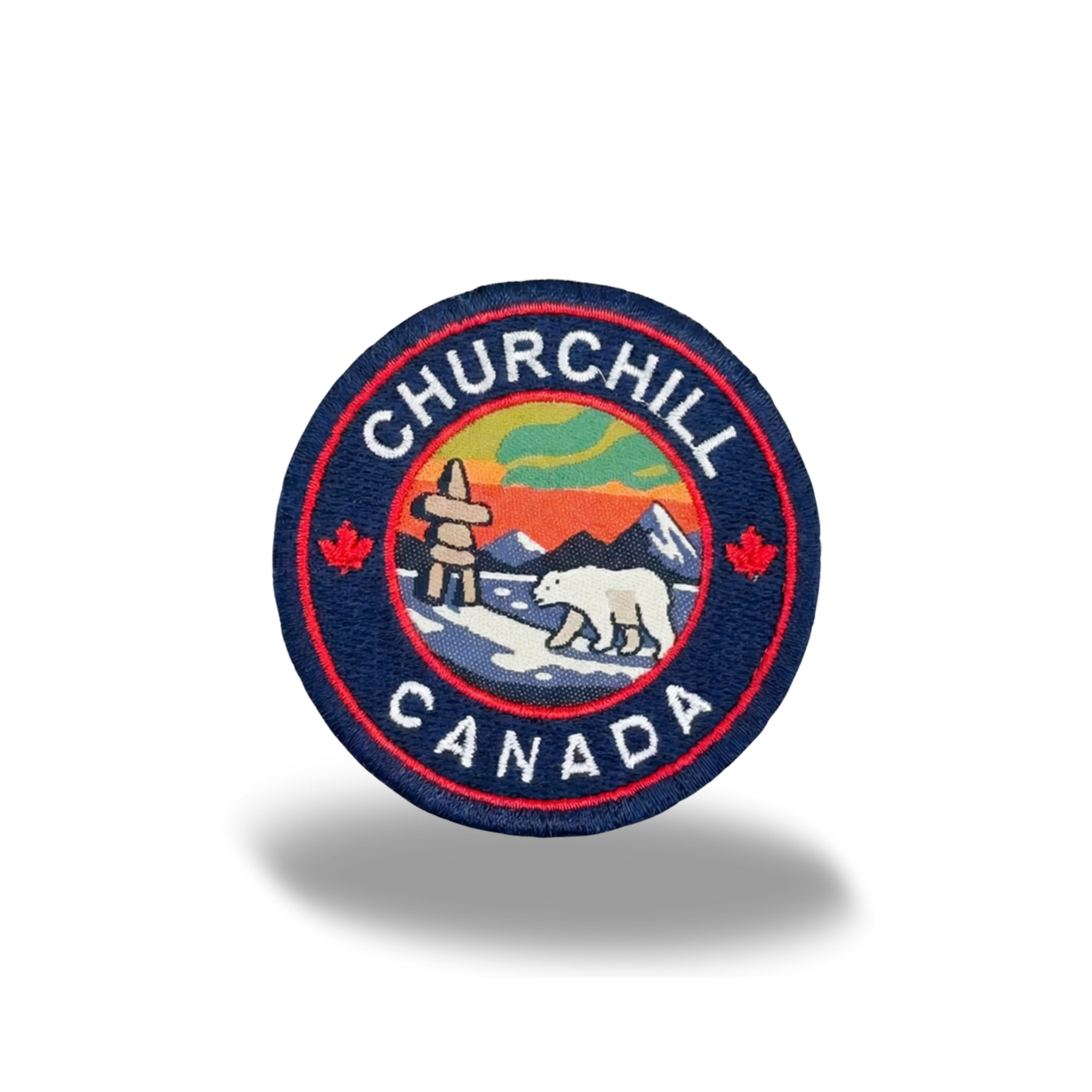 Inspired by the remote beauty of Churchill, this iron-on embroidered patch captures the spirit of Canada’s Arctic landscape through a bold yet refined badge design. The illustration features a polar bear walking across snowy terrain, paired with northern mountains and vibrant sky tones that echo the magic of the far north.