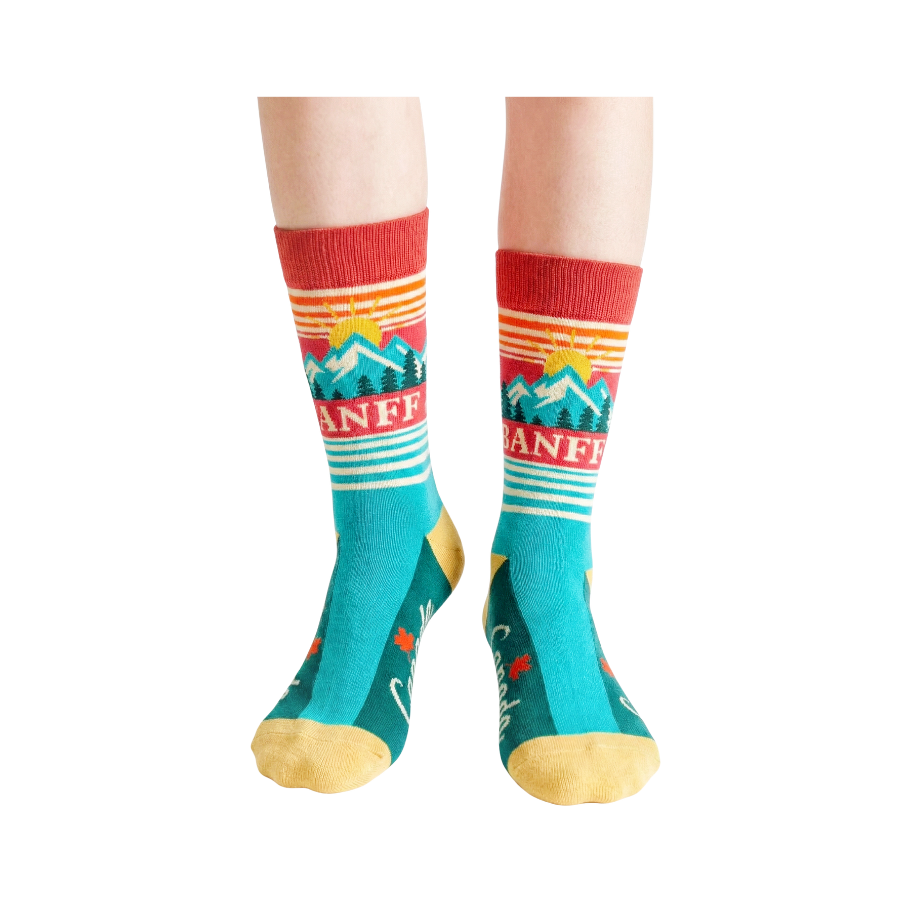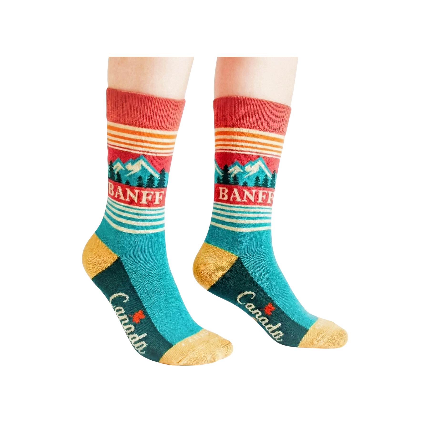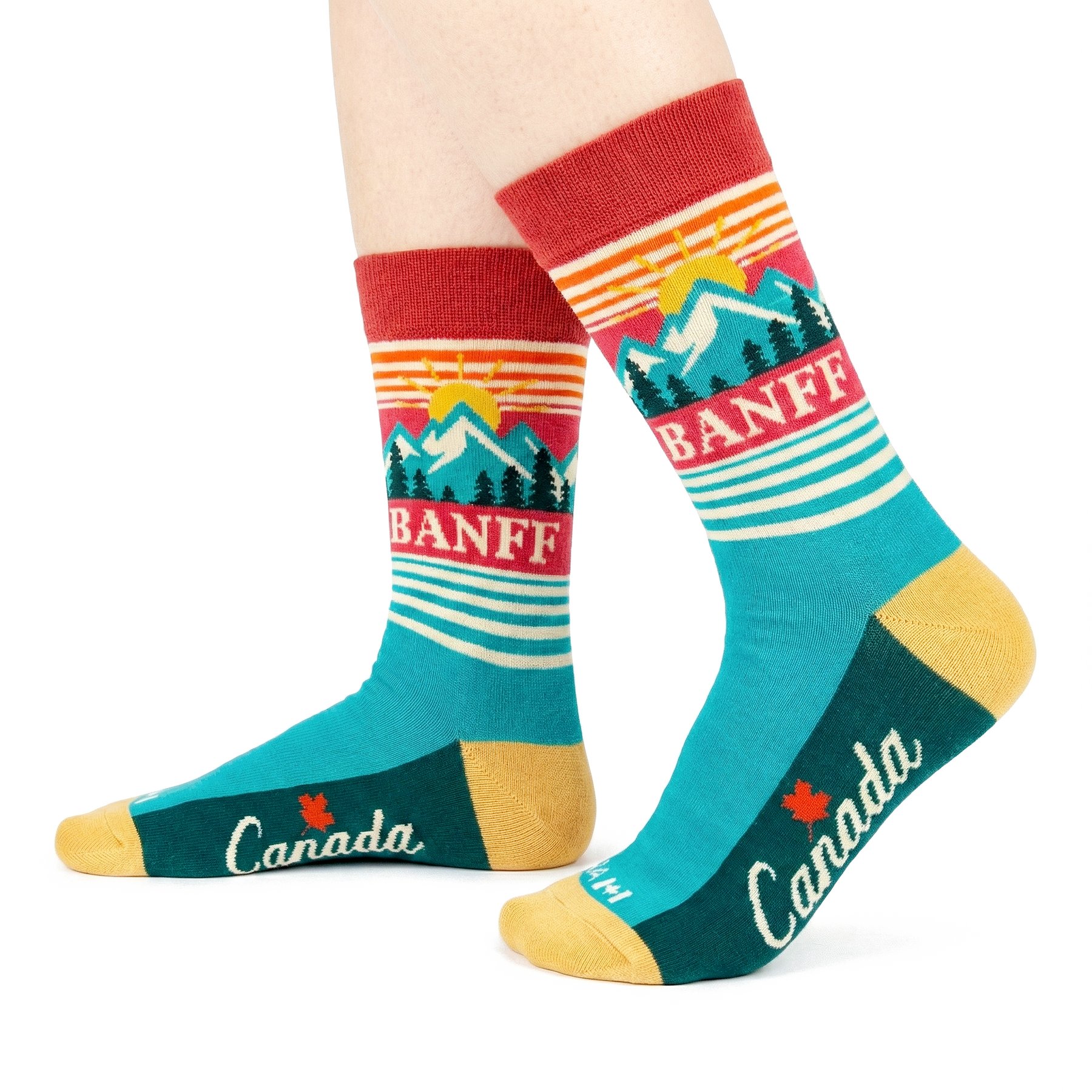Celebrate the iconic mountain scenery and outdoor spirit of Banff with these Banff Canada Crew Socks. Inspired by the dramatic landscapes of the Canadian Rockies, the design features thoughtfully illustrated elements such as layered mountain peaks, a rising sun, evergreen forests, and clean geometric stripes. The bold color blocking and vintage-inspired composition create a strong sense of place while keeping the design timeless and visually striking.