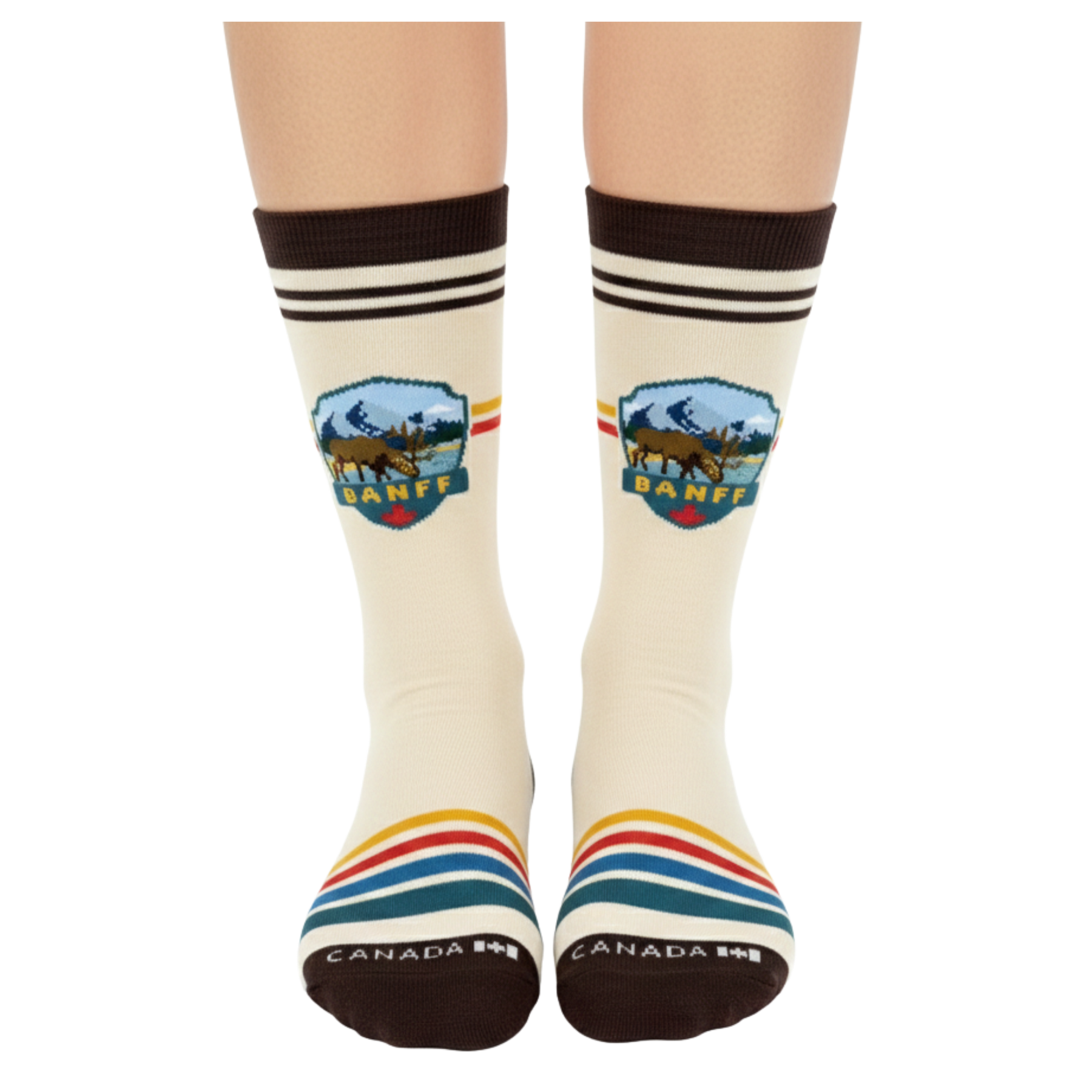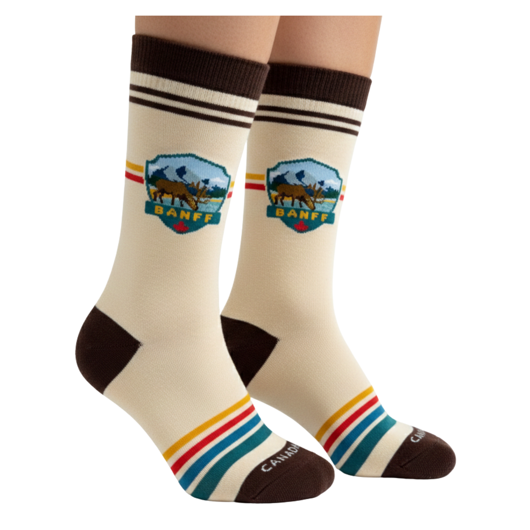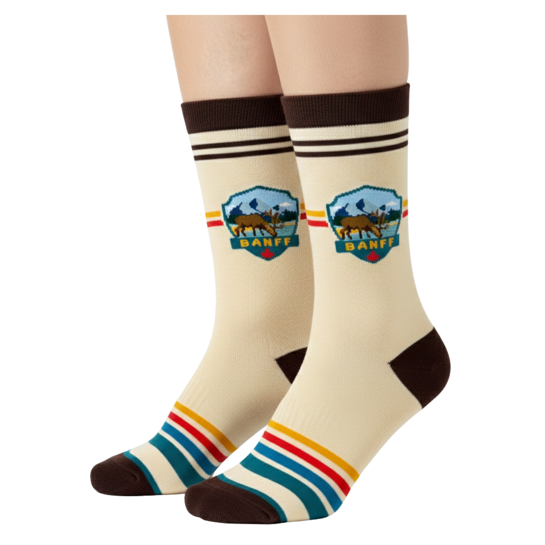 Inspired by the iconic landscapes of Banff and the untamed spirit of the Canadian Rockies, this crew sock design brings together wildlife, mountains, and heritage travel aesthetics in a clean, badge-style illustration. A moose stands at the heart of the design, framed by layered mountain peaks and open skies, symbolizing the strength, calm, and freedom of alpine life.