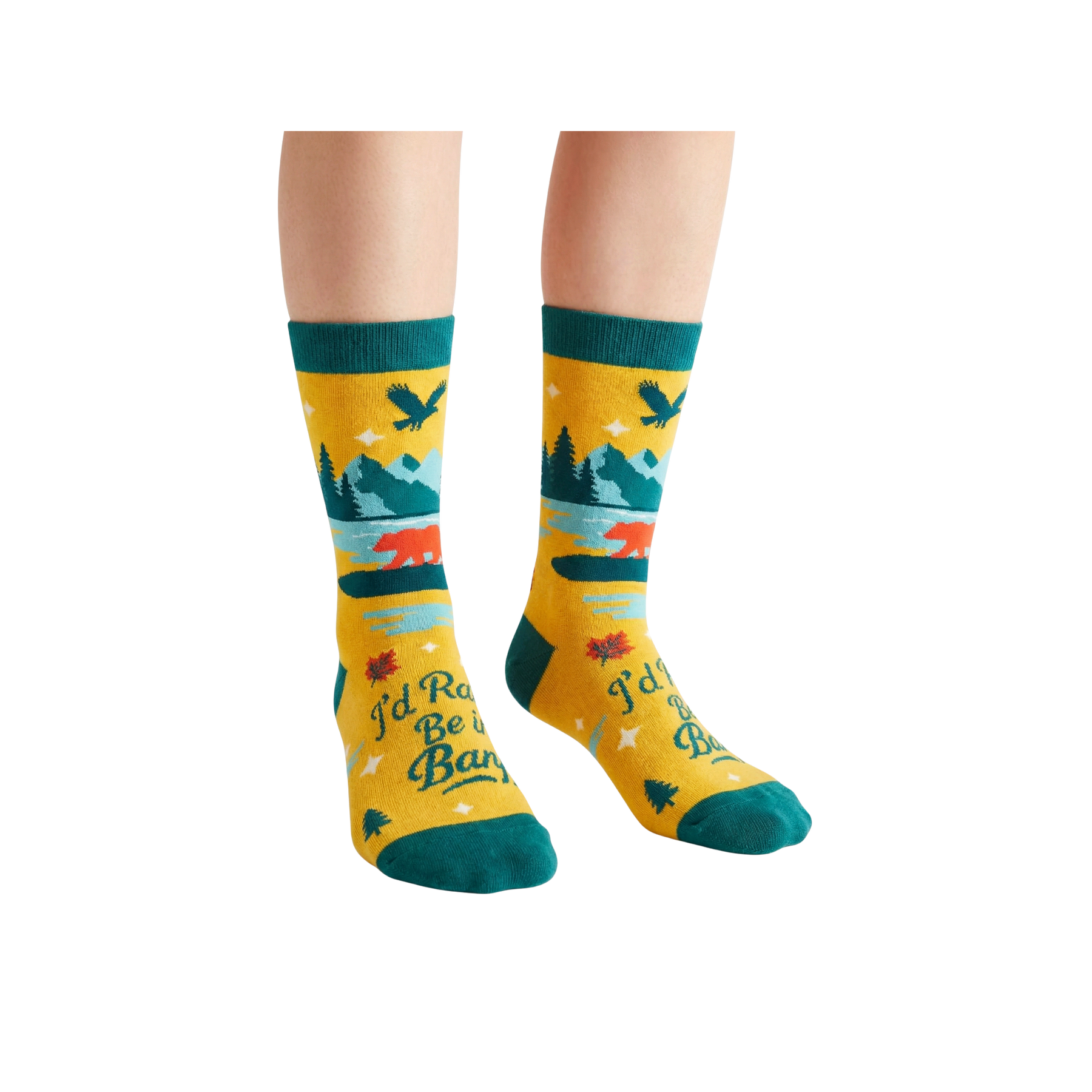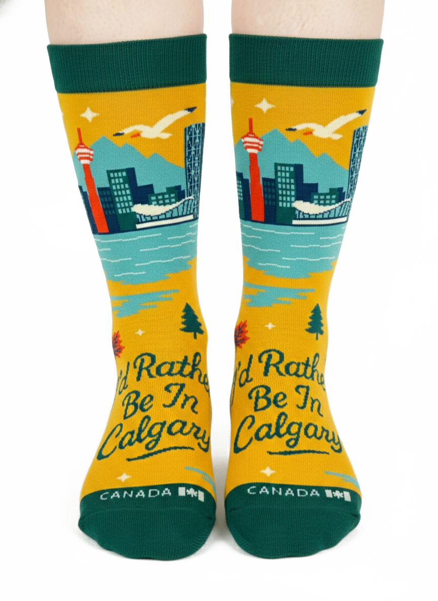 Inspired by the spirit of the Canadian Rockies, these “I’d Rather Be in Banff” graphic crew socks capture the feeling of escaping into nature. The design features layered mountain landscapes, wildlife silhouettes, and warm sunset tones, reflecting the relaxed and adventurous lifestyle associated with Banff.