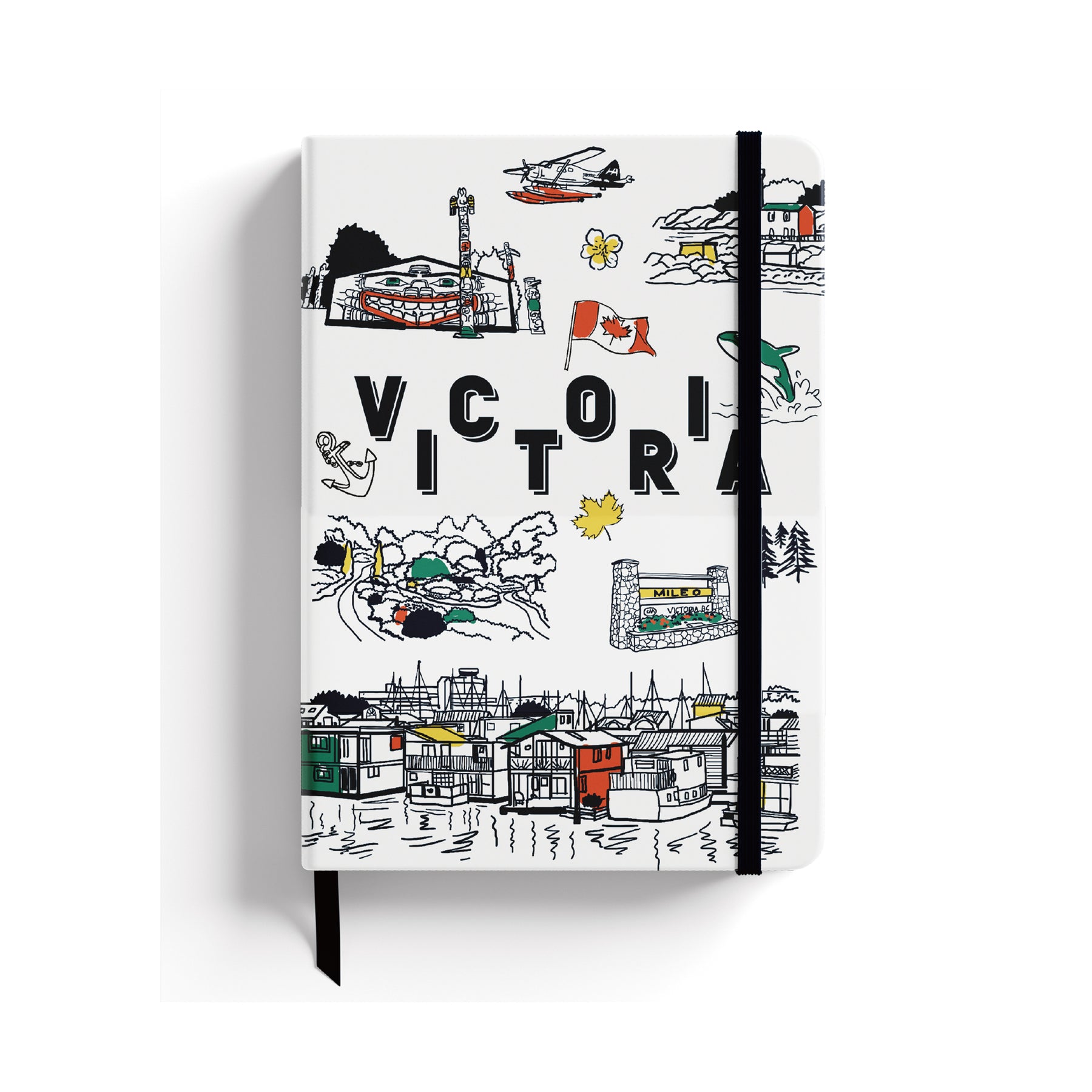 This illustrated notebook captures the lively spirit of Victoria through playful hand-drawn artwork featuring iconic landmarks, coastal scenery, wildlife, and cultural elements. The cover showcases expressive illustrations of the Parliament Buildings, Fisherman’s Wharf, seaplanes, maple leaves, totem poles, and waterfront houses—arranged around bold “Victoria – British Columbia” lettering for a clean and modern look.