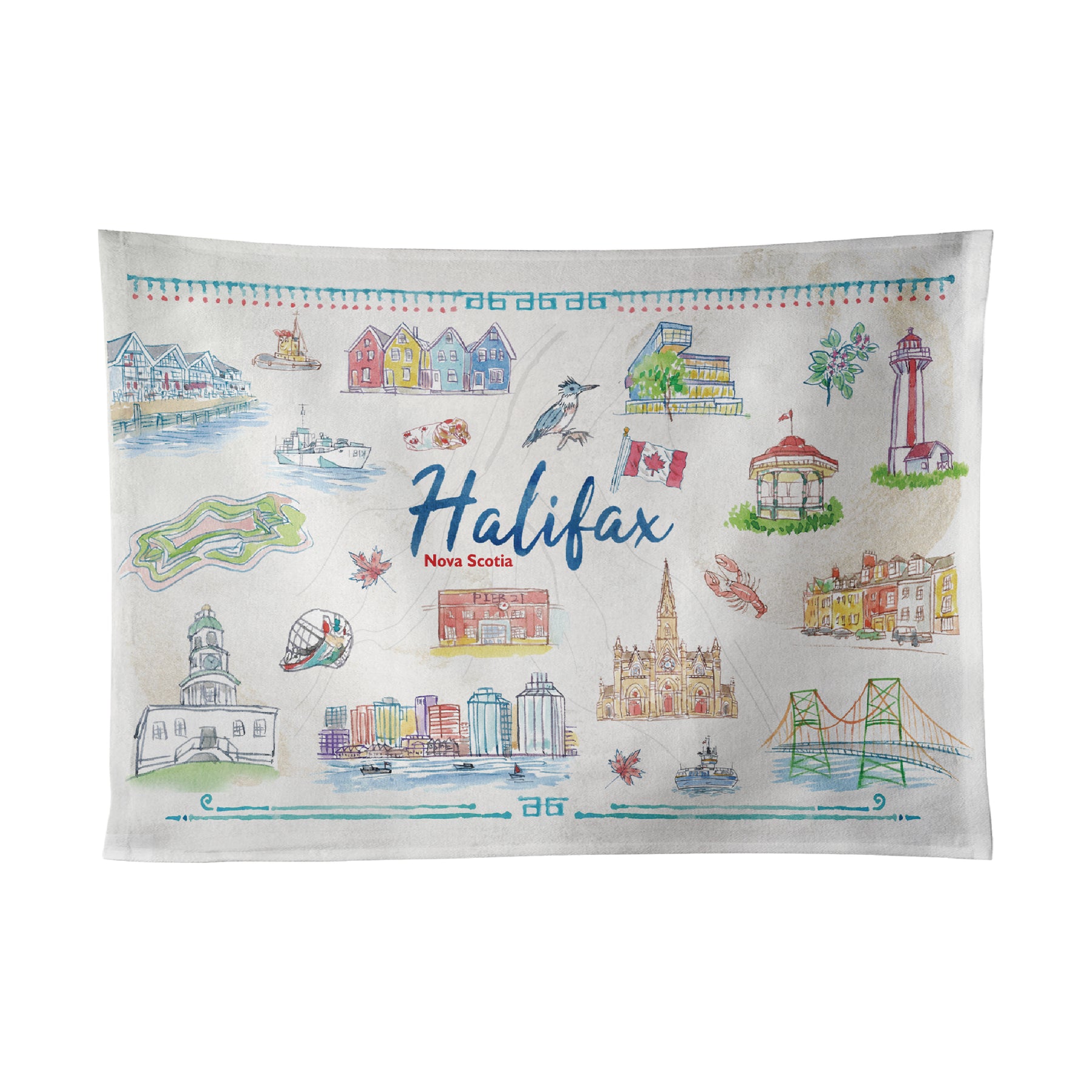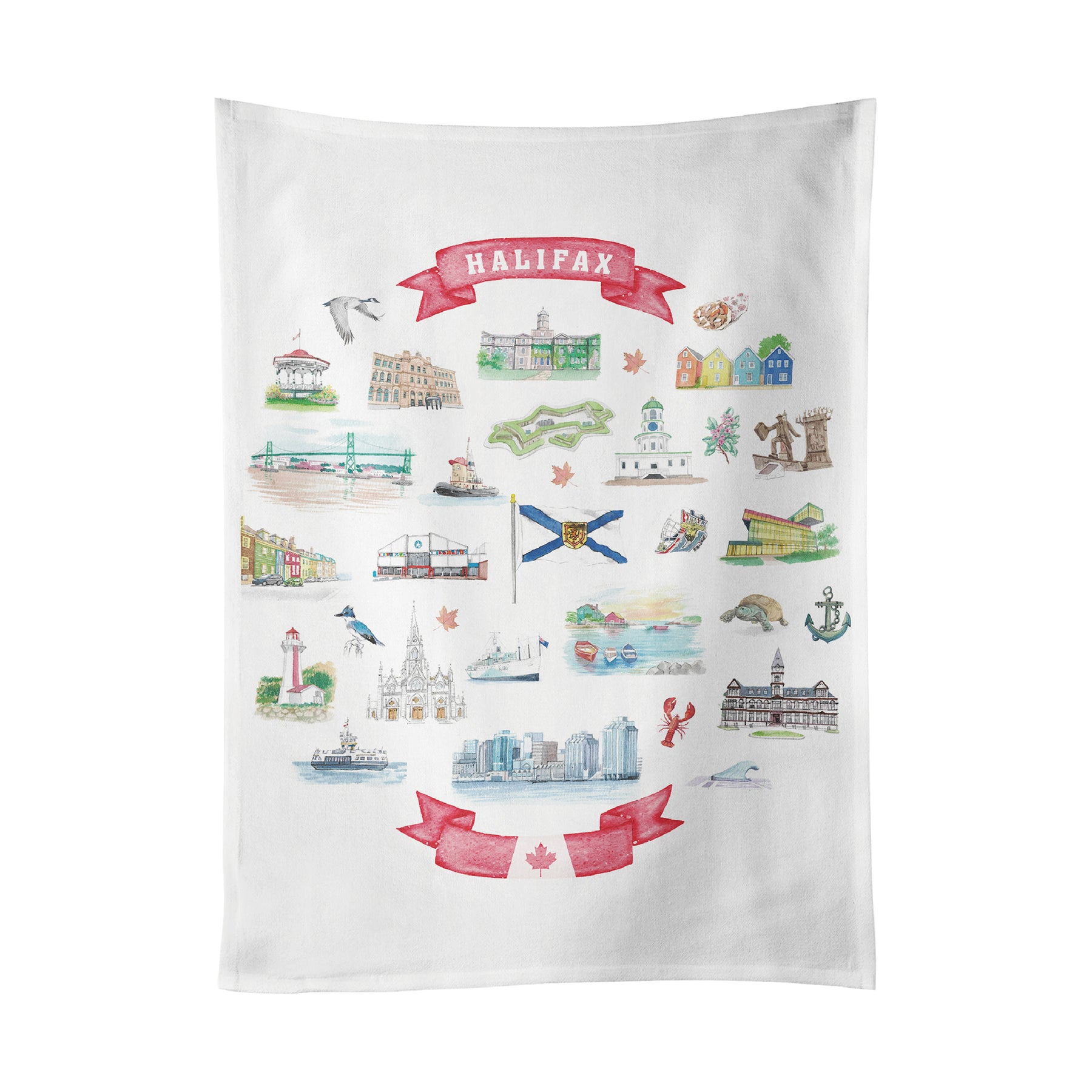 his illustrated tea towel showcases a charming collection of Halifax’s most iconic scenes—Peggy’s Cove Lighthouse, Citadel Hill, the harbourfront skyline, colourful local houses, maritime wildlife, and the Nova Scotia flag. Each element is delicately hand-painted, forming a cohesive composition that celebrates the city’s coastal heritage and artistic character.