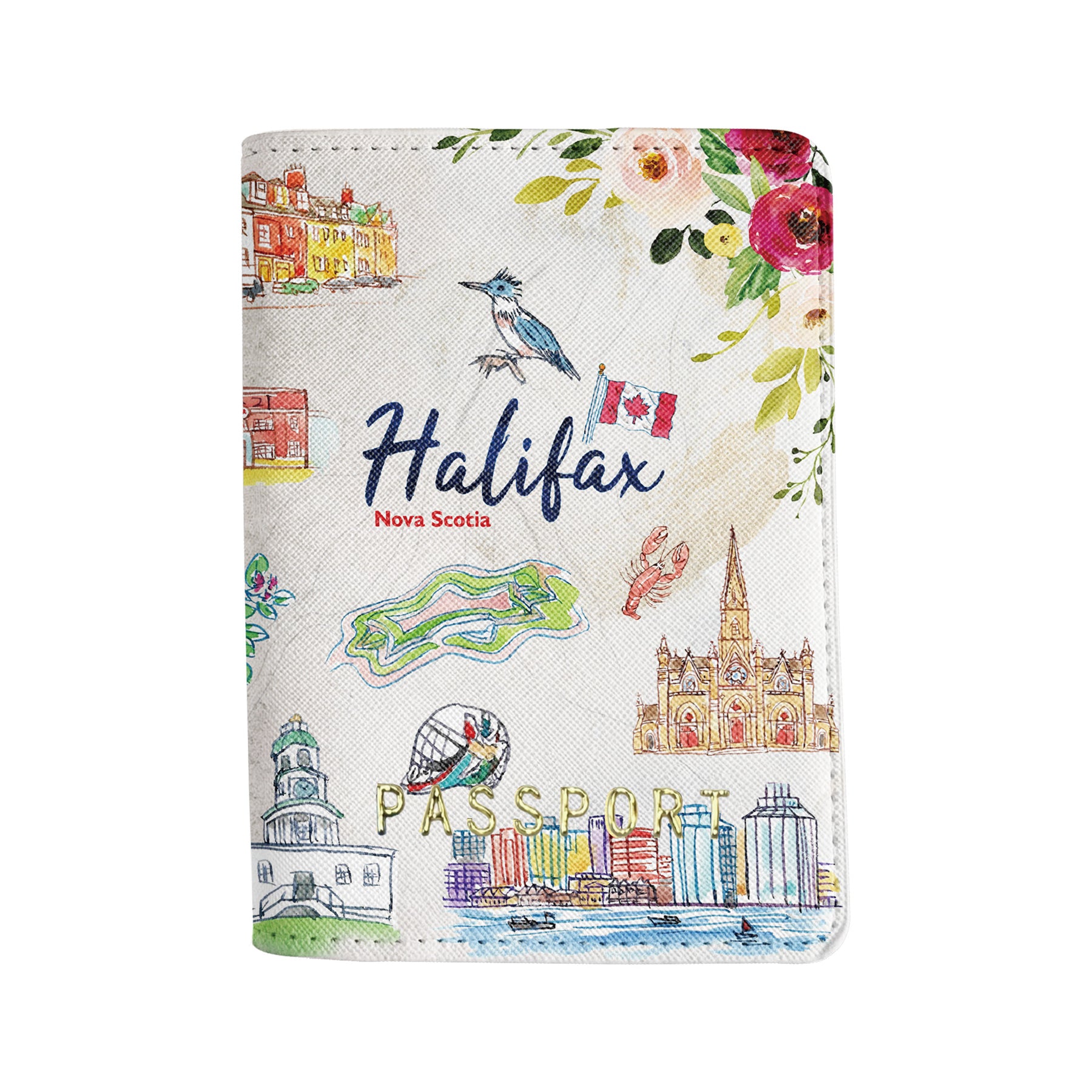 This illustrated passport cover captures the charm of Halifax through a cheerful collection of hand-drawn landmarks—harbour bridges, Peggy’s Cove lighthouse, colourful houses, Dalhousie University, waterfront scenes, local icons, and the signature “Halifax Nova Scotia” lettering. The watercolor-style artwork wraps around the cover, creating a bright and artistic tribute to Canada’s East Coast.
