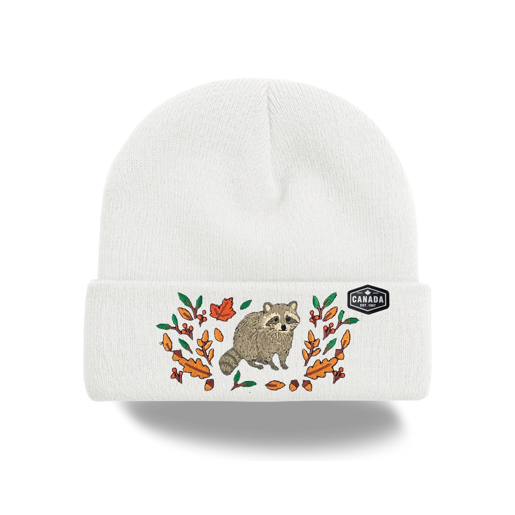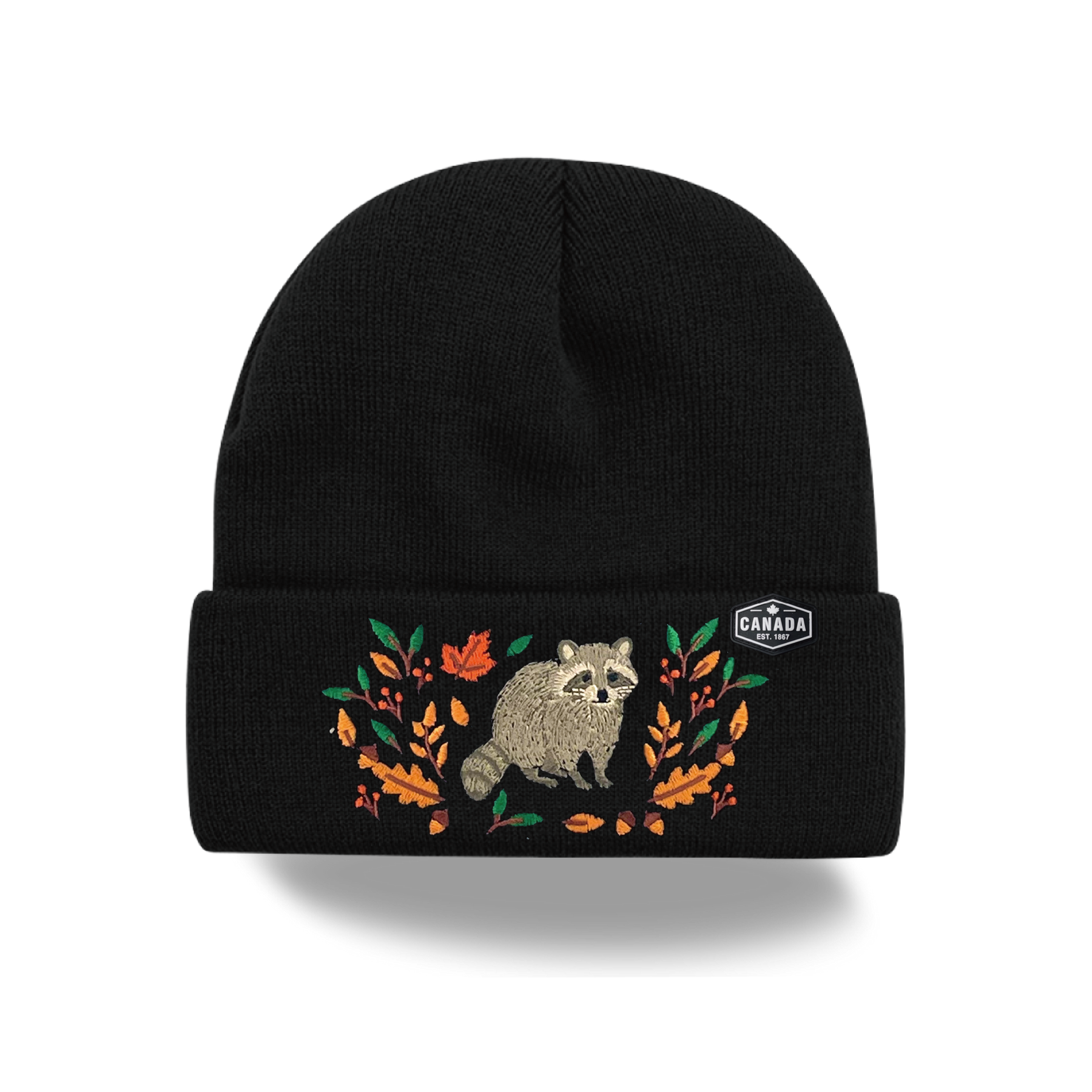 Canada Raccoon Embroidered Knit Toque Winter Hat Woodland Maple Leaf Outdoor Style