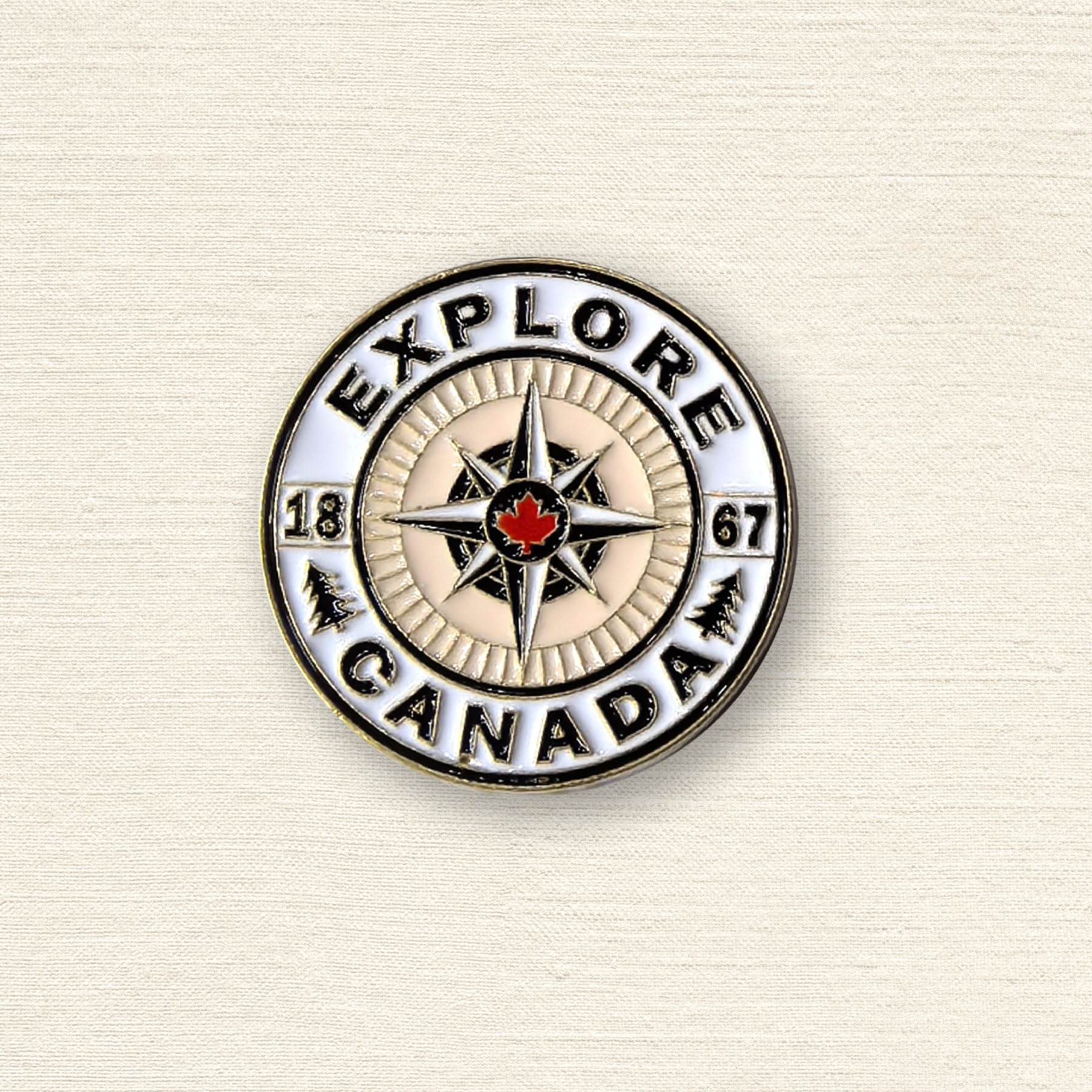 This elegant enamel pin features a classic compass rose with a maple leaf at its center, encircled by the bold words “Explore Canada.” Rendered in gold and white with fine detailing, it symbolizes adventure, national pride, and the enduring spirit of exploration rooted in Canadian heritage—highlighted by the founding year 1867 and evergreen icons on each side.