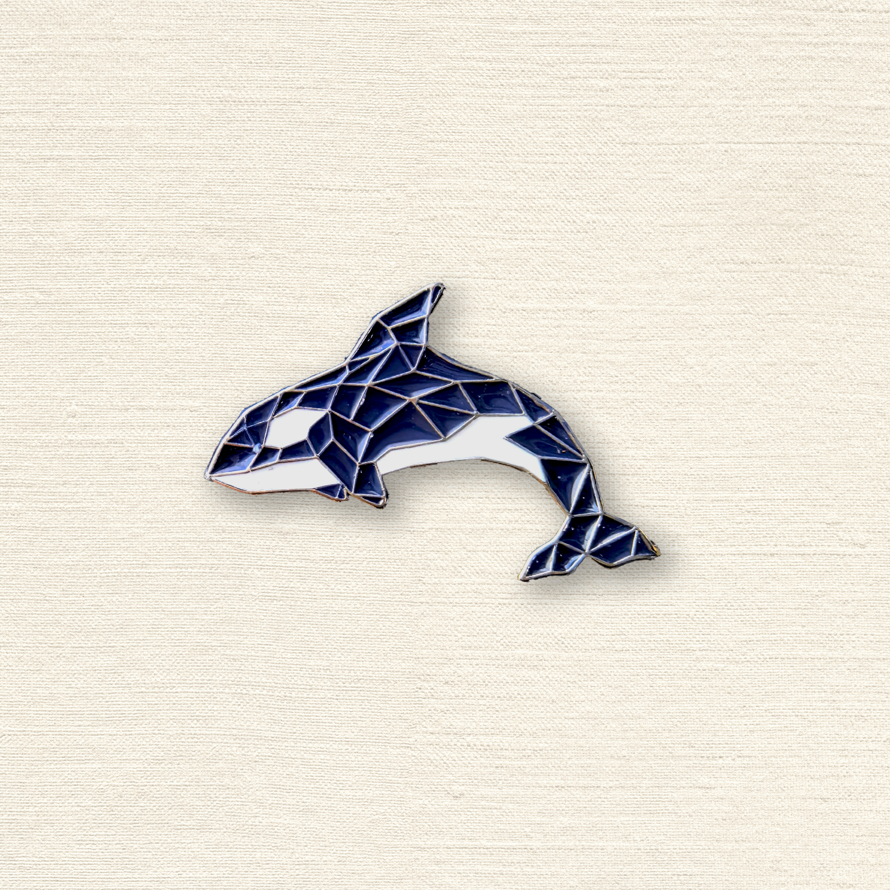This enamel pin reimagines the majestic orca in a refined geometric design, blending nature’s grace with contemporary artistry. The clean, angular lines form a sleek silhouette, symbolizing power, freedom, and deep connection to the ocean. The navy and white palette pays tribute to the orca’s natural beauty, while the faceted style evokes a sense of strength and harmony—making this a meaningful emblem for nature lovers and design appreciators alike.