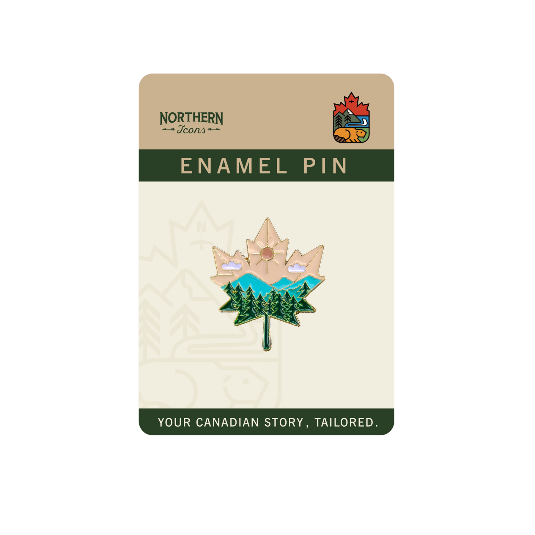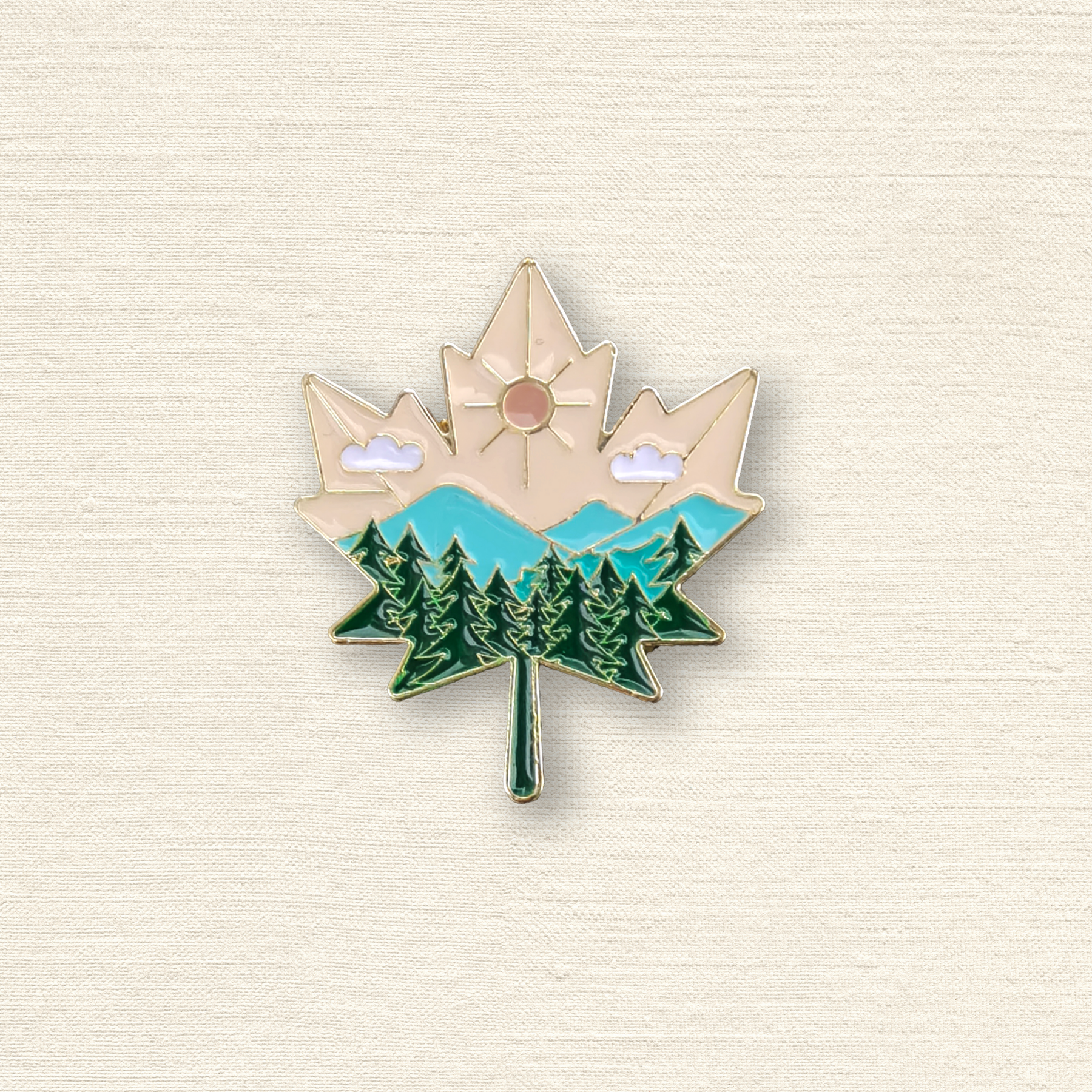 Featuring a clean-lined maple leaf filled with stylized mountains, evergreen forests, and a radiant sun, this enamel pin distills the essence of Canadian wilderness into a minimalist yet meaningful form. It symbolizes natural beauty, tranquility, and national pride—ideal for nature lovers and design enthusiasts alike.