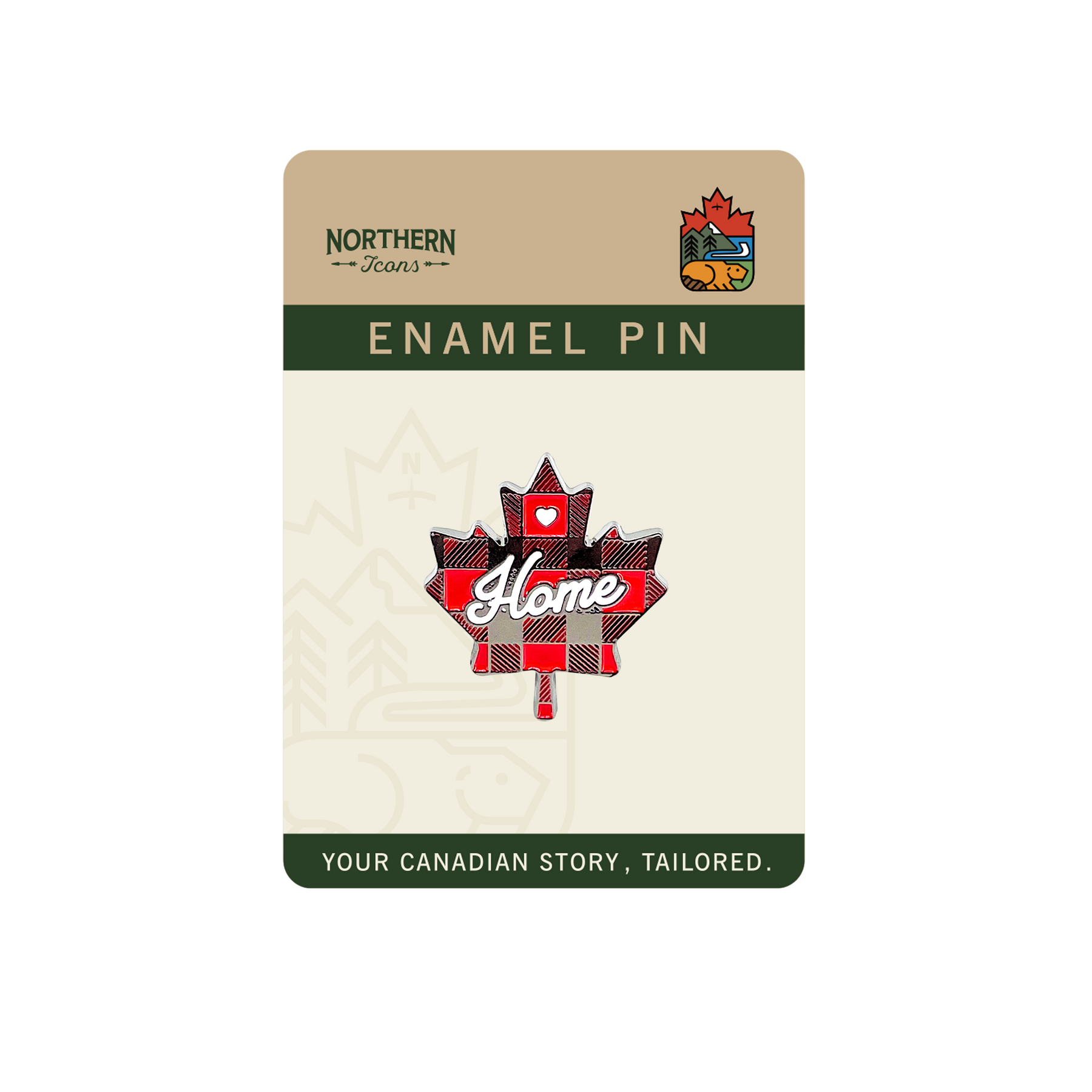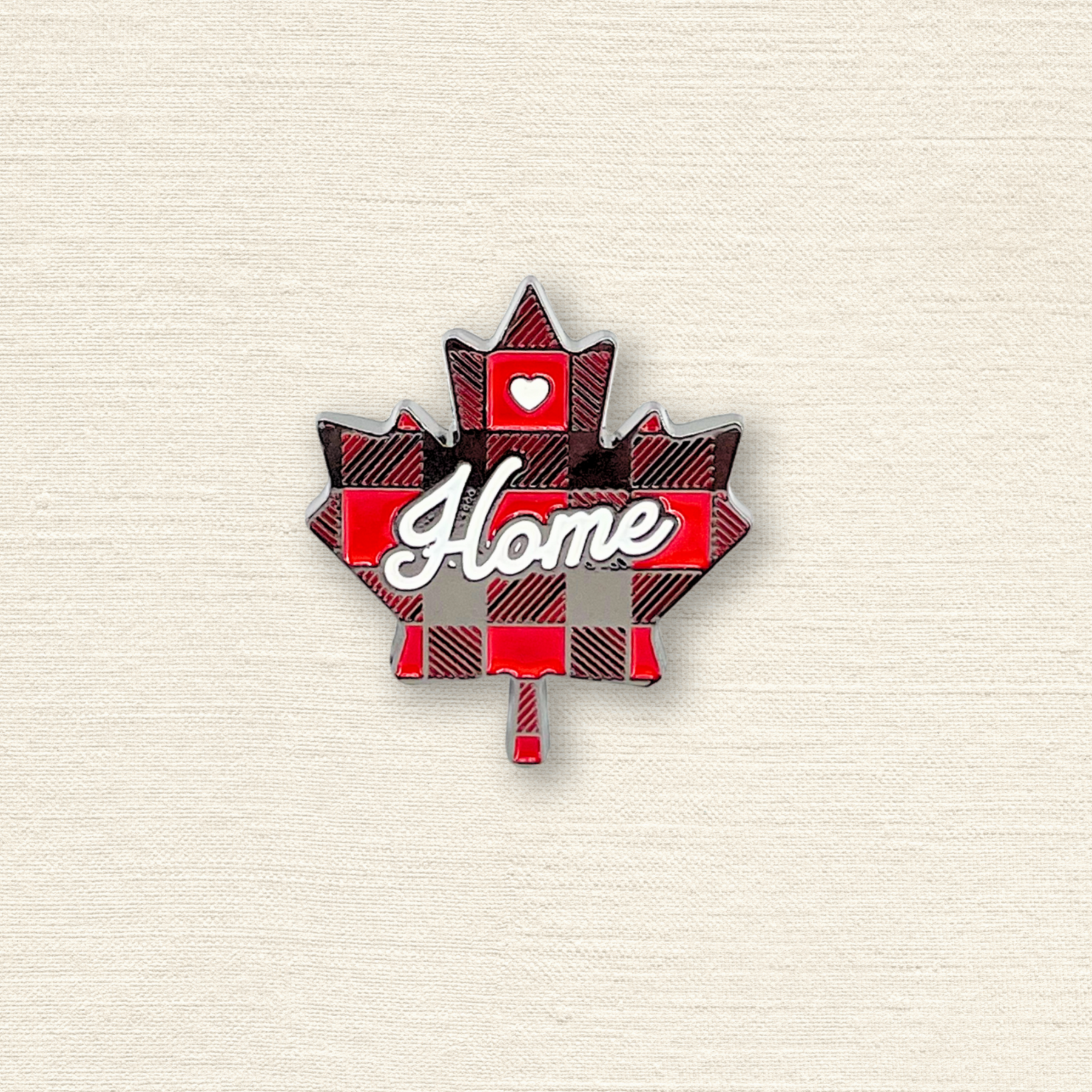 This pin features a classic red-and-black buffalo plaid pattern shaped into a maple leaf—the most iconic symbol of Canada. The word “Home” in elegant script, paired with a small heart detail, conveys warmth, belonging, and national pride. It’s a heartfelt tribute to the feeling of being Canadian, wherever you are.