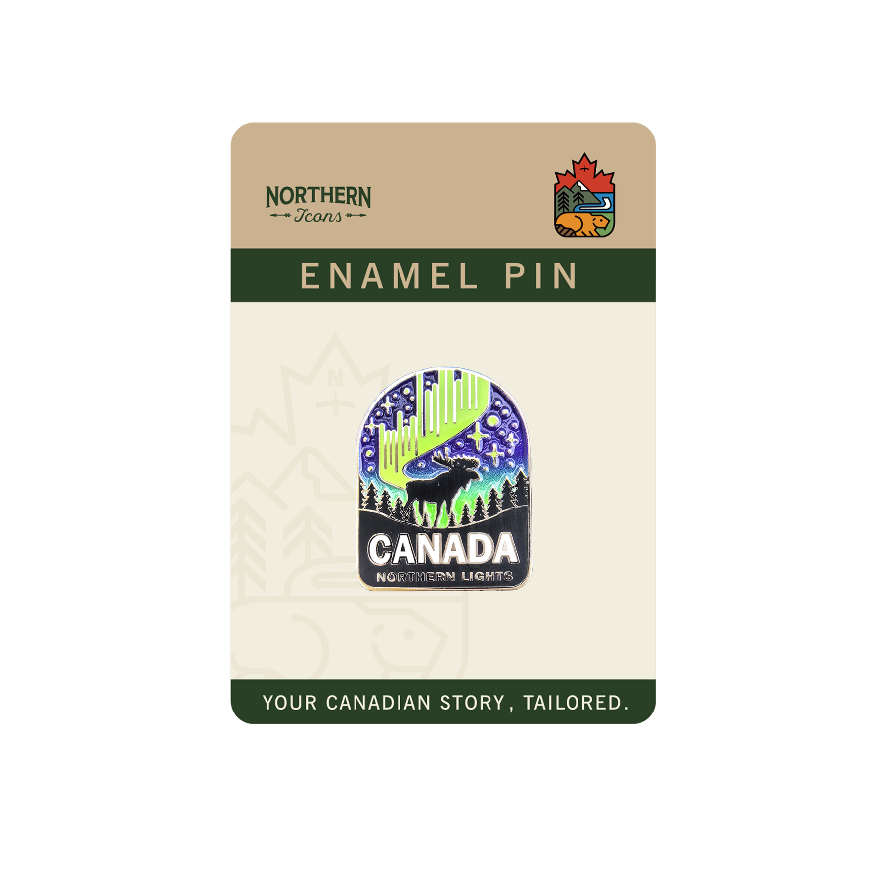 Regular price $13.99Step into the enchanted night skies of Canada with this striking enamel pin, where a majestic moose stands silhouetted beneath a dazzling display of green aurora borealis. Surrounded by evergreens and twinkling stars, this bold design captures the quiet power of nature, the mystery of the north, and the timeless magic of Canada's wilderness. The upward curve of the lights and glowing elements symbolize awe, serenity, and the deep-rooted connection between land, sky, and wildlife.