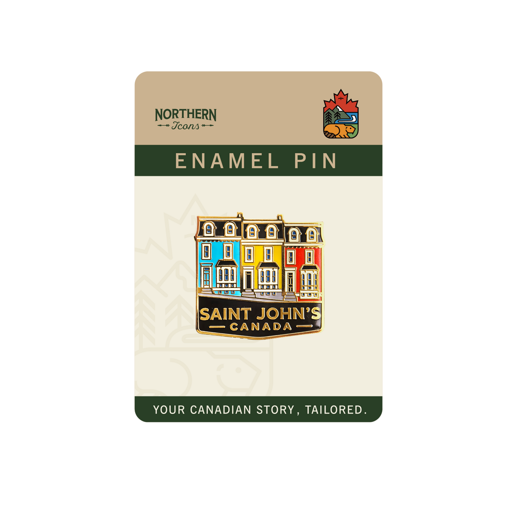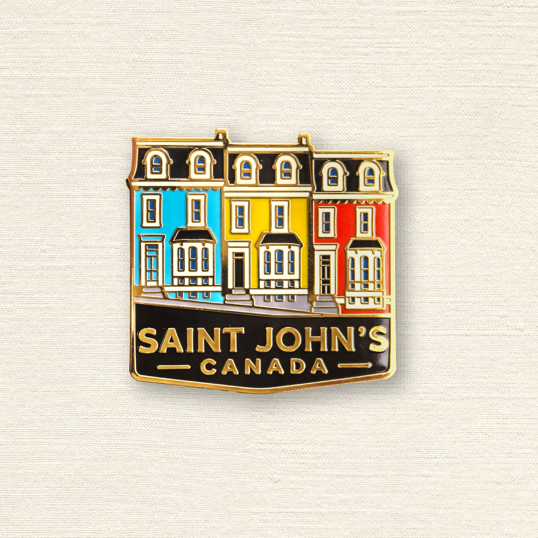 Each detail is carefully outlined in gold metal, giving the pin a refined yet playful finish. Designed for travelers, collectors, and architecture lovers alike, it captures the soul of Saint John’s — a place where history meets color. Pin it to your jacket, hat, or backpack to carry a piece of Atlantic Canada’s charm wherever you go.