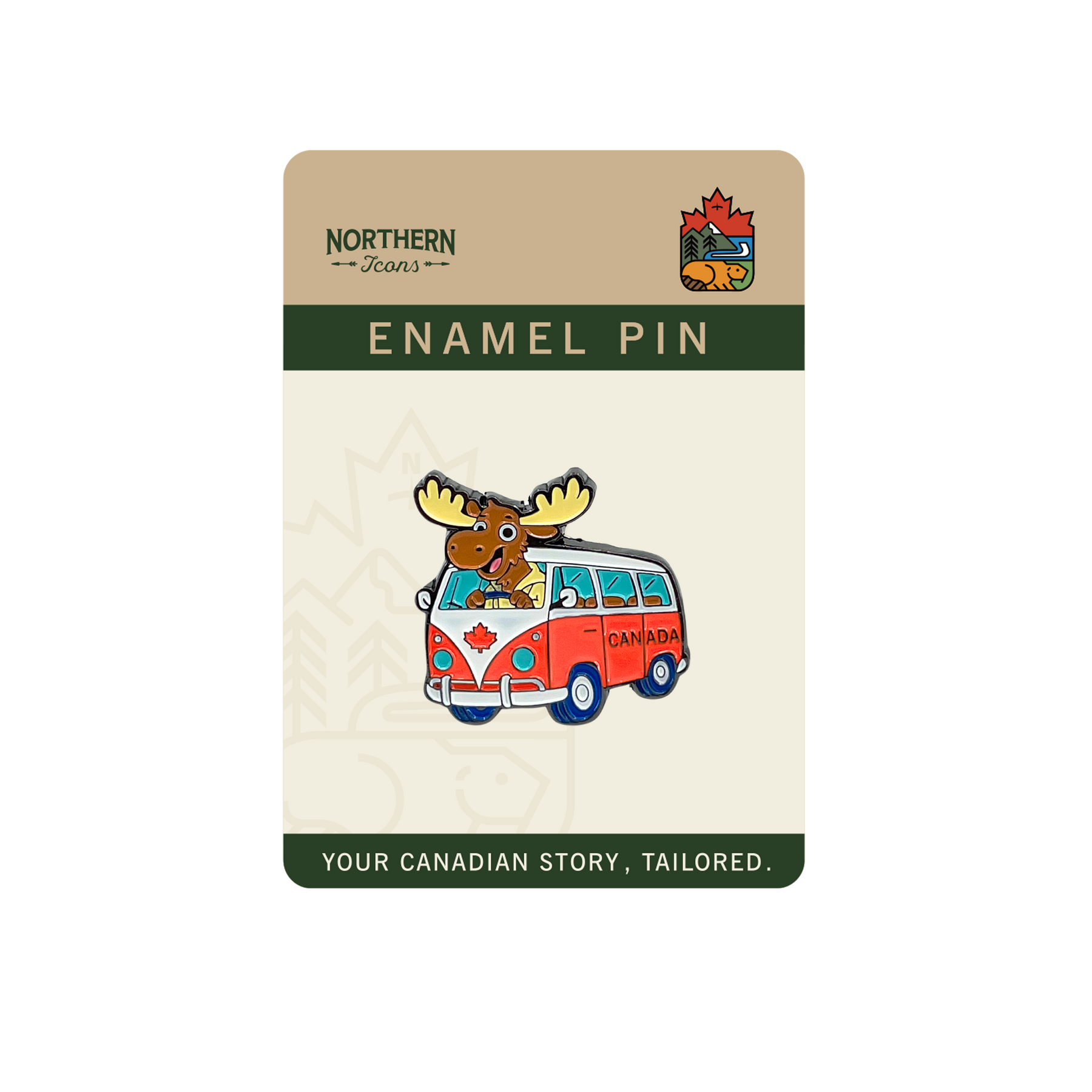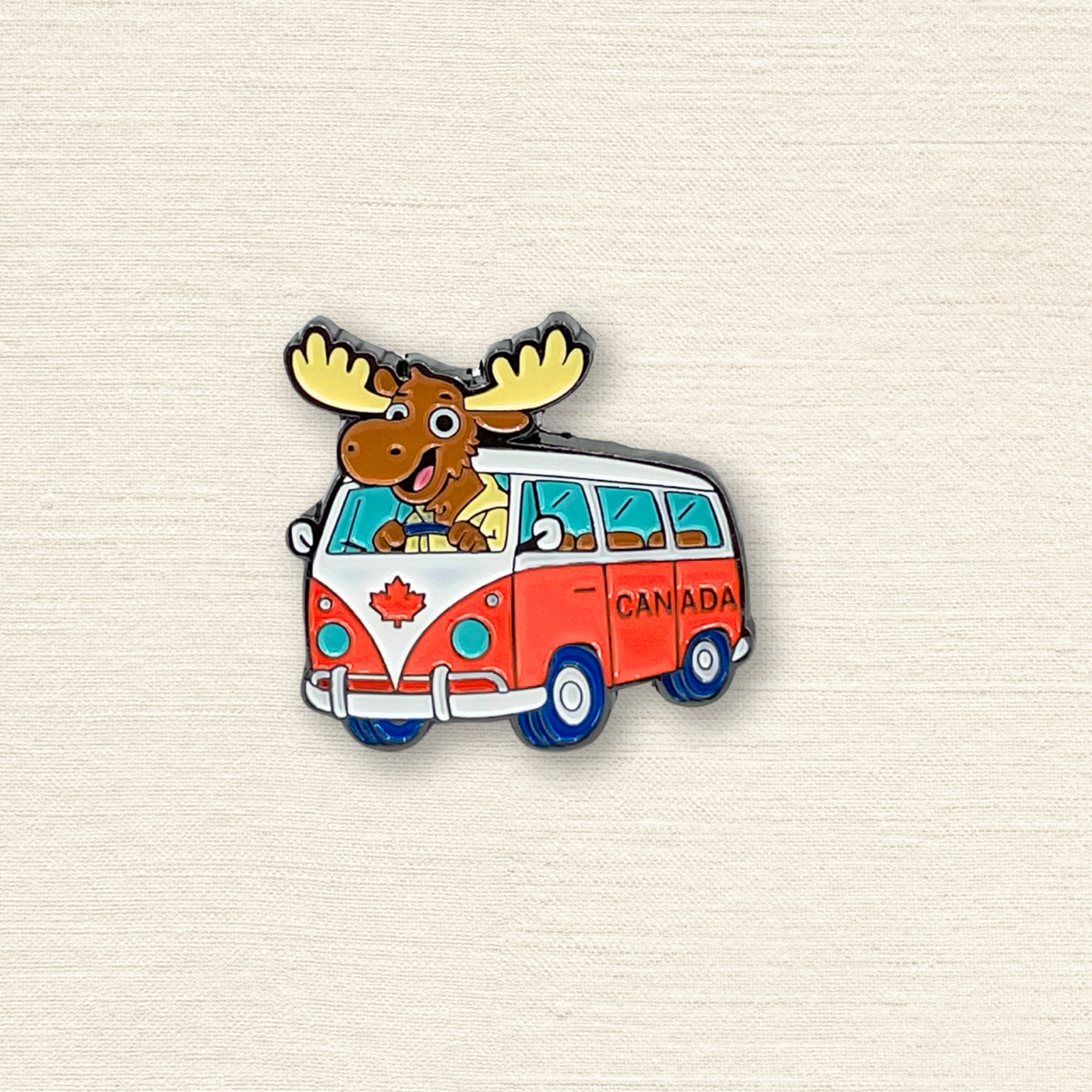 This enamel pin features an enthusiastic cartoon moose behind the wheel of a red-and-white vintage camper van, proudly marked with the word "CANADA" and a maple leaf on the front. The bright colors and cheerful design evoke a spirit of exploration, freedom, and national pride, capturing the whimsical side of Canadian adventure.