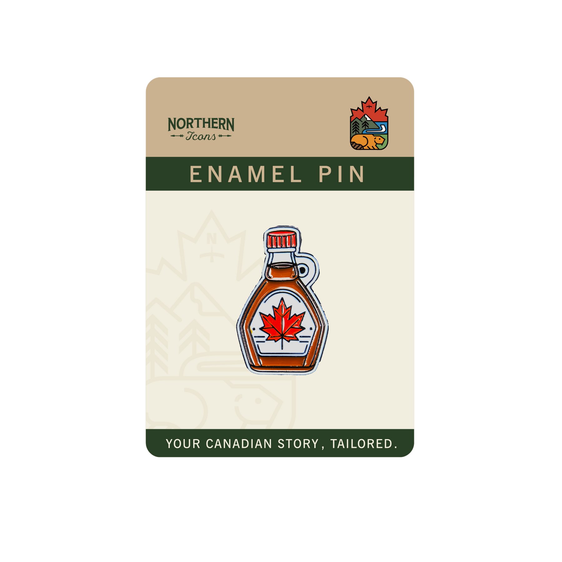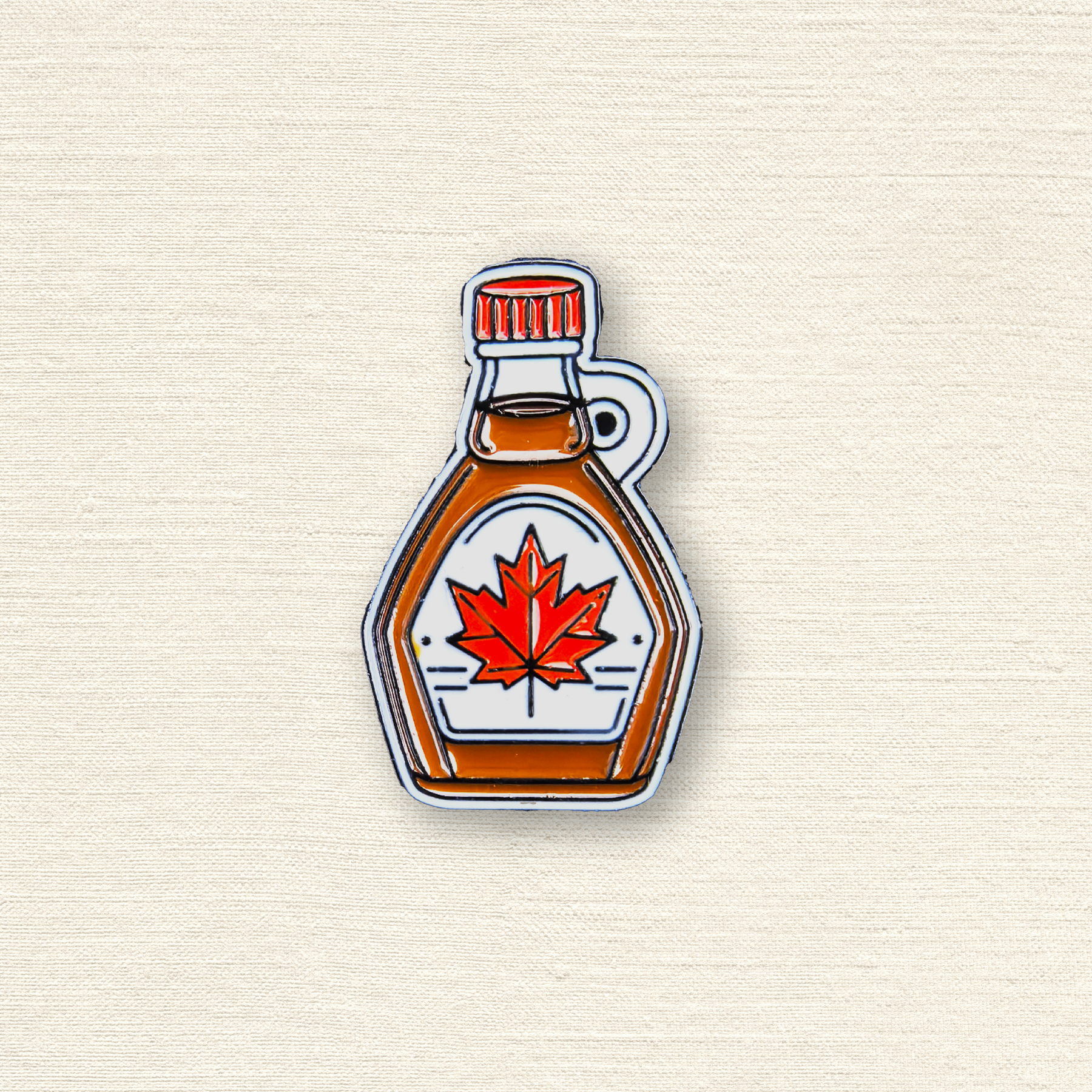 This enamel pin features a charming maple syrup bottle design, highlighted by a bold red maple leaf—a symbol of Canadian identity and warmth. The clean lines and playful proportions evoke nostalgic feelings of homemade breakfasts and cozy moments, while the bottle’s familiar silhouette offers both visual appeal and cultural meaning. It’s a celebration of sweetness, tradition, and national pride.