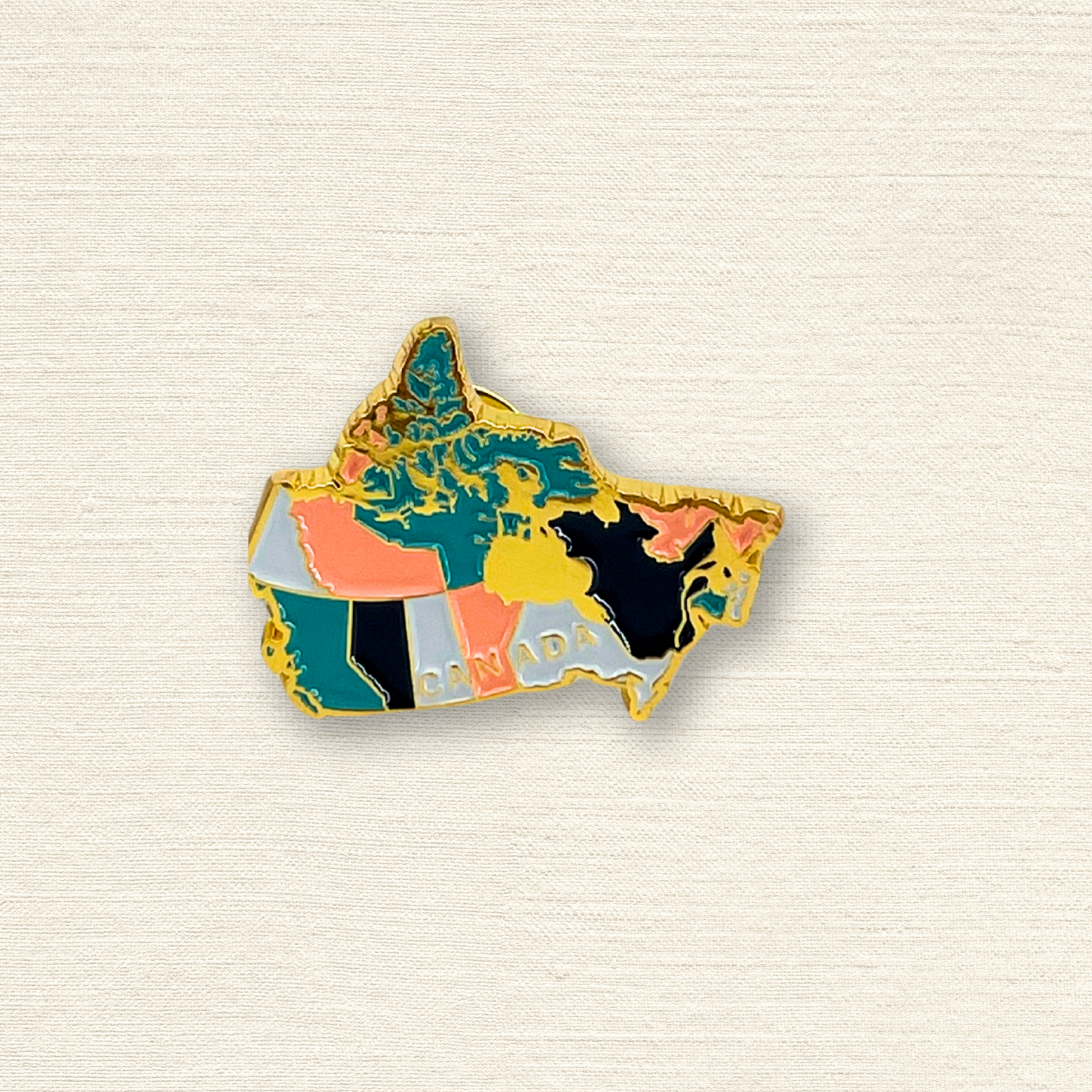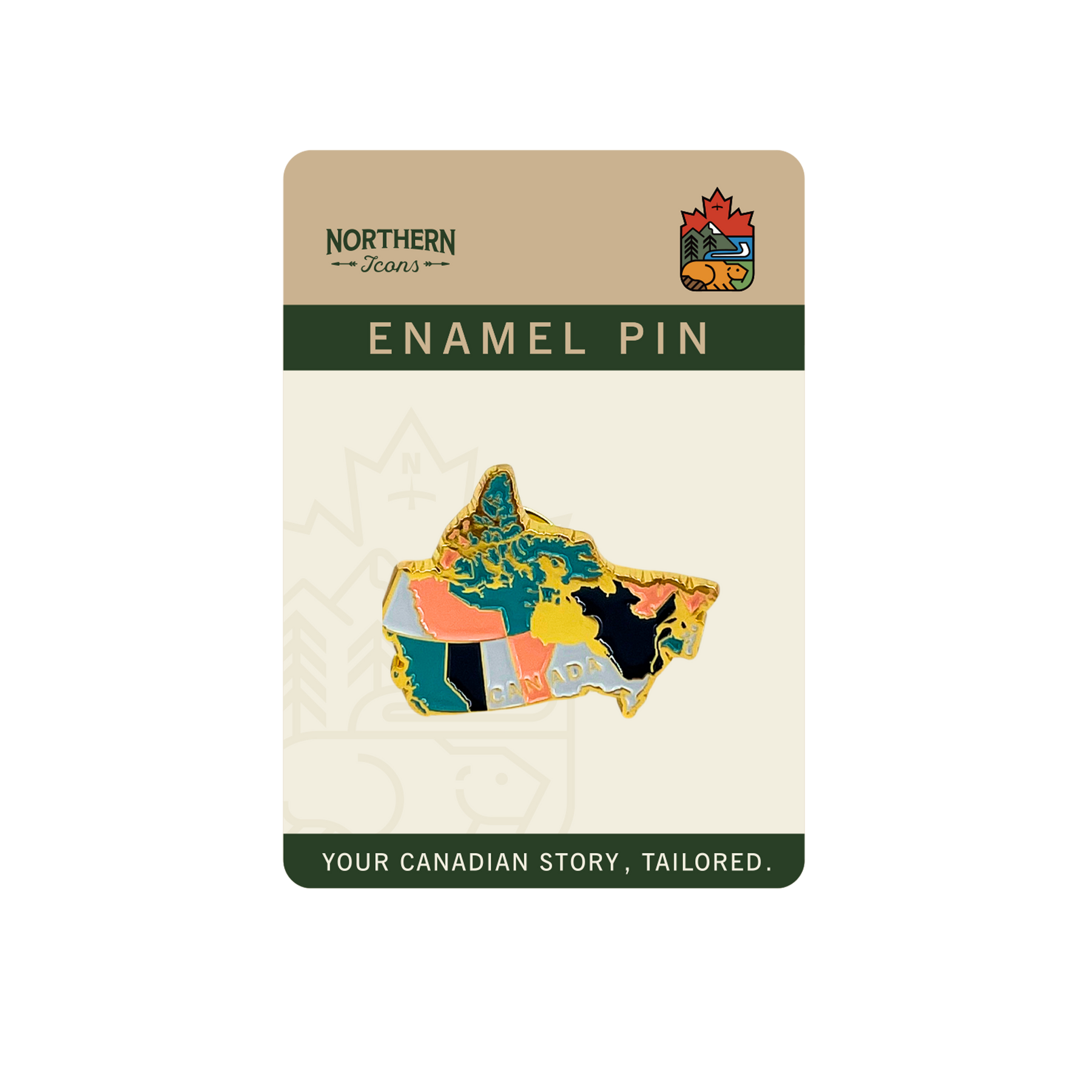 This enamel pin features a stylized map of Canada, rendered in bold color blocks to highlight each province and territory. Clean outlines and polished gold accents give it a modern look, while the “CANADA” label at the base anchors the design in national pride. The color segmentation celebrates unity through diversity—a visual reminder of Canada's vast geography and rich regional cultures.