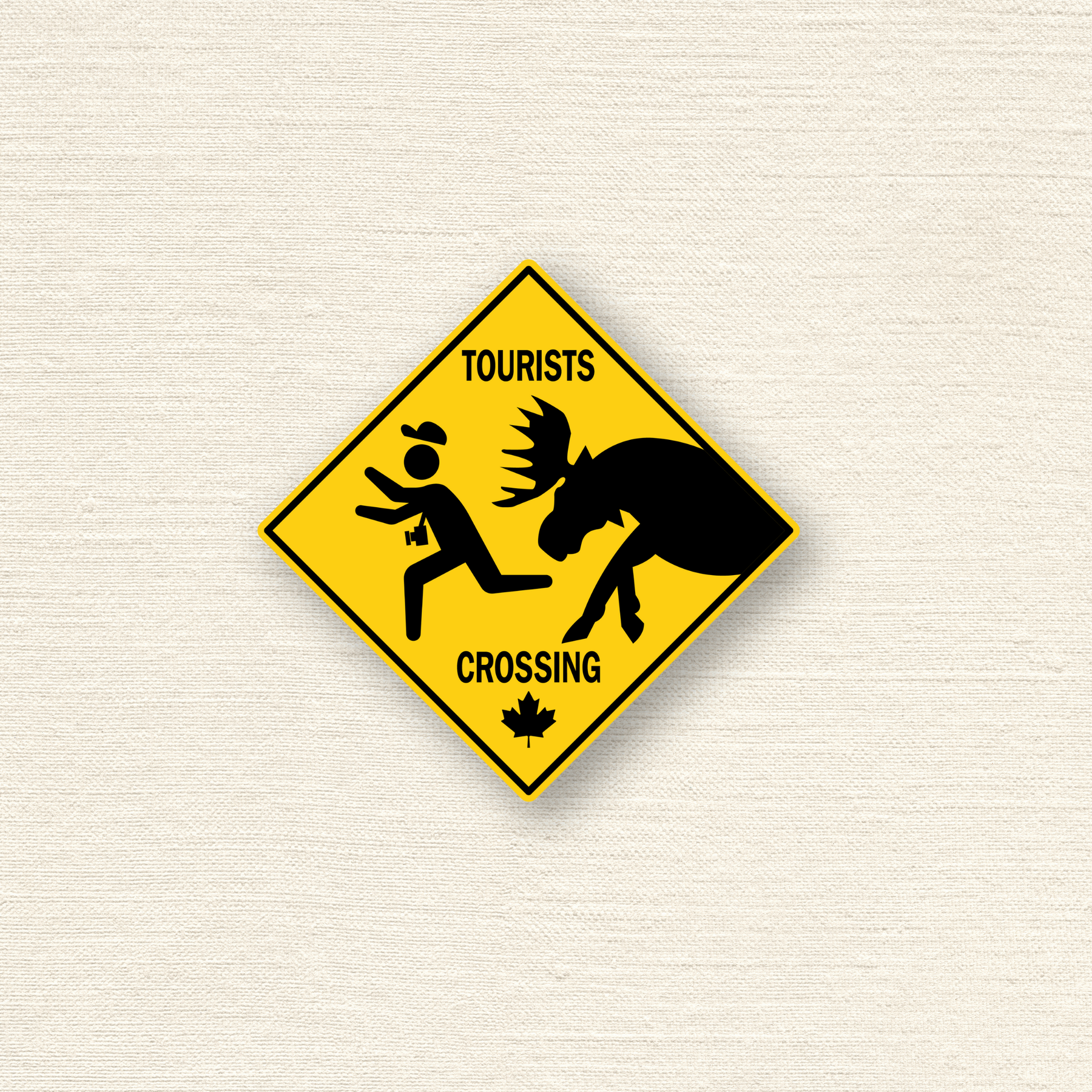 • Humorous Design: Inspired by Canadian road signs, featuring a moose and tourist in a fun, bold graphic.