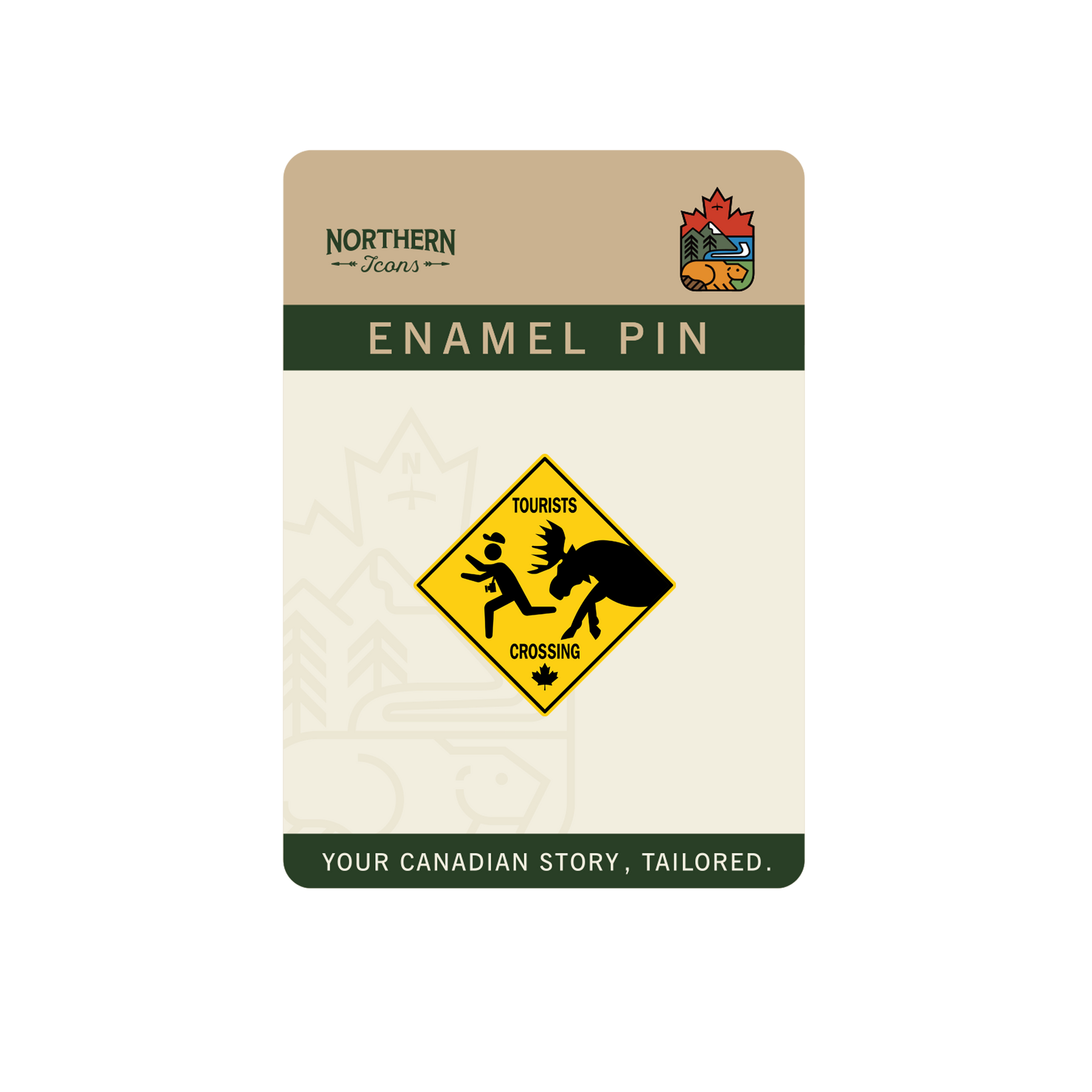 Bring a touch of Canadian humor to your collection with the Tourists Crossing Enamel Pin, a playful twist on classic road signs. Featuring a bold yellow diamond design with a moose chasing a running tourist, this pin captures the fun, wild spirit of Canada’s wilderness — where adventure and laughter often go hand in hand.