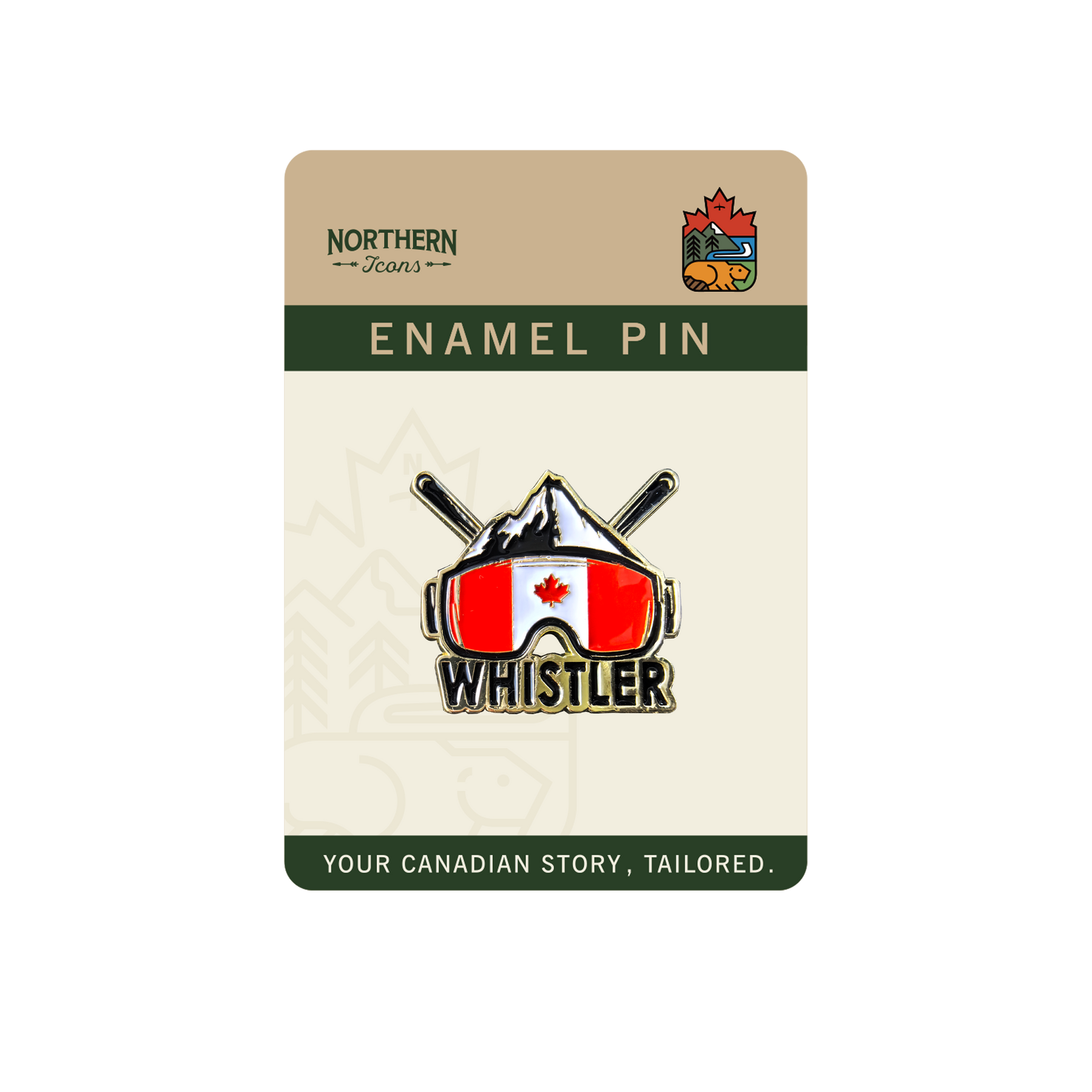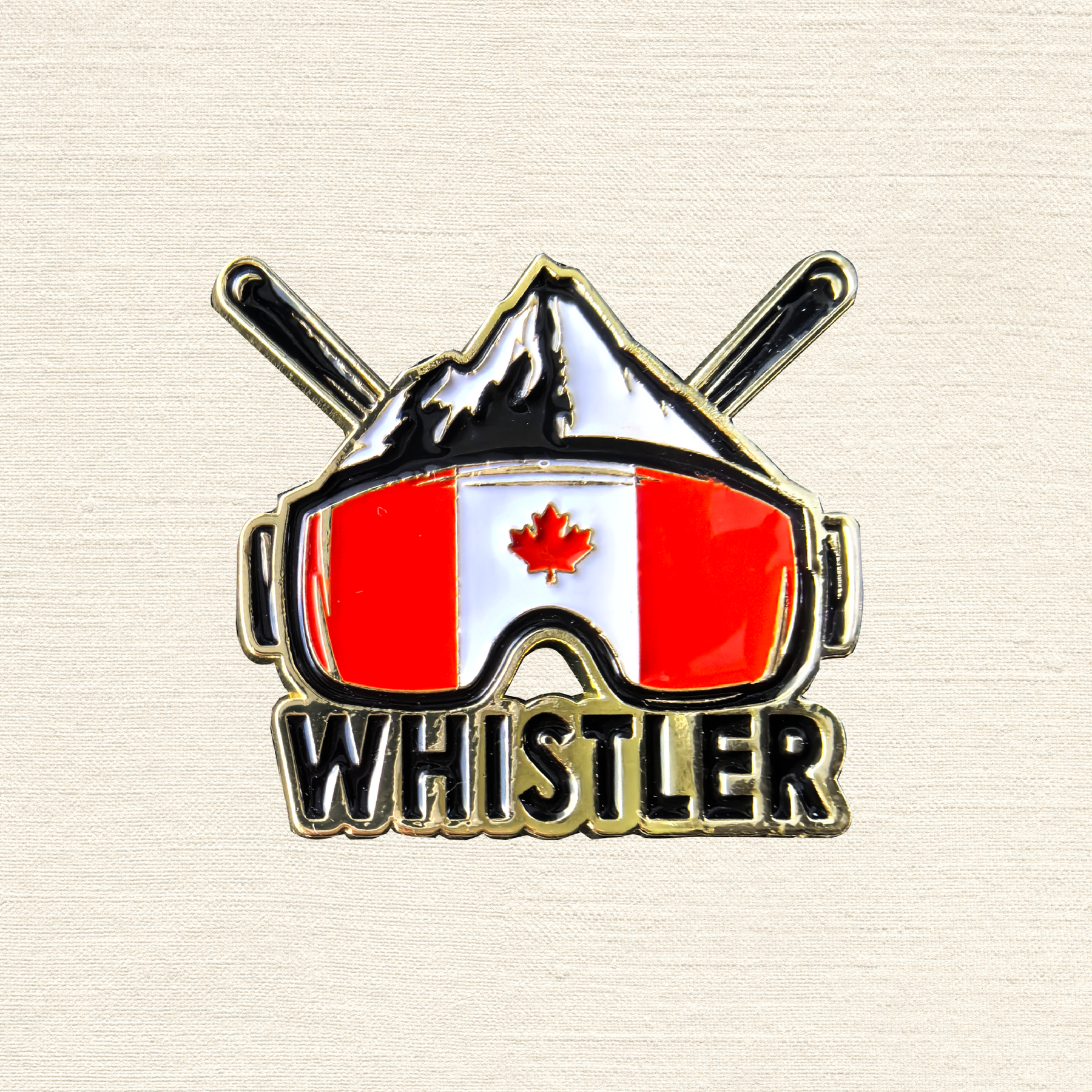 This enamel pin captures the spirit of Whistler, Canada’s iconic winter paradise. Featuring ski goggles reflecting the Canadian flag, flanked by snow-capped mountains and crossed ski poles, the design symbolizes adventure, national pride, and love for the outdoors. Bold, clean lines and striking colors make it a standout piece with emotional and aesthetic appeal.