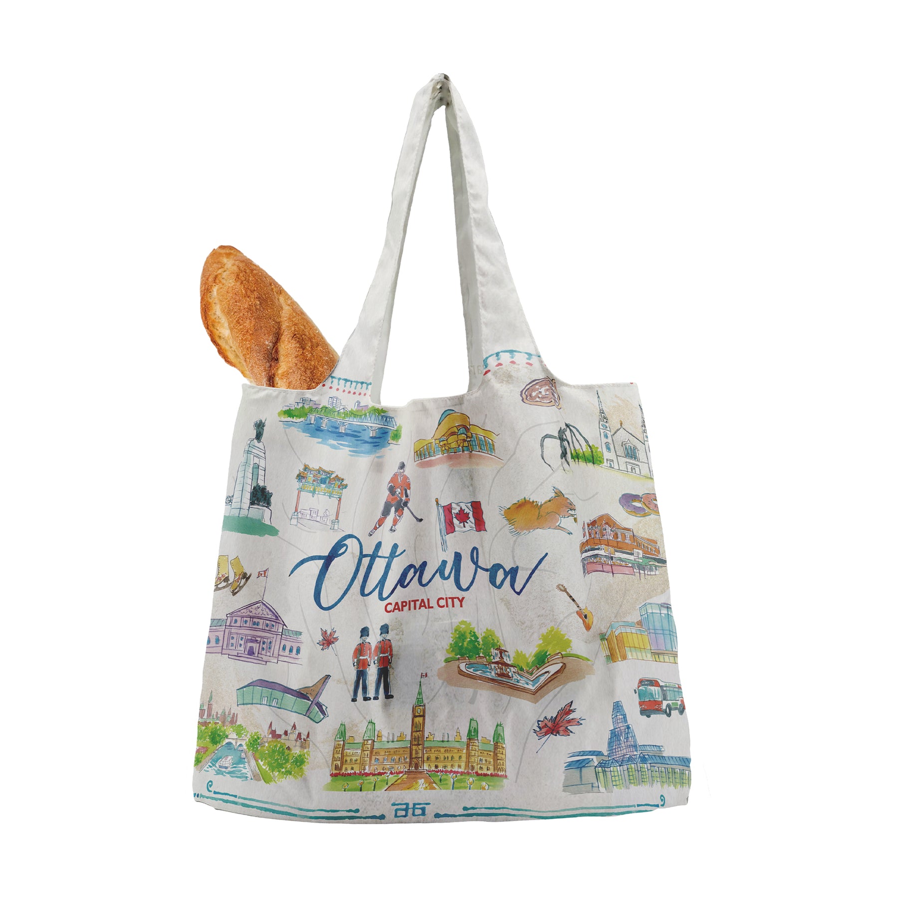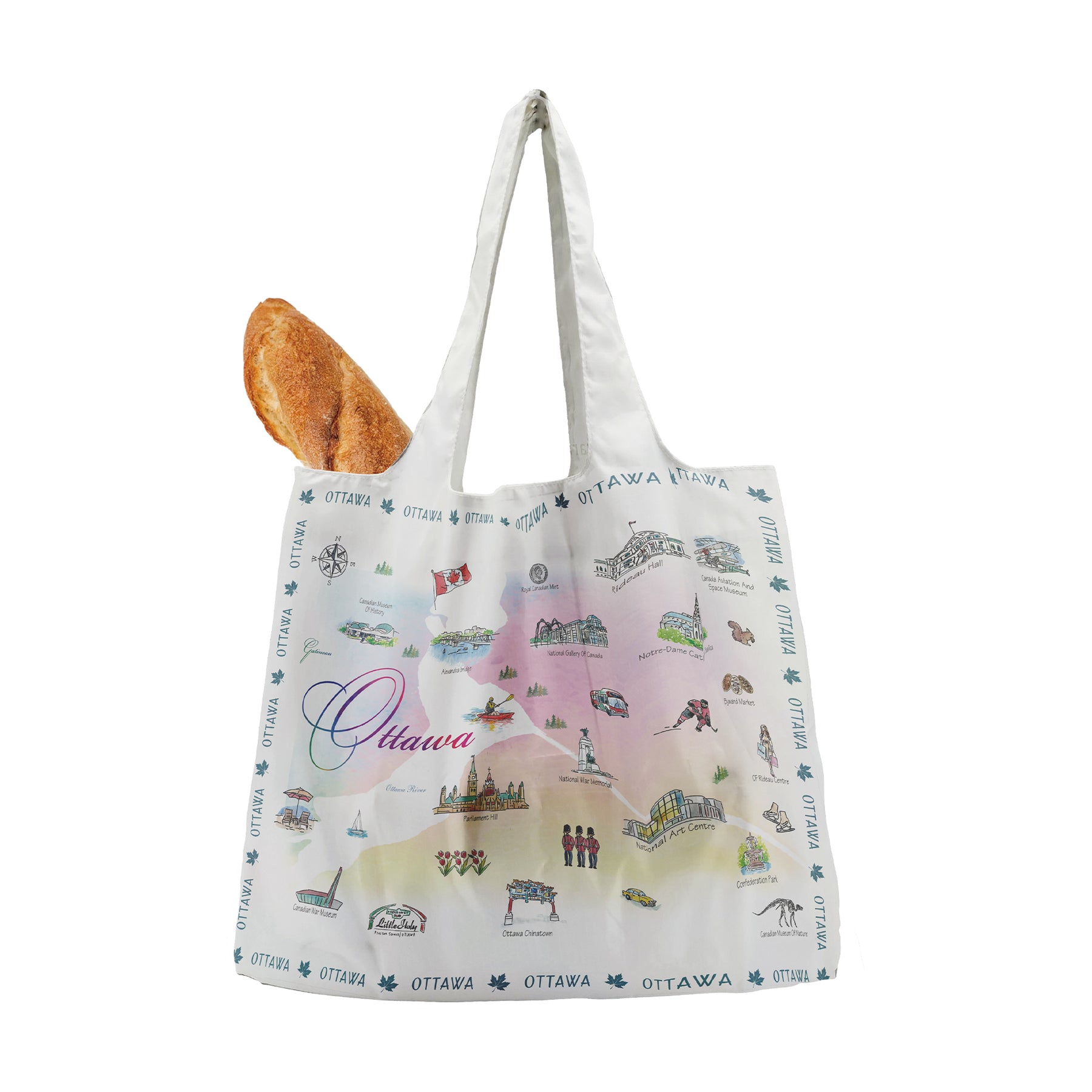 This foldable reusable bag features a vibrant illustration of Ottawa, showcasing iconic landmarks and cultural highlights in a cheerful watercolor style. The artwork includes Parliament Hill, the Rideau Canal, Canadian Museum of History, National Gallery, skating traditions, and other well-loved city scenes. Soft colors and hand-drawn textures create a travel-inspired aesthetic that captures the welcoming spirit of Canada’s capital city.