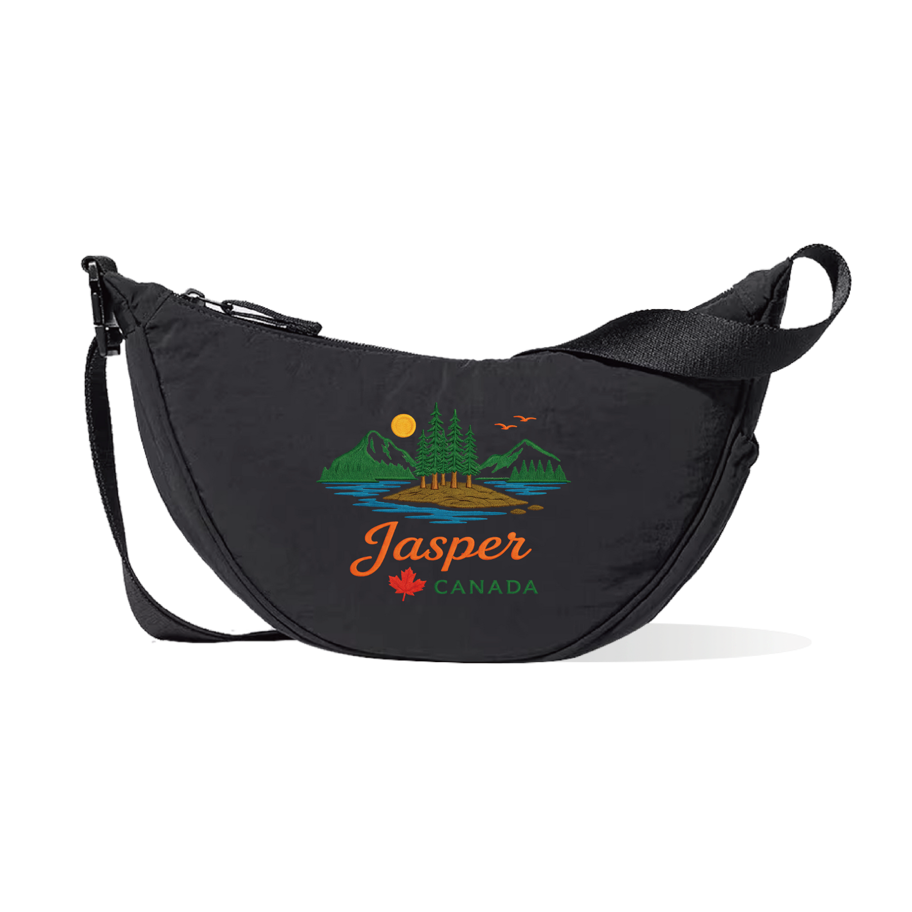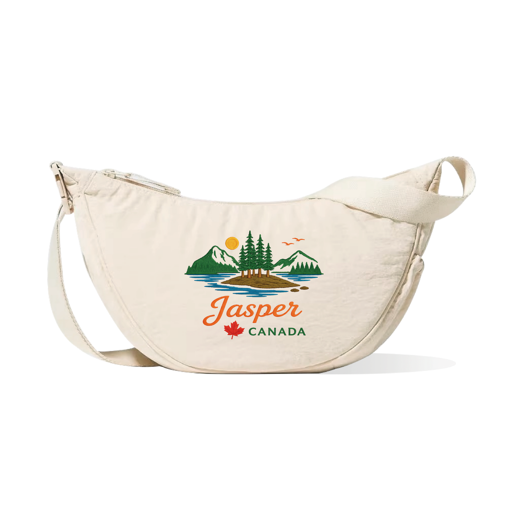 The Jasper Mountain Lake Scenic Sling Bag is inspired by the peaceful wilderness and breathtaking landscapes of Jasper in the Canadian Rockies. The design features a small forested island surrounded by clear alpine water, with towering mountain peaks rising in the distance and warm sunlight illuminating the sky. This tranquil scene captures the essence of Jasper’s vast natural beauty.