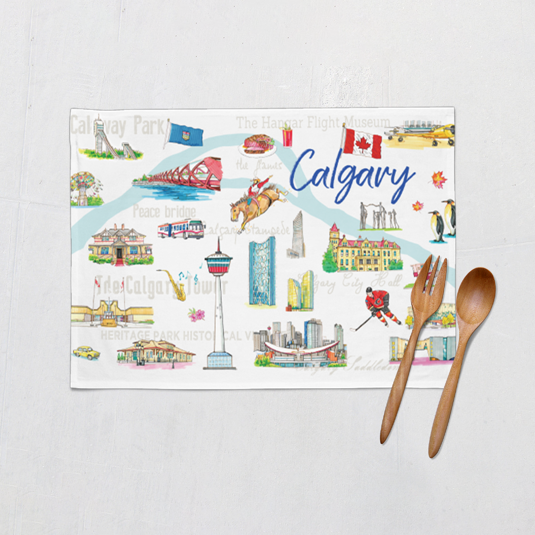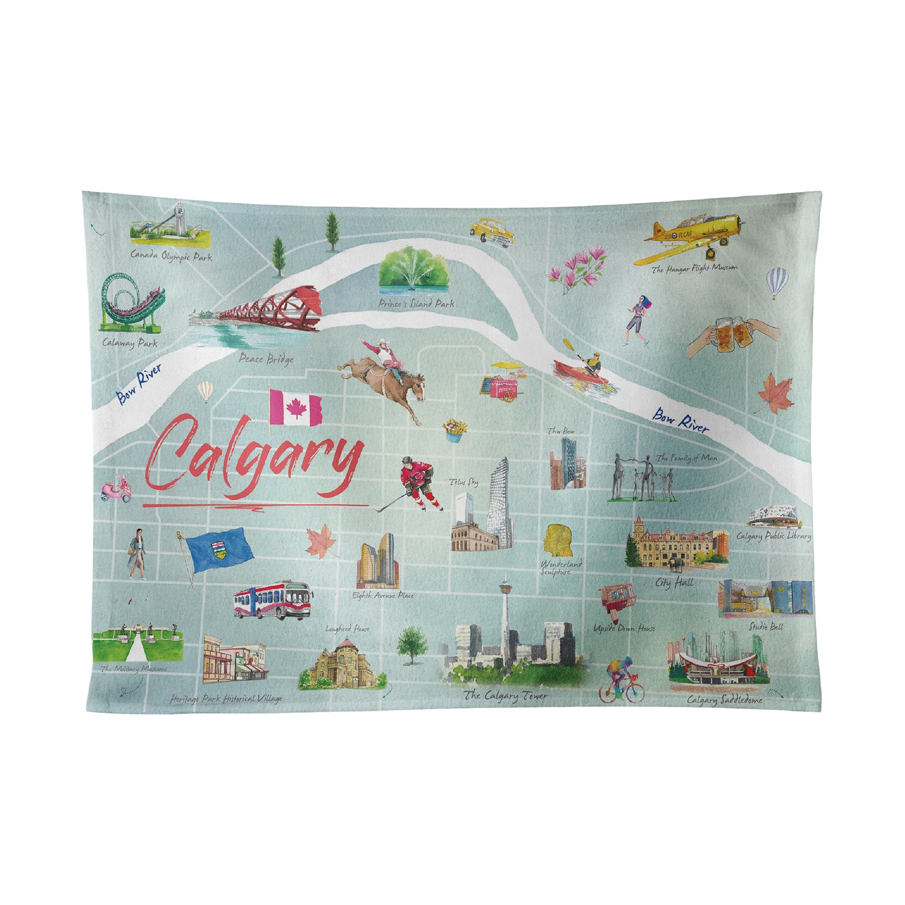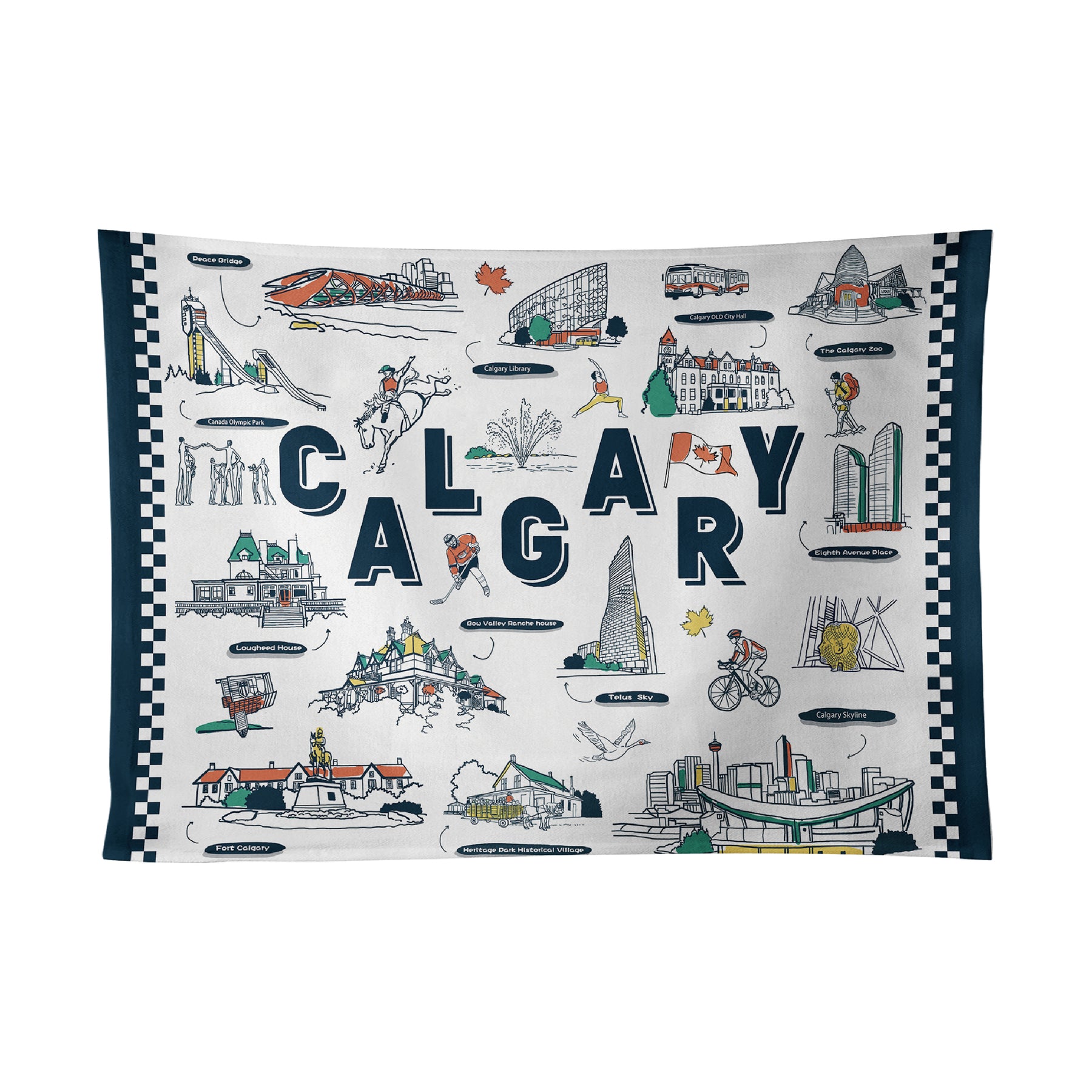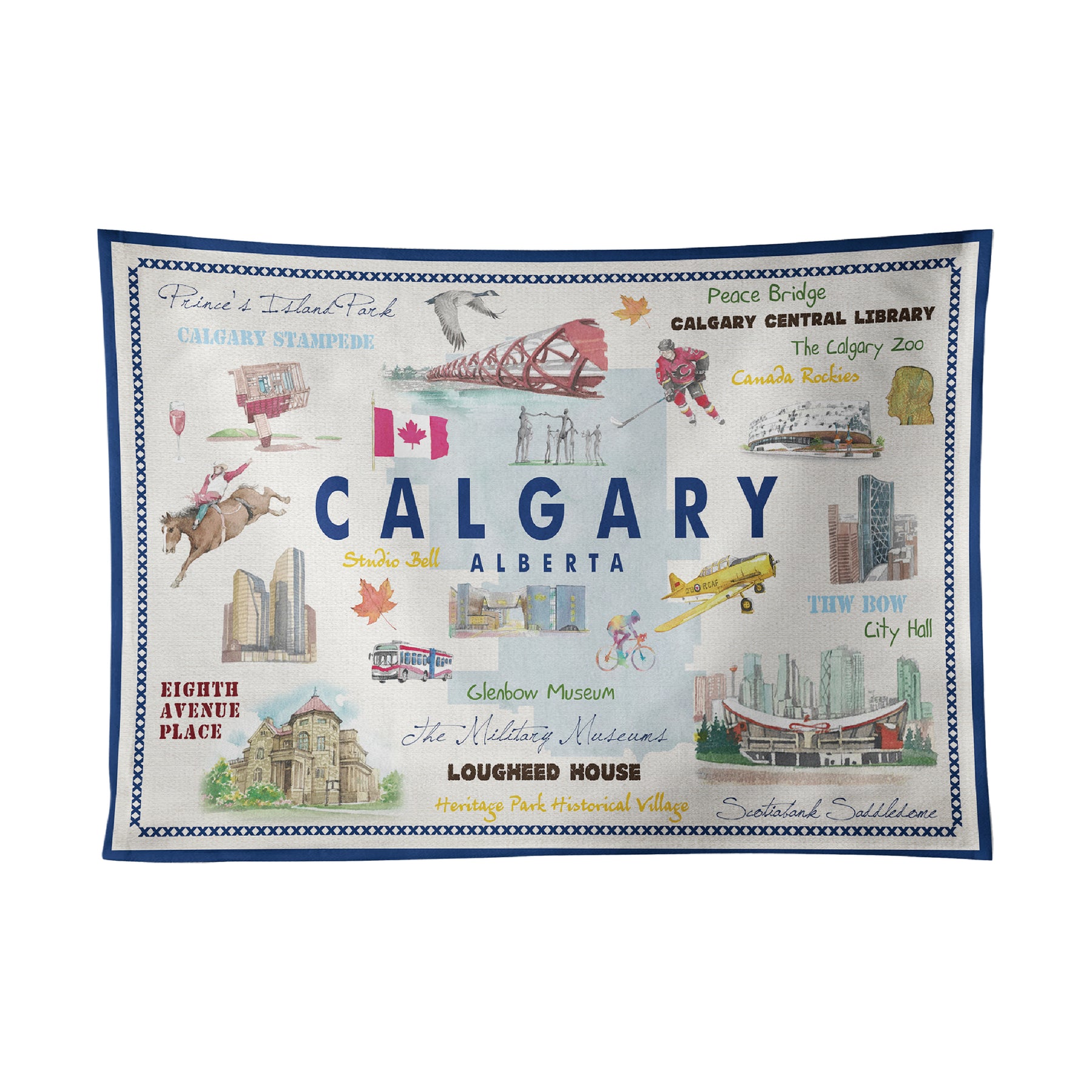 Bring a touch of Calgary’s vibrant charm to your kitchen with the Calgary Alberta Illustrated Tea Towel. Featuring hand-drawn illustrations of the city’s most recognizable landmarks — from the Calgary Tower and Peace Bridge to the Stampede cowboy and Telus Sky — this design captures the lively energy and creative spirit of Alberta’s cultural hub.