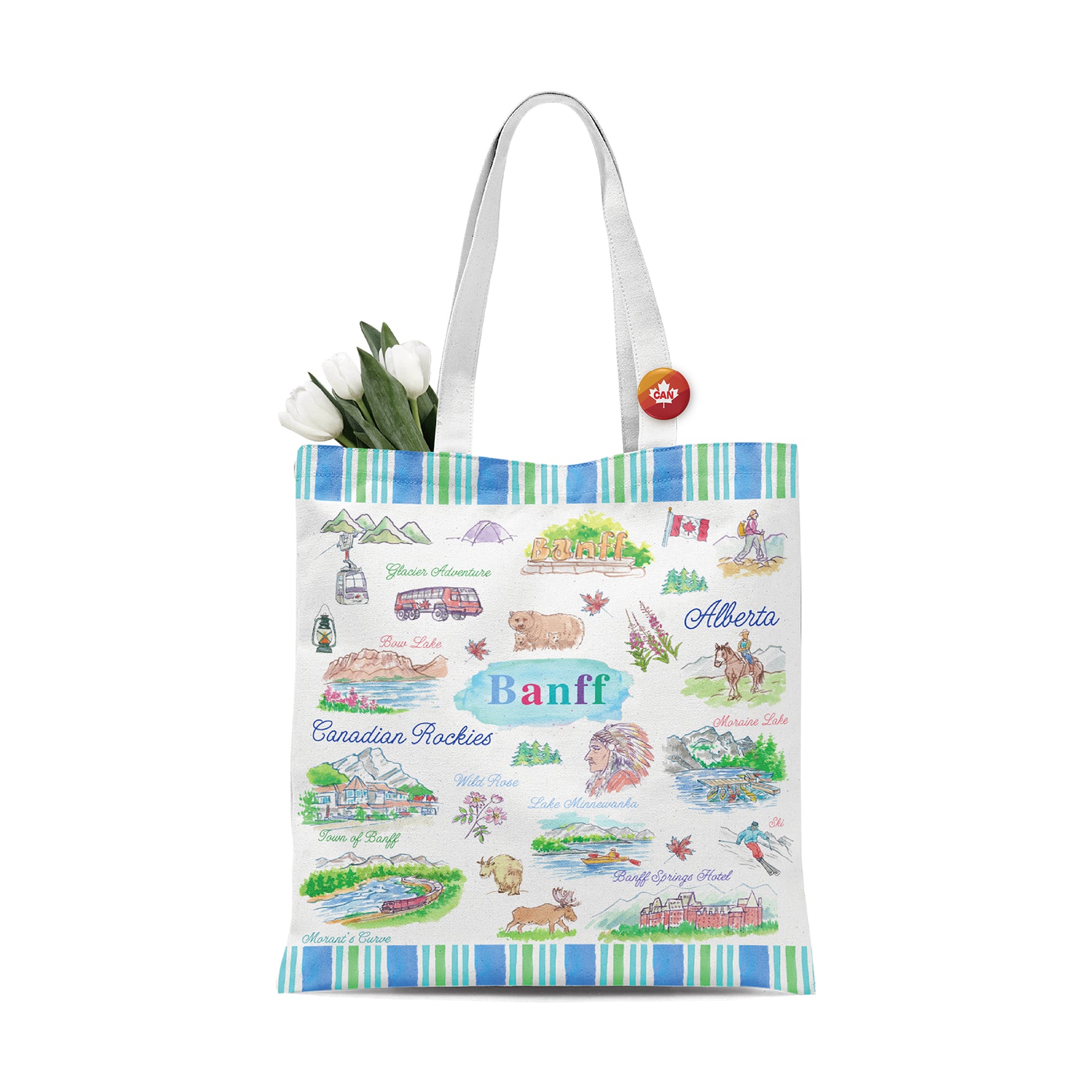Celebrate the beauty of Banff with this illustrated tote bag collection, inspired by the stunning Canadian Rockies. Each design features hand-drawn elements that highlight the charm of Banff National Park—iconic landmarks, mountain scenery, wildlife, and cultural symbols. The colorful artwork brings a nostalgic travel-poster style to life, making these tote bags both practical and collectible.