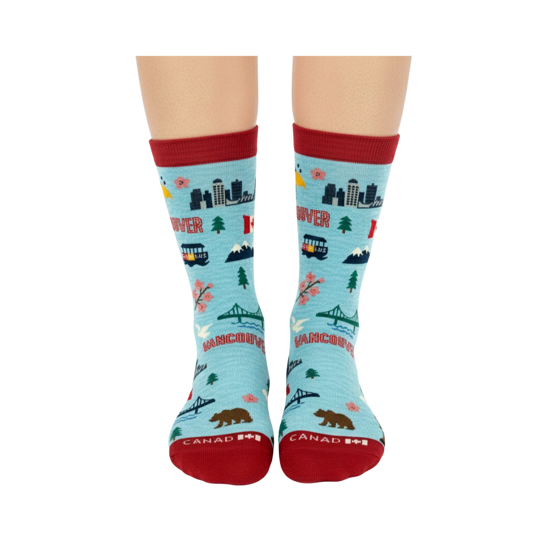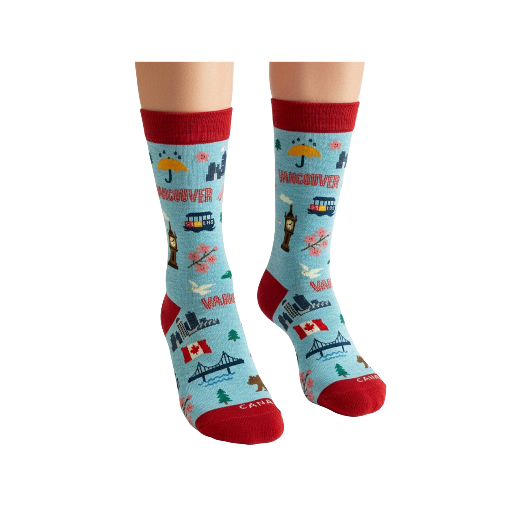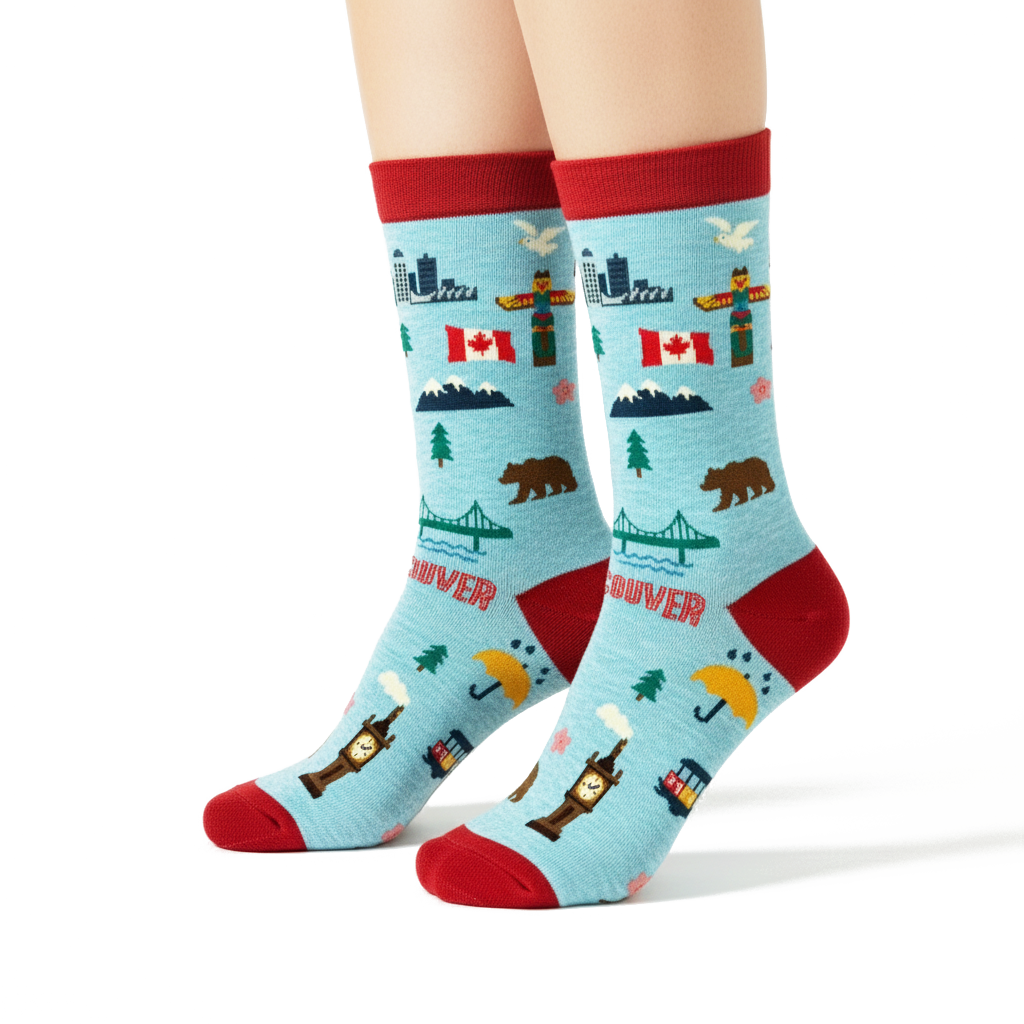 Designed as a wearable expression of place and everyday exploration, these socks capture the relaxed, adventurous spirit that defines Vancouver. The cohesive illustration style and fresh, harmonious color palette give the design a lively yet timeless feel, while the all-over pattern adds visual interest from every angle. Whether worn as a daily accessory or selected as a meaningful travel keepsake or gift, these Vancouver-inspired socks offer a comfortable way to celebrate Canada’s coastal city and its distinctive character.
