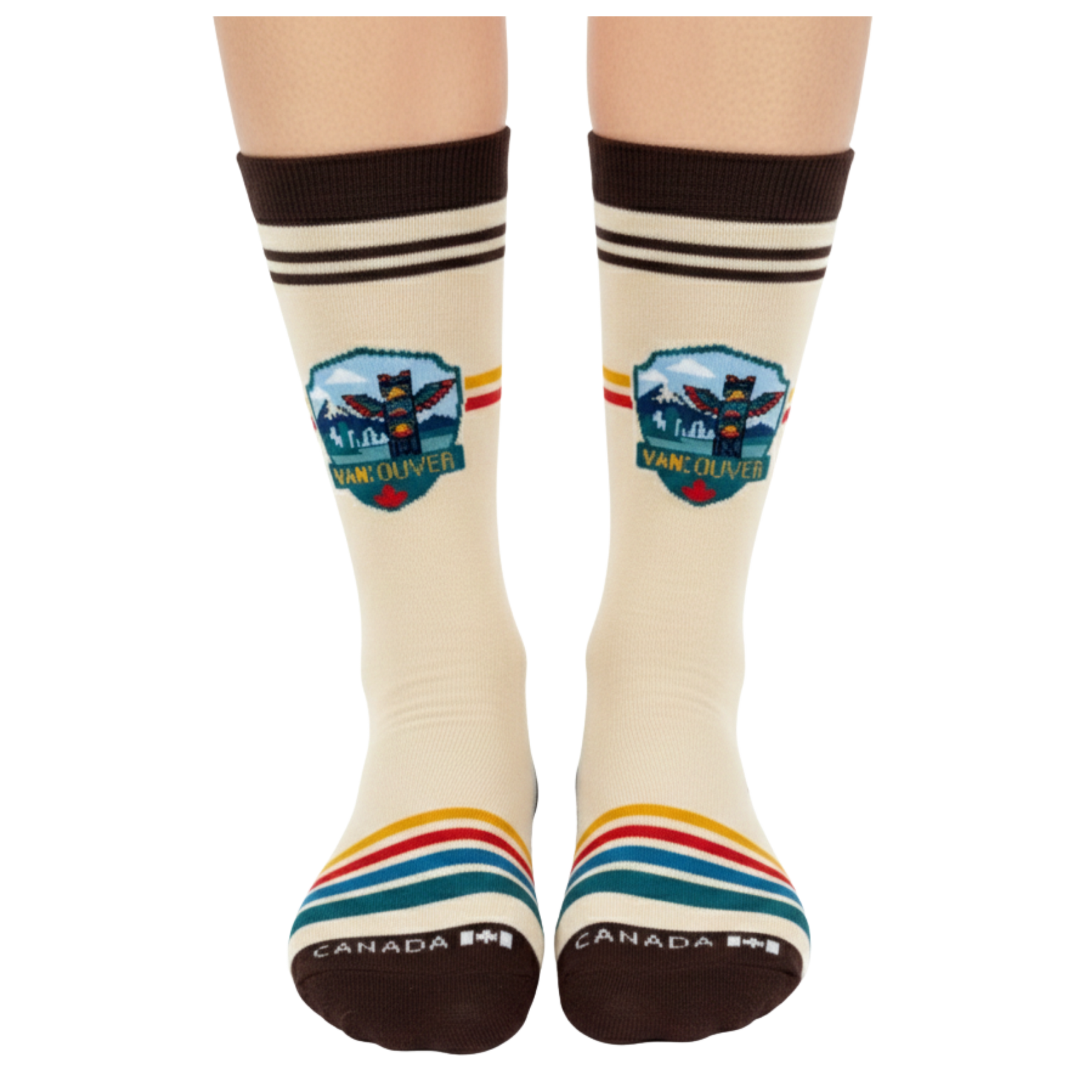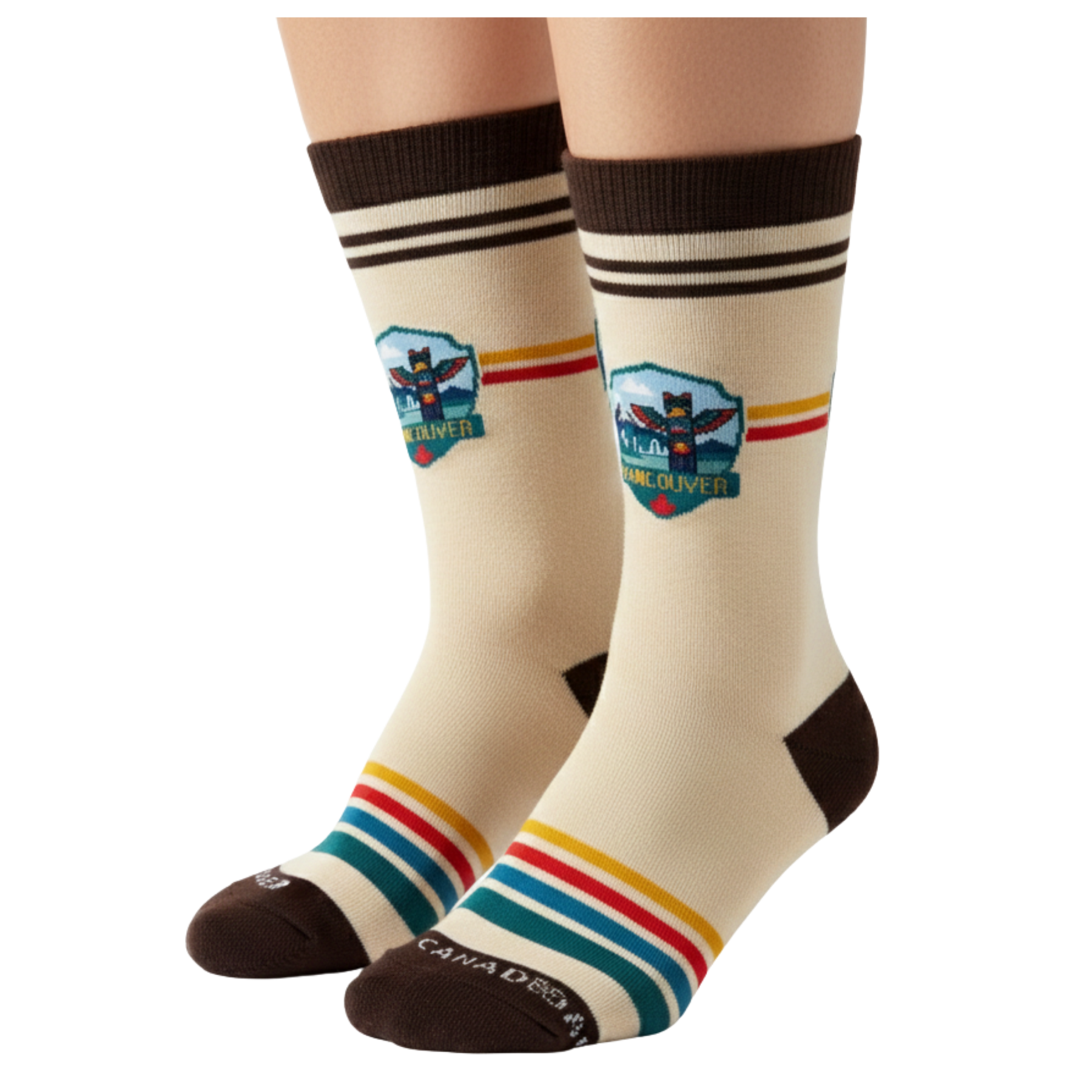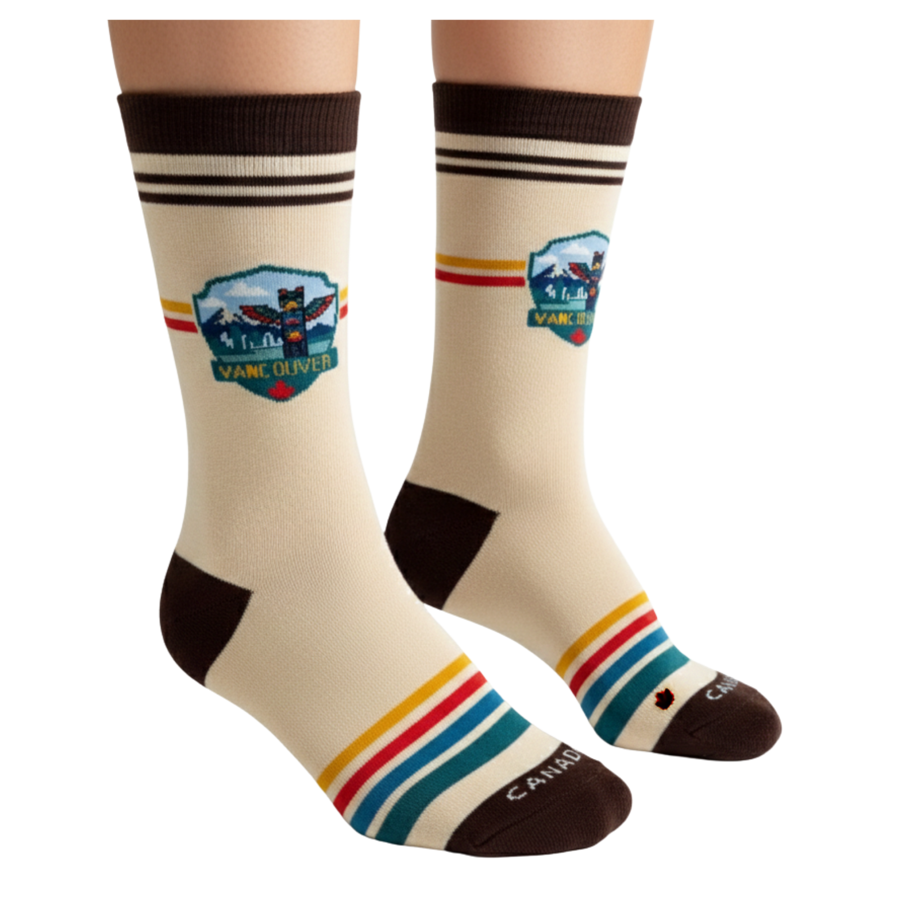 Inspired by Vancouver’s coastal heritage and cultural landscape, this crew sock design features a vintage badge-style illustration centered around a totem pole, framed by mountain silhouettes and city skyline elements. The composition reflects the unique balance of natural scenery and cultural identity found on Canada’s West Coast.