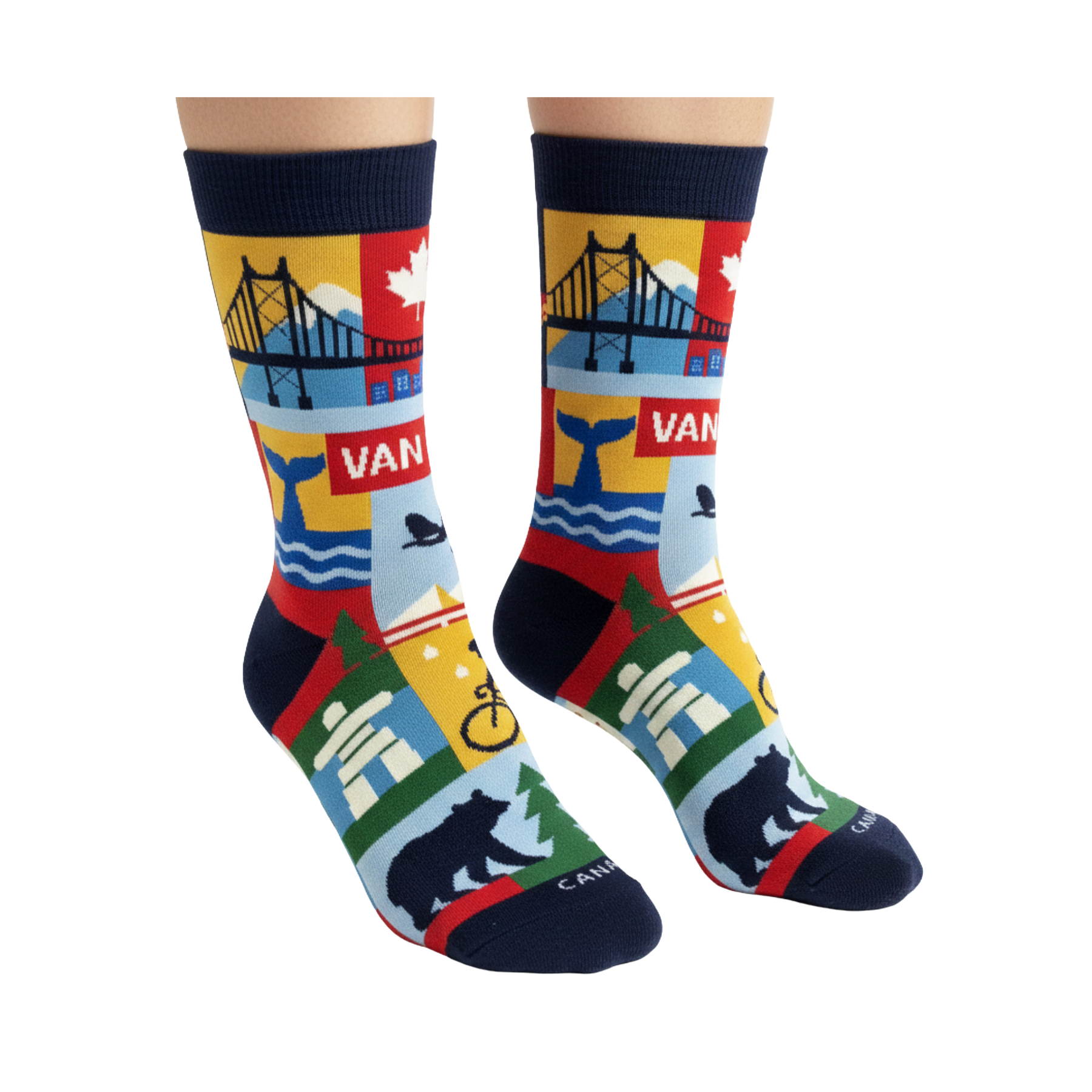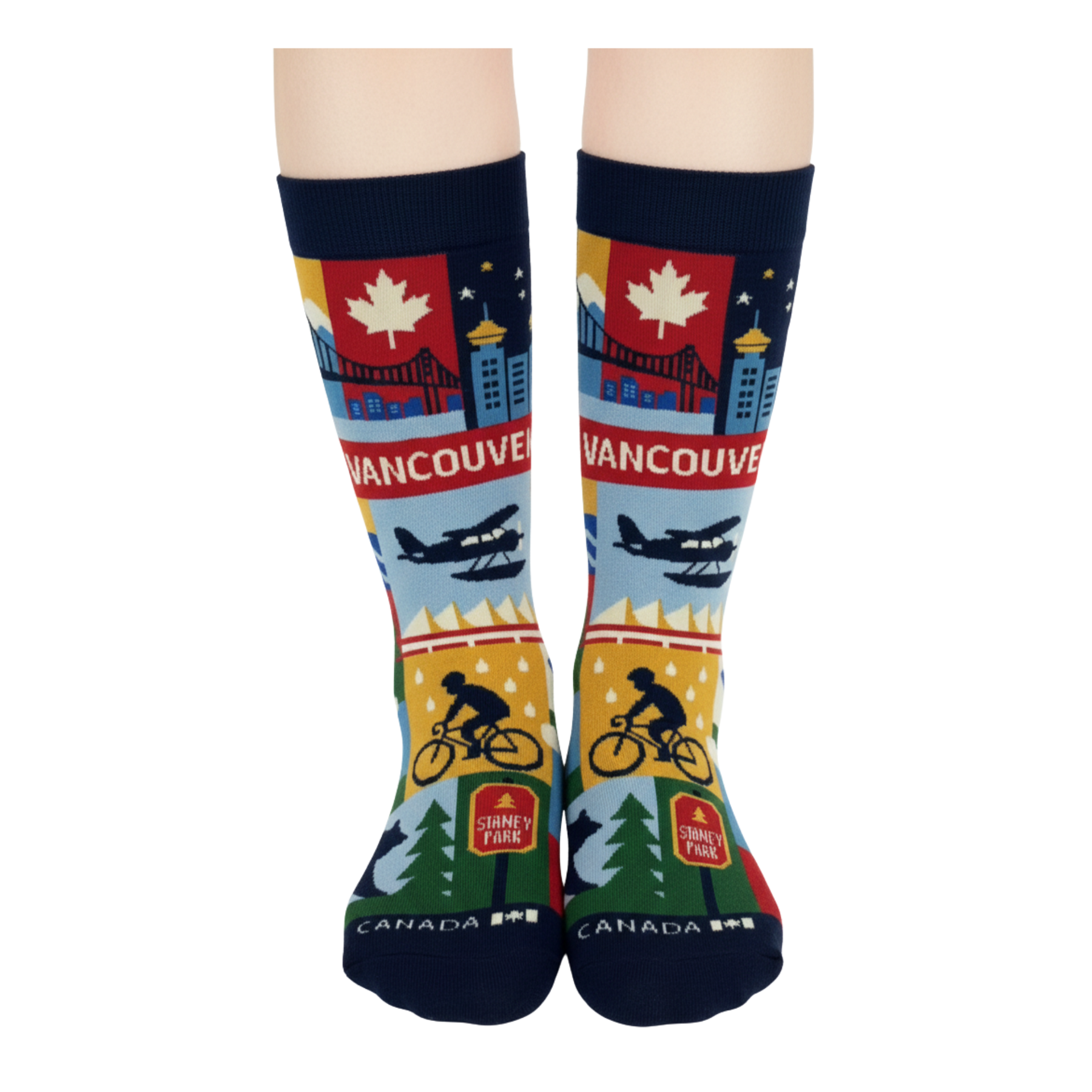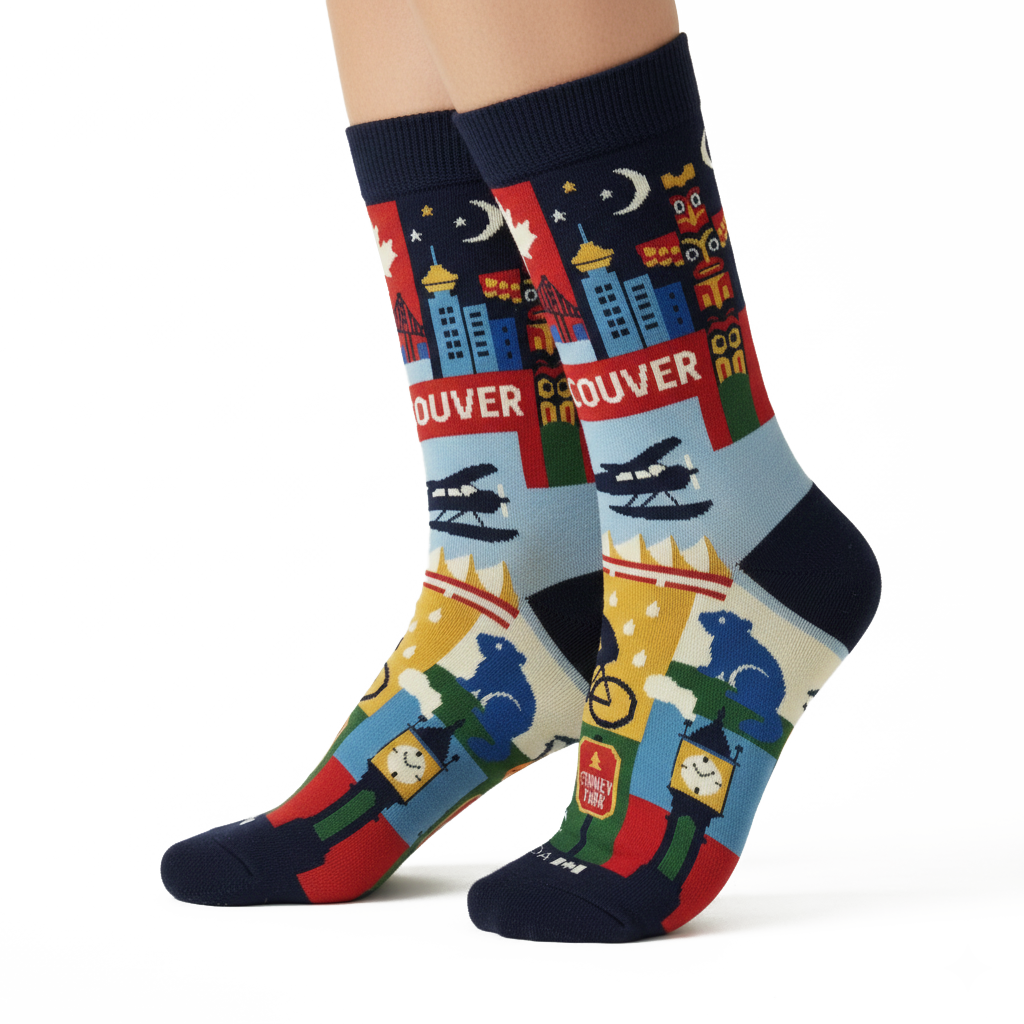 Inspired by the coastal lifestyle and outdoor spirit of Vancouver, these graphic crew socks feature a colorful collage of city landmarks and nature-driven scenes. The design brings together skyline elements, seaplanes, mountains, wildlife, and waterfront details, arranged in bold color blocks that reflect Vancouver’s unique balance between urban life and the natural environment.