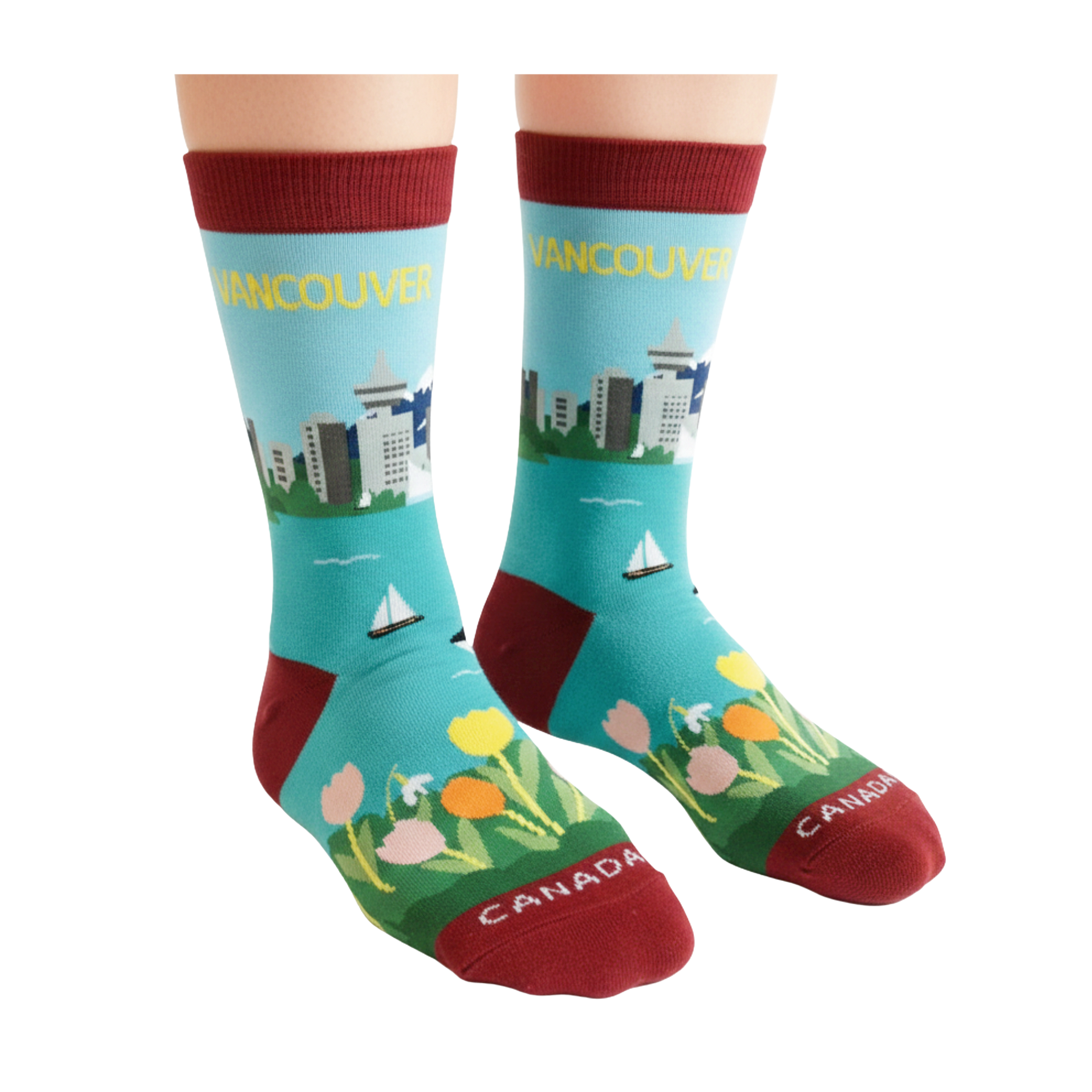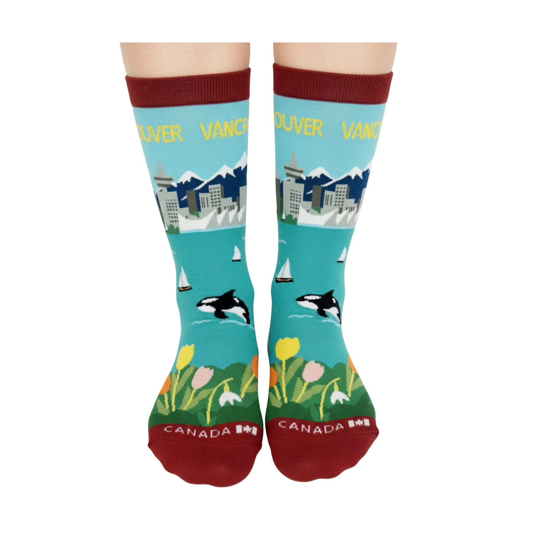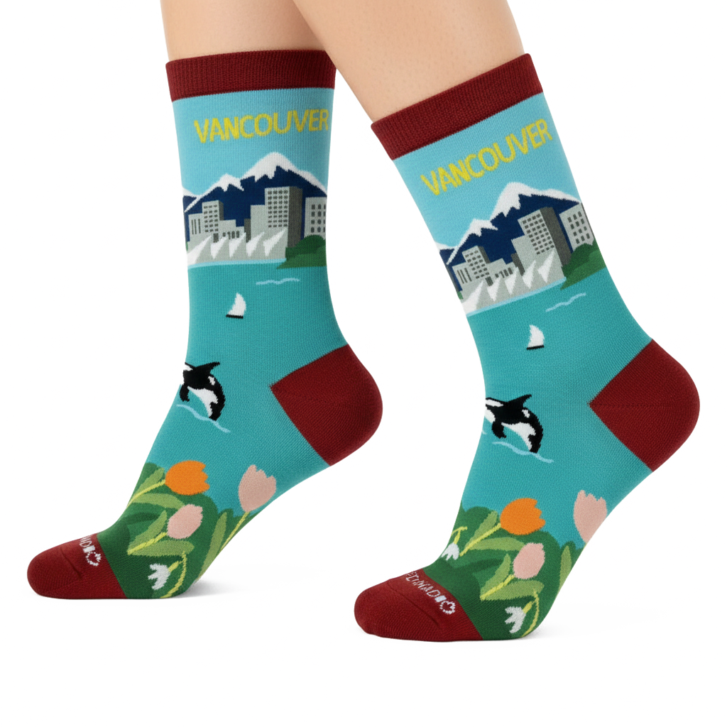 Inspired by Vancouver’s unique coastal setting, these scenic graphic crew socks capture the harmony between city life and the natural world. The design features a stylized city skyline set against mountain backdrops, calm coastal waters, sailboats, and an orca illustration, brought together with fresh, balanced colors that reflect Vancouver’s relaxed and nature-connected character.