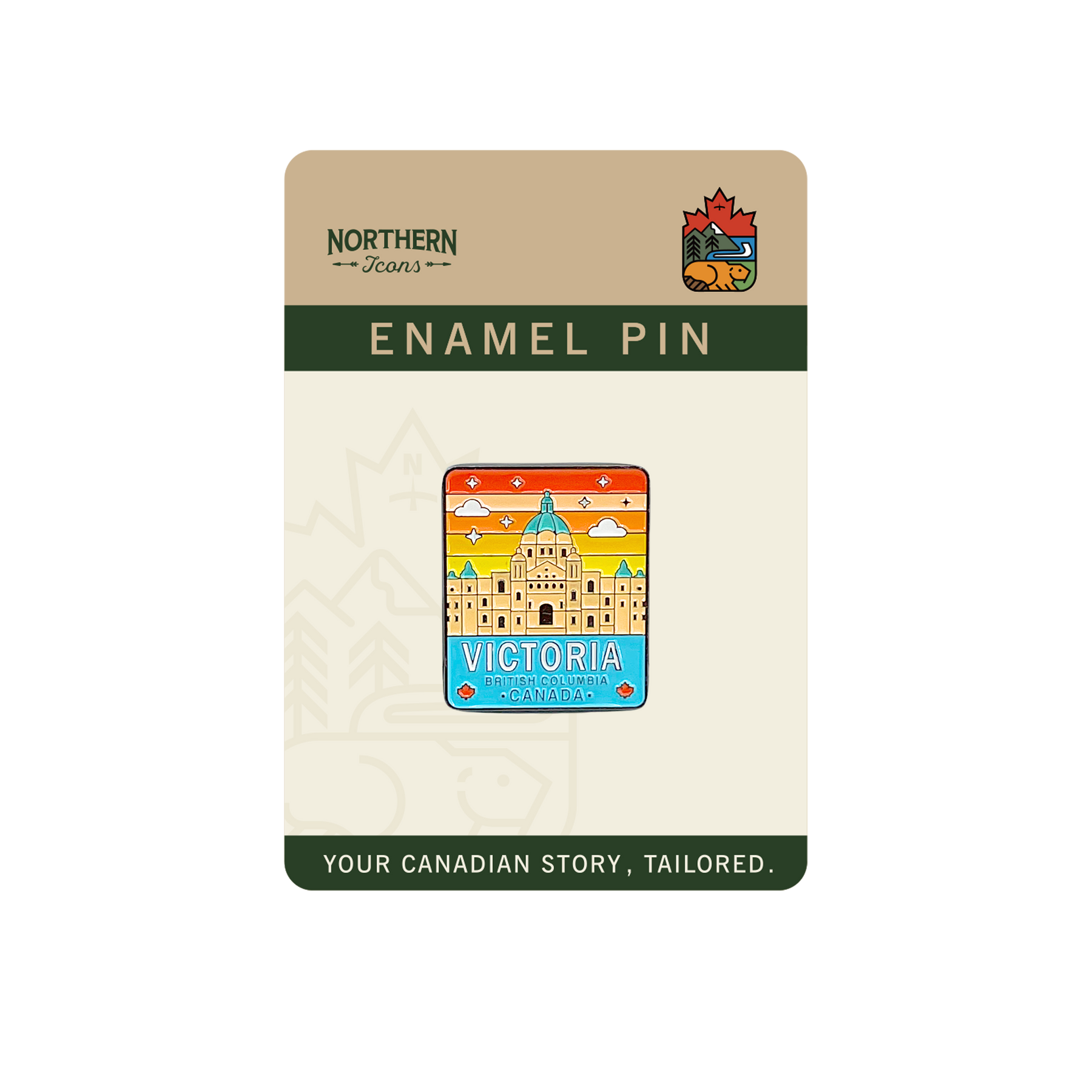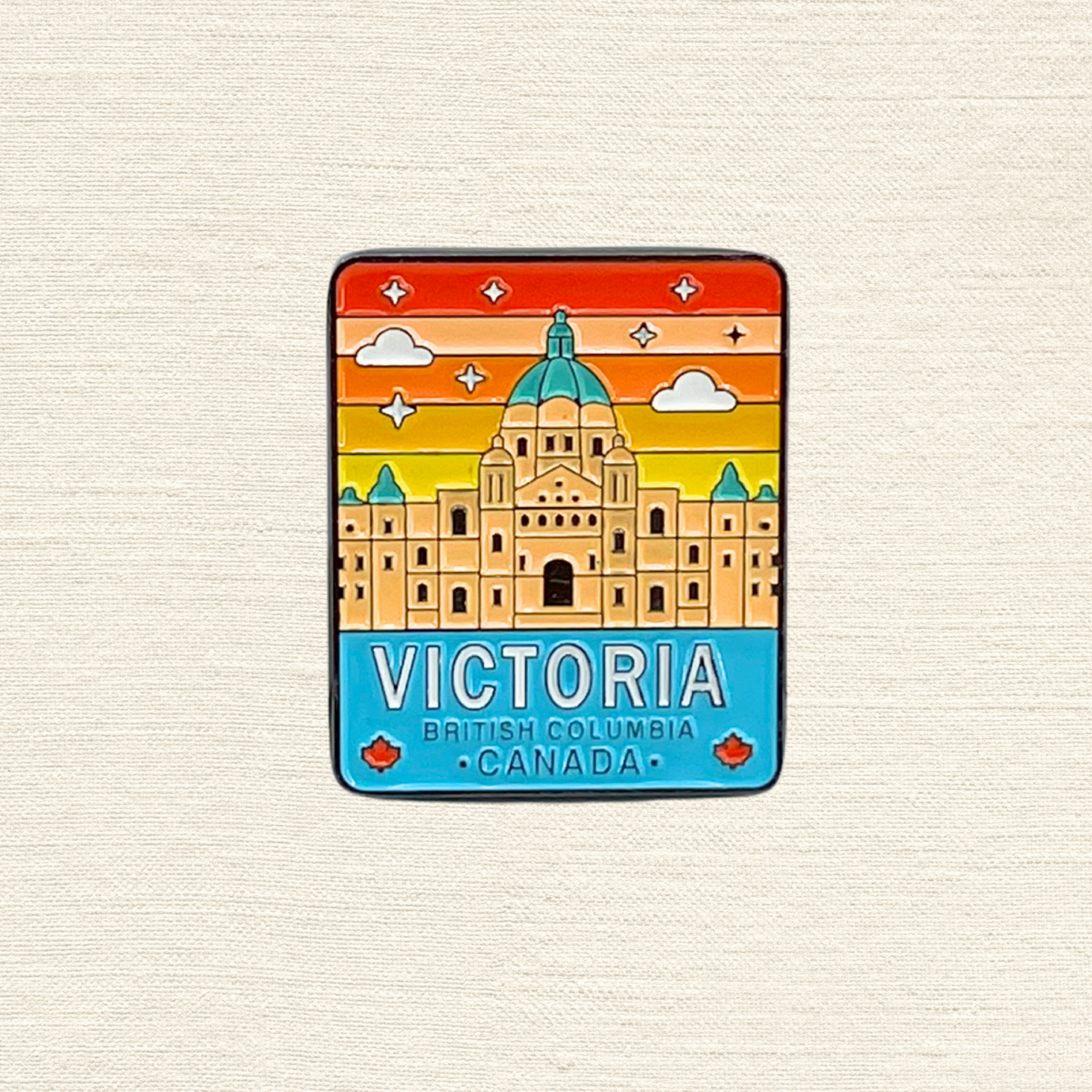 This enamel pin features Victoria’s iconic Parliament building set against a radiant sunset sky, blending shades of red, orange, and yellow for a warm, nostalgic glow. The bold architectural lines paired with playful stars and clouds reflect a harmonious balance between history and wonder, evoking the charm and pride of British Columbia’s capital city.