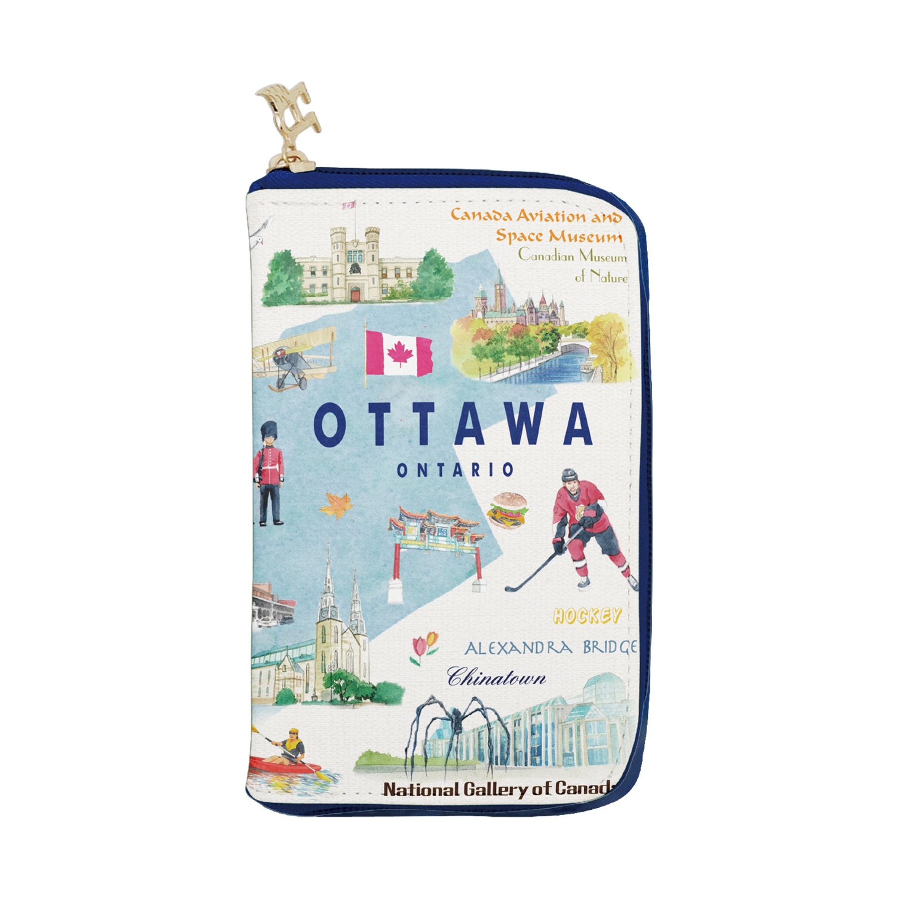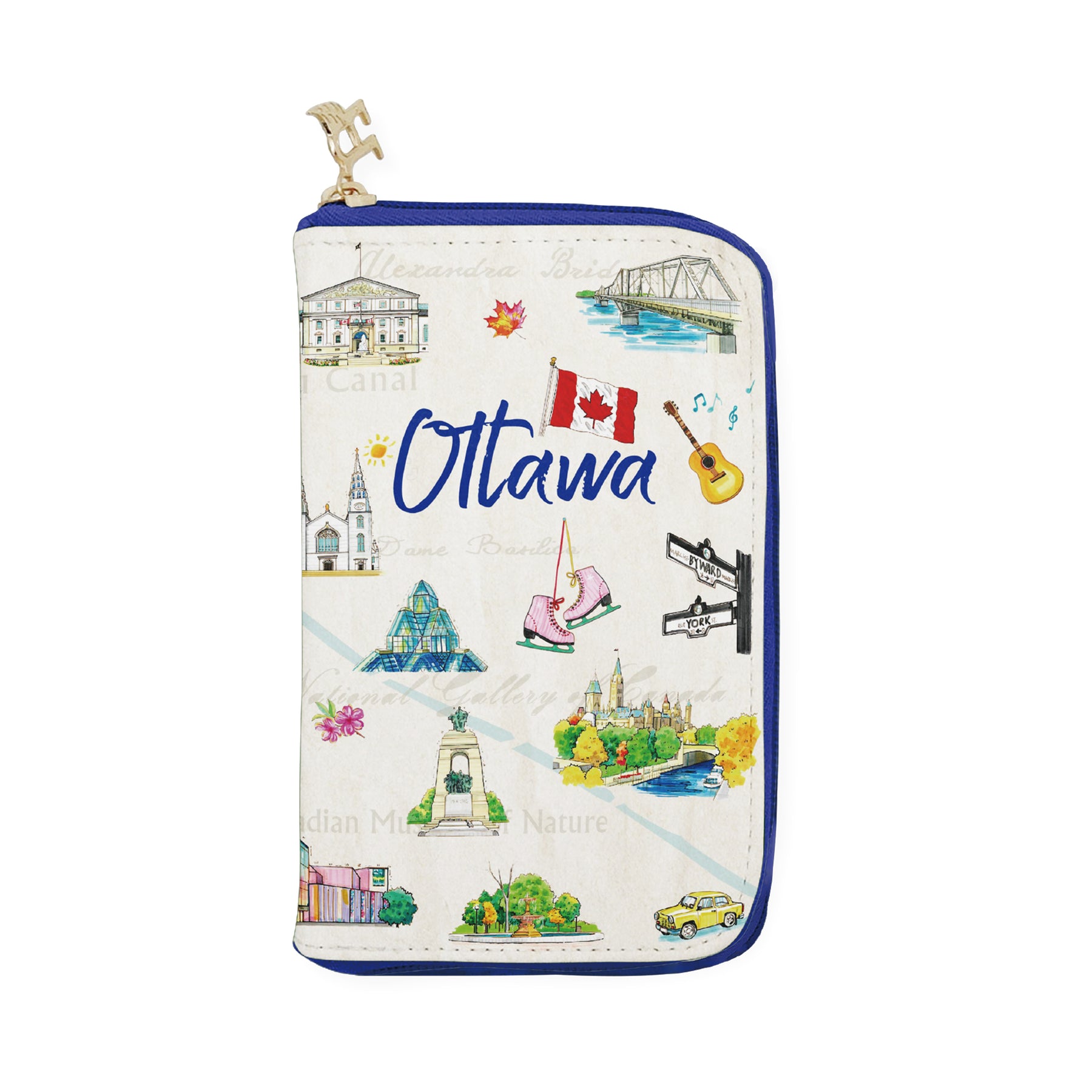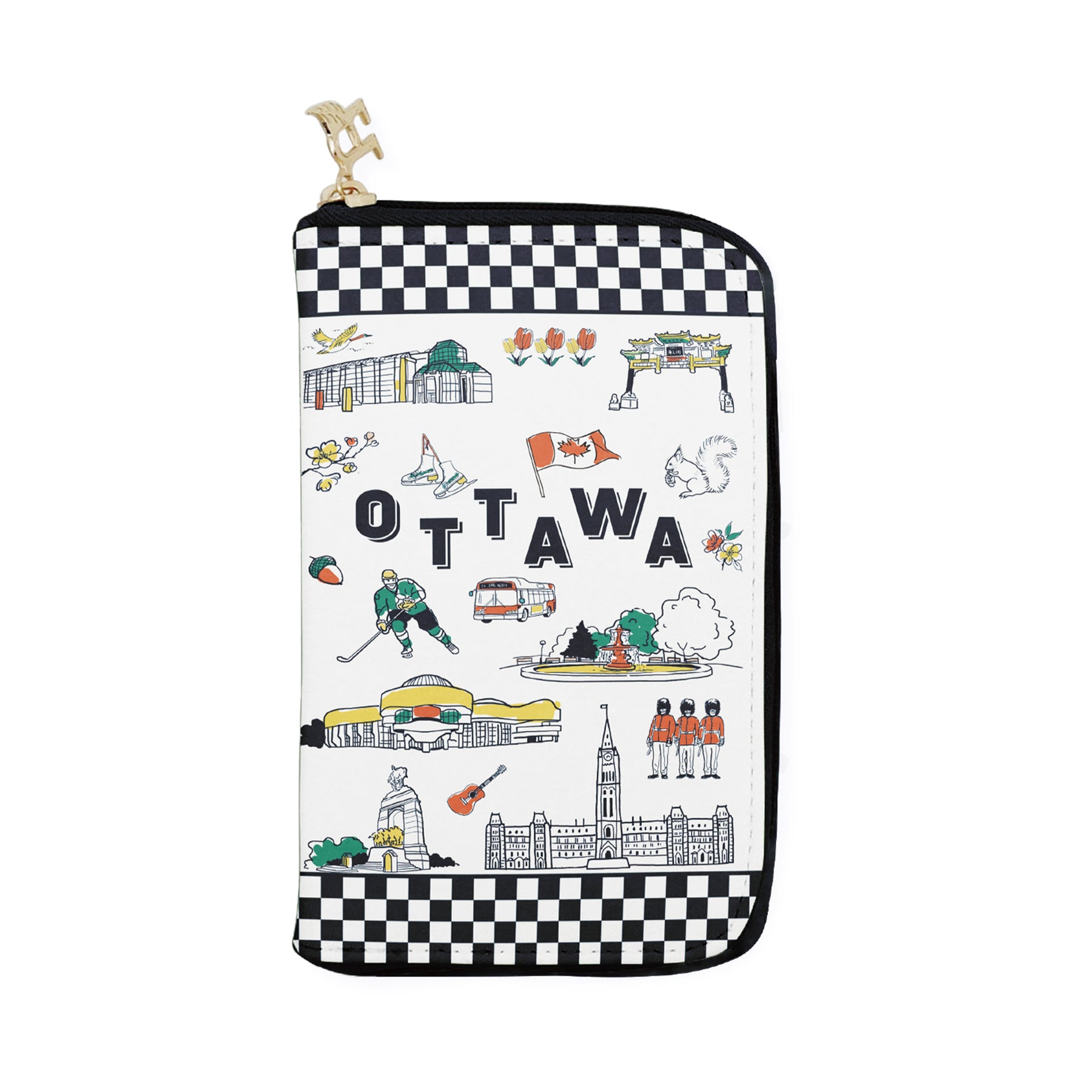 This medium zip wallet features a playful illustration of Ottawa, combining hand-drawn landmarks, cultural icons, and classic city elements into a cheerful and modern design. The artwork highlights scenes such as Parliament Hill, skating traditions, garden spaces, Chinatown, museums, and everyday city life—brought together with a bold checker-style border for a fresh, contemporary look. The clean lines and vibrant colors add an artistic, travel-inspired feel to this compact accessory.