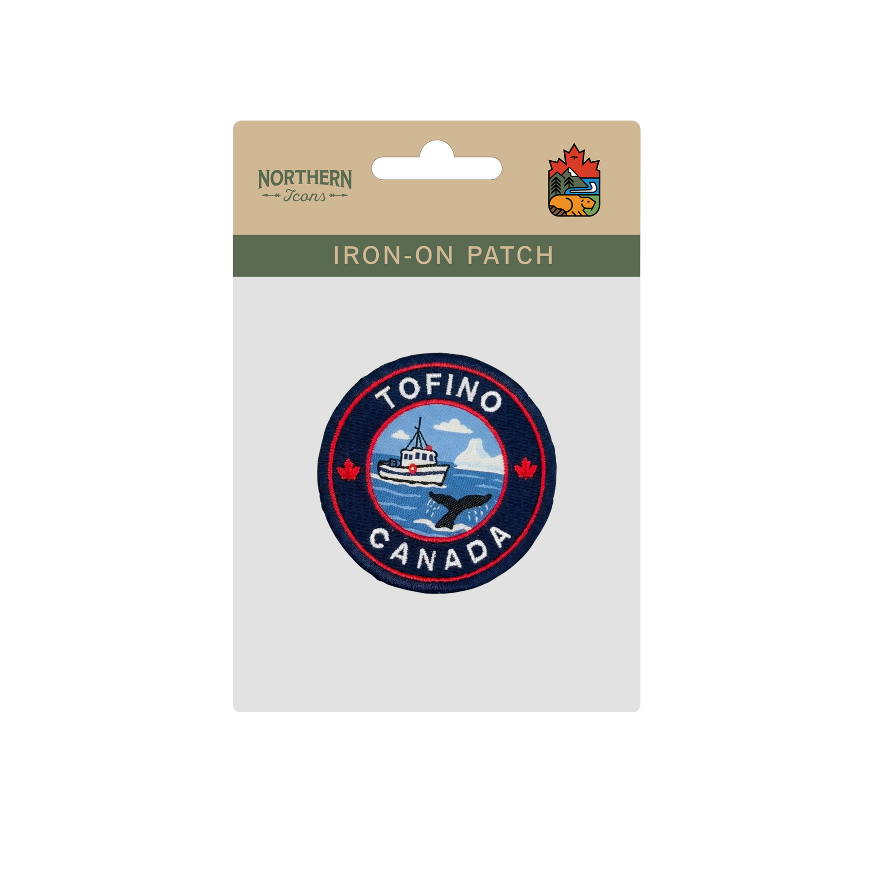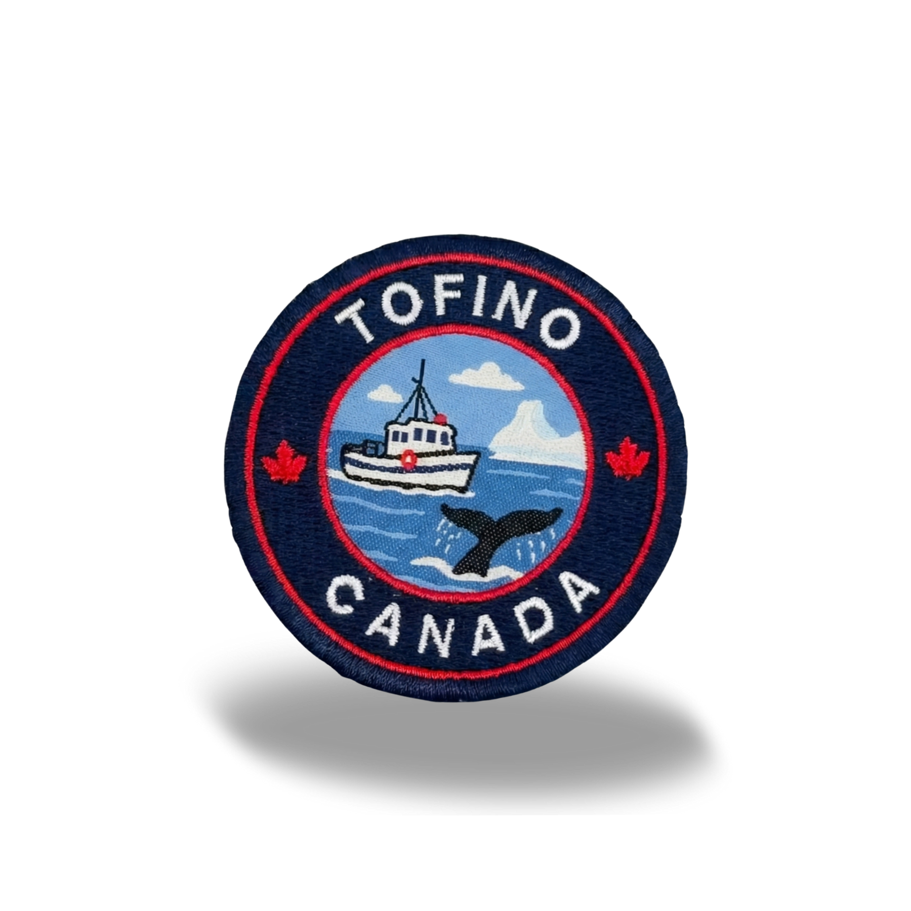 Celebrate the laid-back coastal spirit of Canada’s Pacific shore with this Tofino Coastal Embroidered Patch. Designed in a classic round badge shape, the artwork captures the essence of Tofino through a small fishing boat floating on open water, a rising whale tail, and distant coastal landforms set beneath a soft sky. Subtle maple leaf accents frame the scene, quietly anchoring the design in Canadian identity.