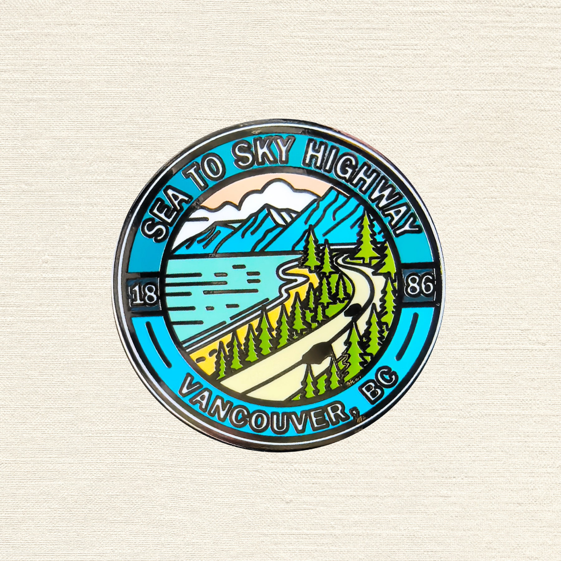 Celebrate one of the most scenic drives in the world with the Sea to Sky Highway Pin. Featuring bold colors and a stunning circular composition, this pin captures the essence of British Columbia’s legendary highway—where ocean meets mountains and forests stretch to the sky. The winding road, evergreen trees, and snowcapped peaks are a tribute to the freedom of the open road and the breathtaking natural beauty of Vancouver’s backyard.