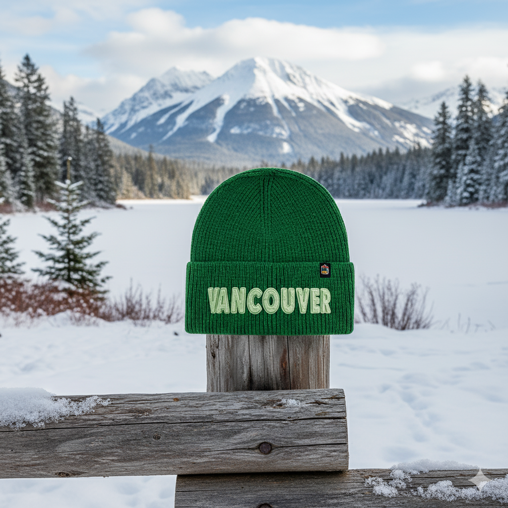 Celebrate Vancouver’s coastal energy with this Vancouver Letter Knit Toque, designed with a clean and cheerful aesthetic that reflects the city’s outdoor-inspired lifestyle. The front features playful varsity-style lettering filled with subtle maple-leaf motifs, bringing a warm and friendly touch to the design. The simple, modern layout keeps the toque versatile and easy to style, echoing Vancouver’s blend of nature, creativity, and laid-back west-coast spirit.