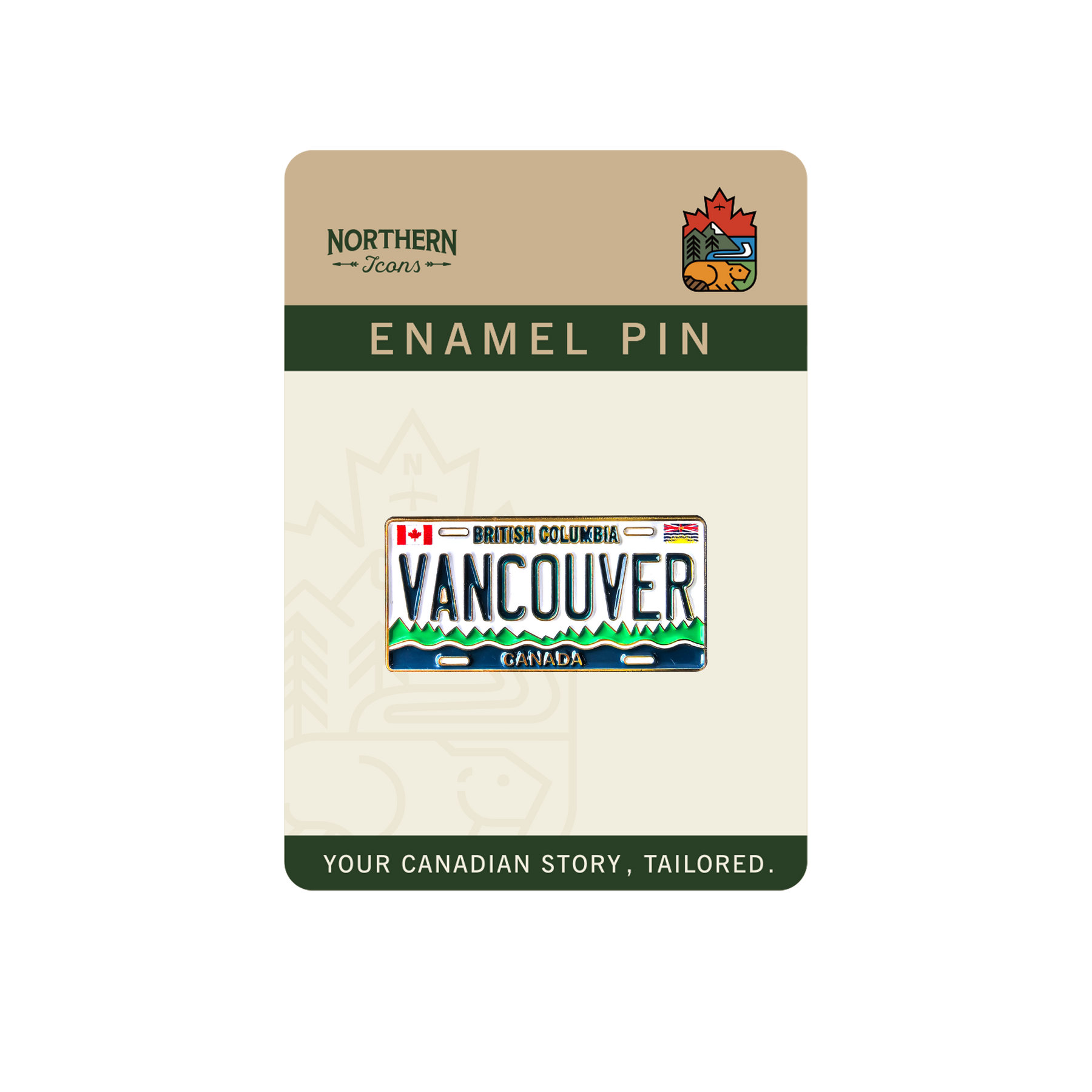 Inspired by the iconic design of British Columbia’s license plates, this enamel pin captures the bold, adventurous spirit of Vancouver. With sharp mountain silhouettes, vibrant flag details, and clean typography, it blends graphic style with a sense of movement and travel. It evokes the open road, the freedom of the West Coast, and pride in place.