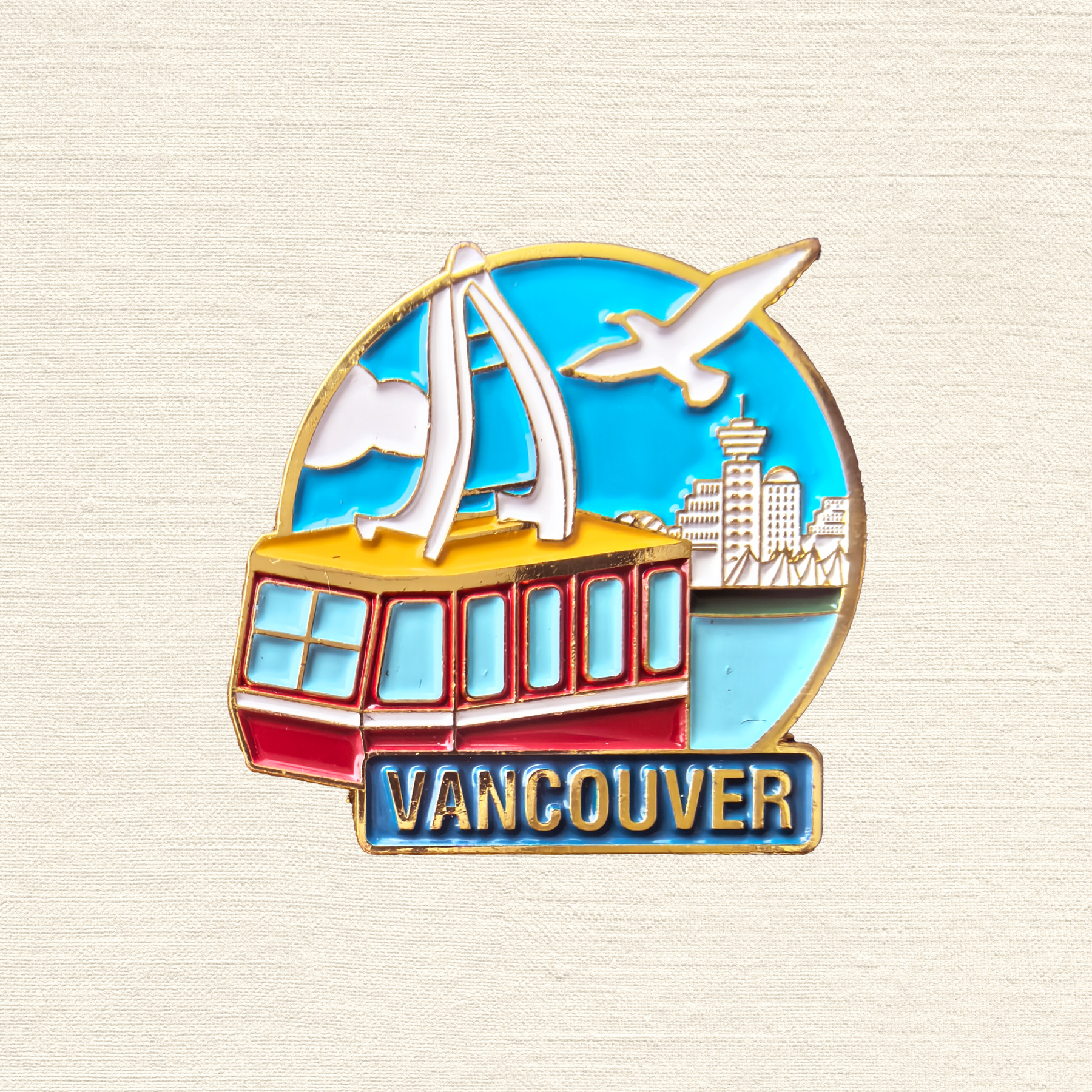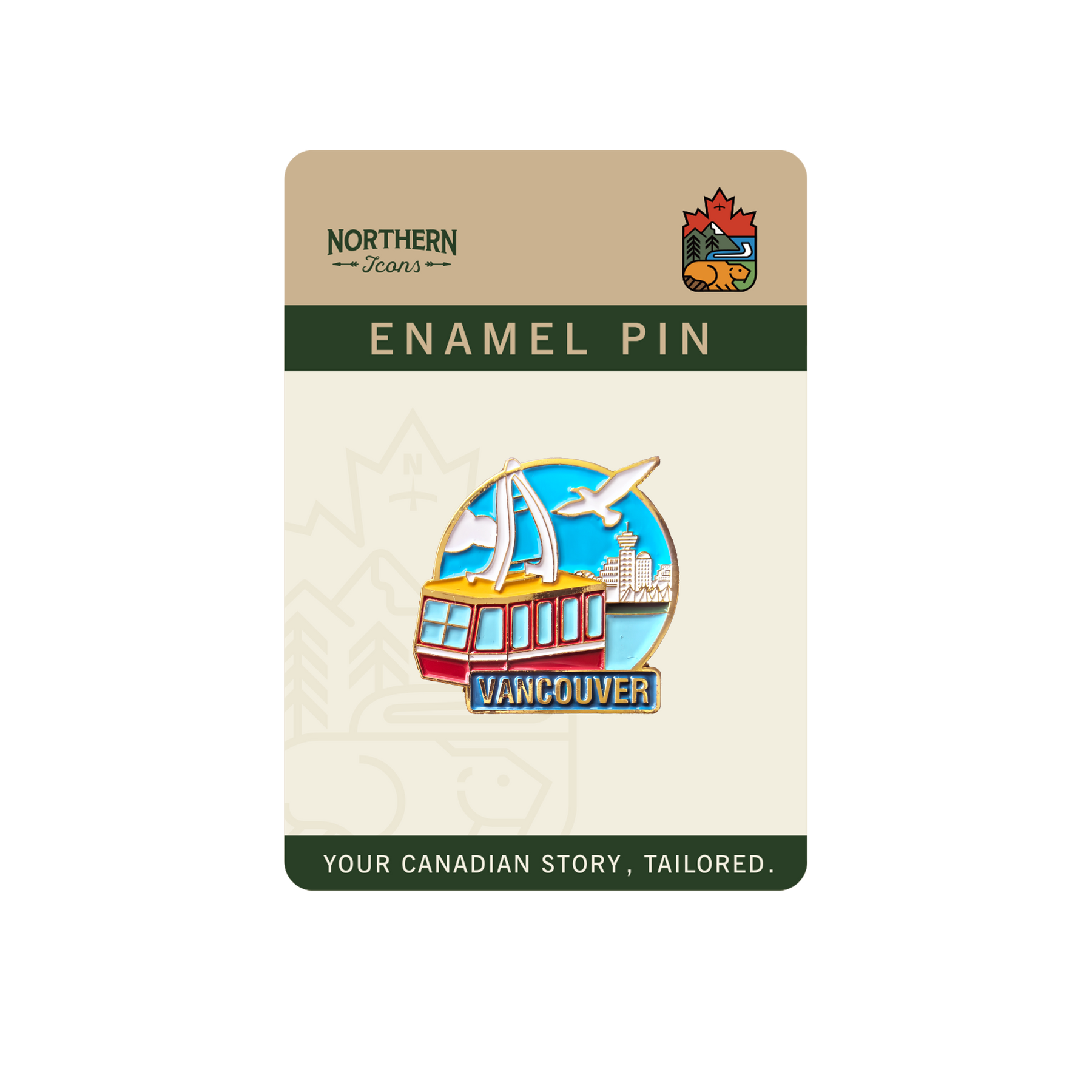This eye-catching enamel pin captures the iconic Vancouver cable car soaring through a bright blue sky, with the city skyline and soaring seagulls in the background. The design symbolizes freedom, adventure, and the harmony between urban life and natural beauty. With its bold colors and fluid lines, this pin evokes the spirit of exploration and the unique charm of Vancouver — a place where the mountains meet the sea and dreams rise with the skyline.