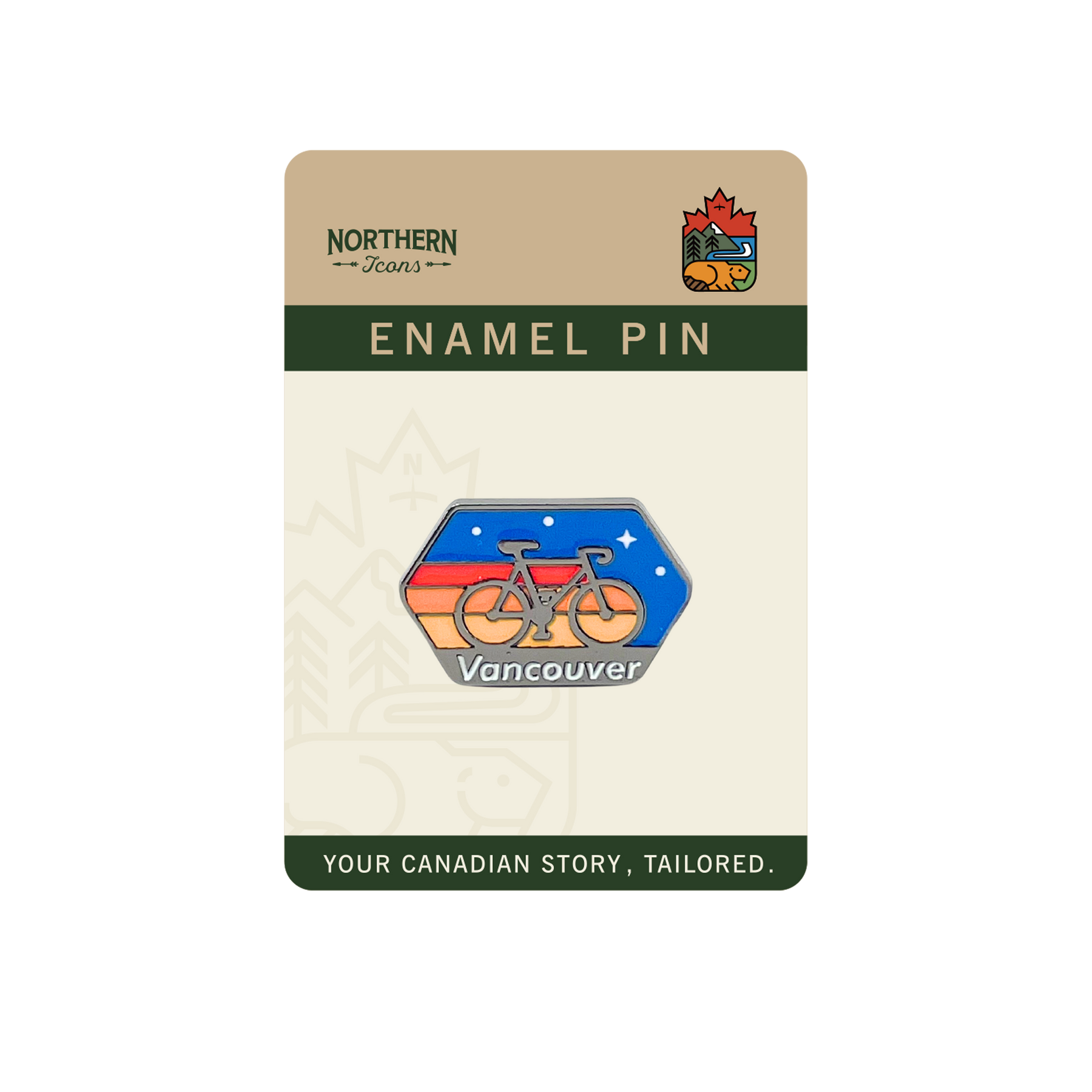 This enamel pin captures the freedom and vibrance of Vancouver’s bike culture with a sleek bicycle silhouette set against a sunset-inspired gradient and starry night sky. The geometric shape adds a bold, modern flair—perfect for those who find joy in the journey and connection to nature through cycling.