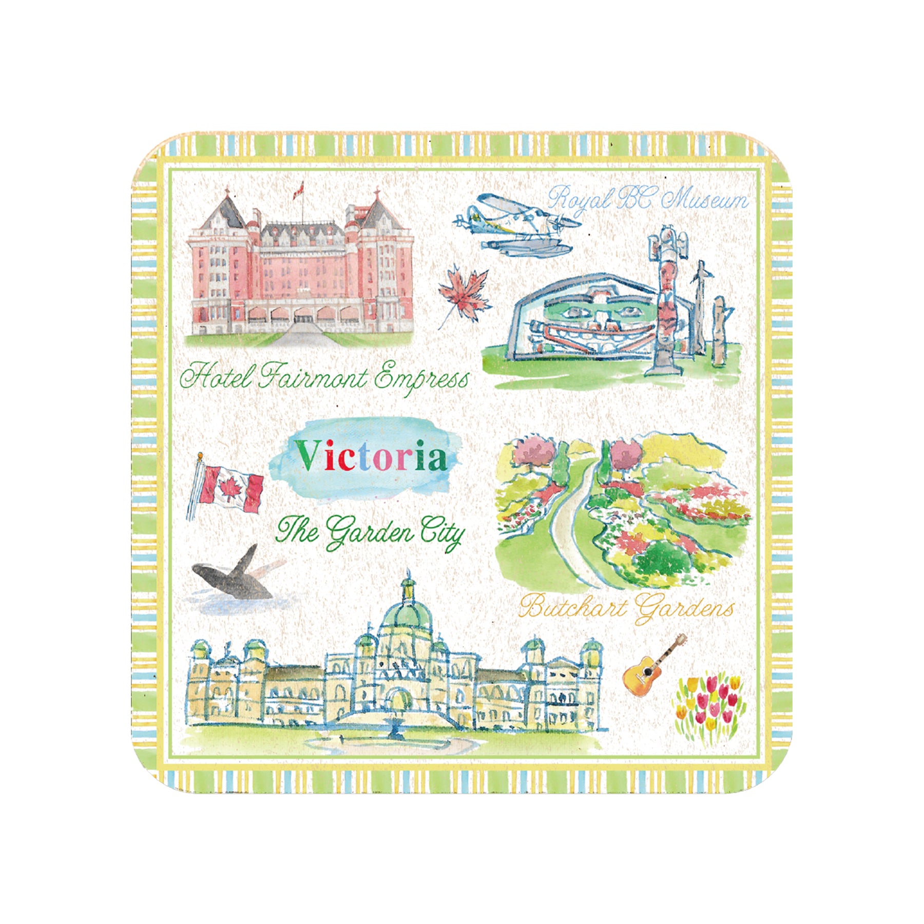 This illustrated coaster set captures the charm of Victoria, British Columbia through a series of hand-drawn watercolor scenes—historic landmarks, coastal icons, gardens, and the vibrant lettering that reflects the city’s warm personality. Each coaster features a different moment of Victoria’s landscape, creating a coordinated set that brings artistic character to any tabletop.