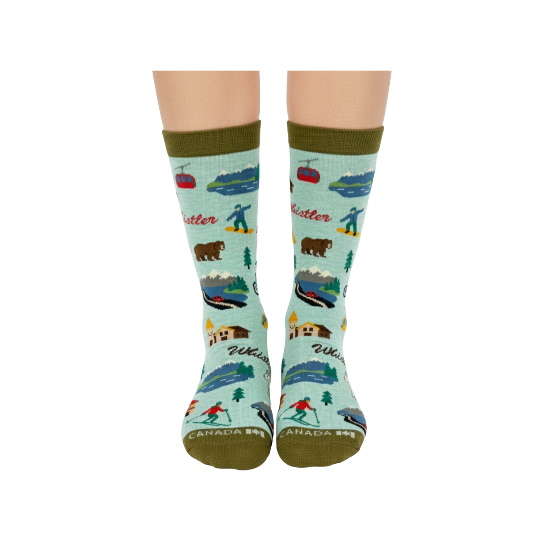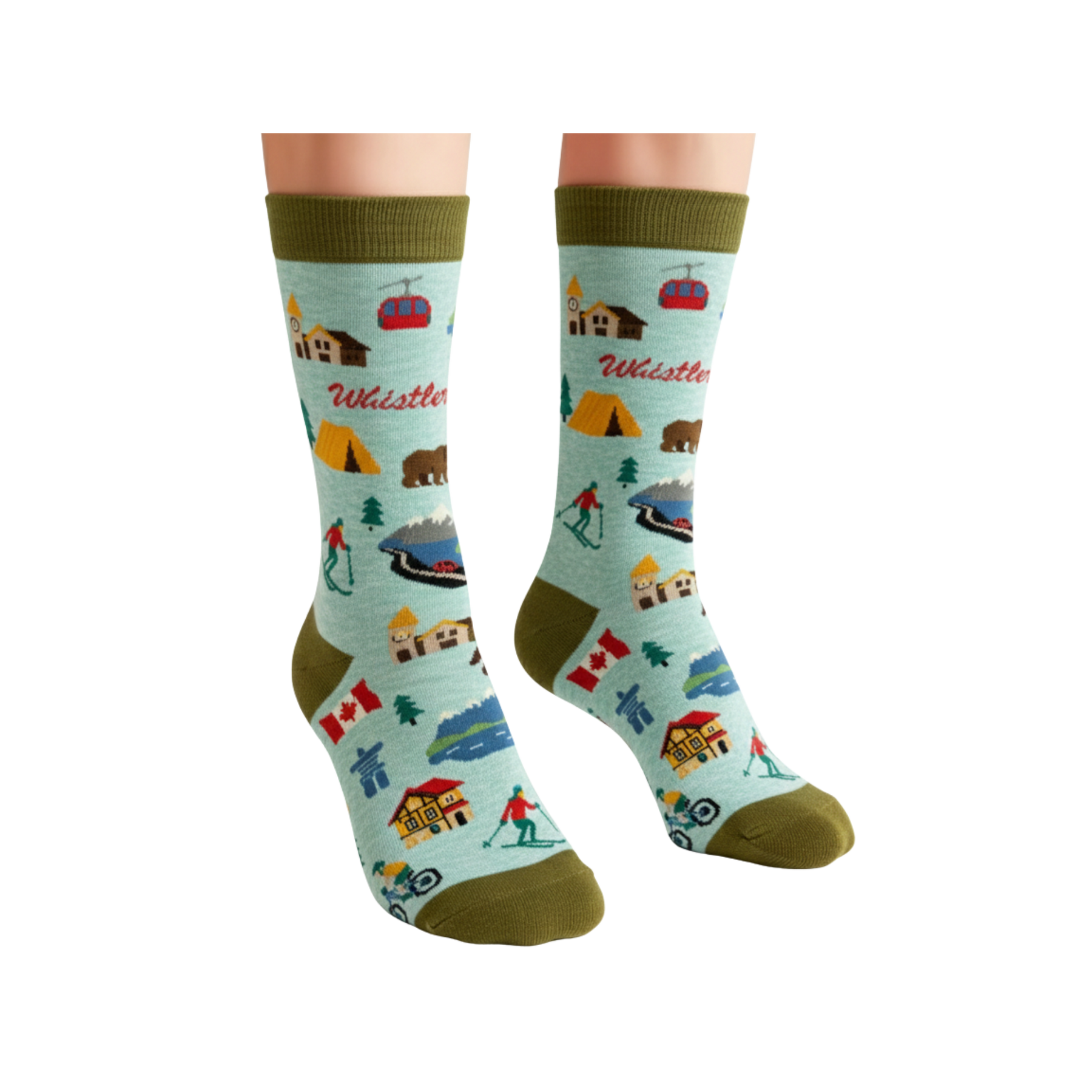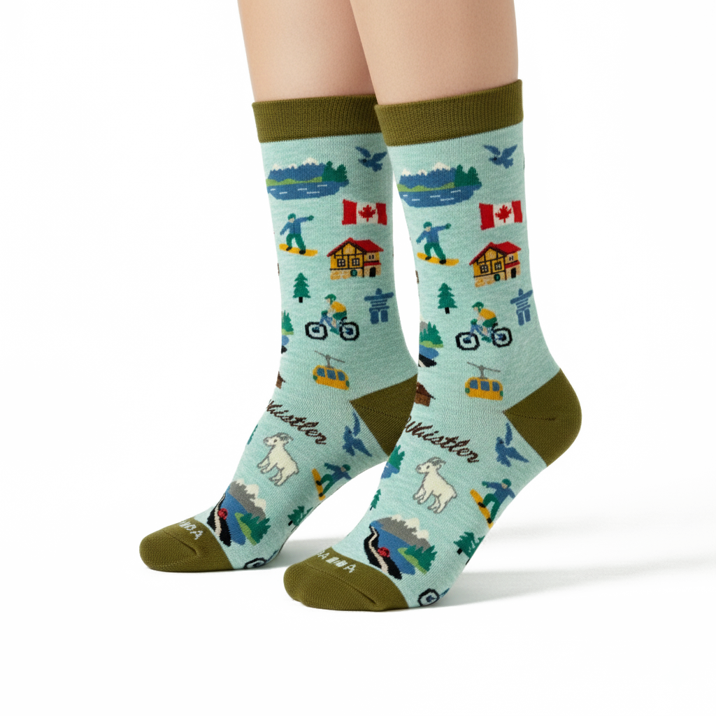 Designed as a wearable expression of exploration and everyday movement, these socks capture the energy and charm of mountain living. The cohesive illustration style and fresh, nature-inspired color palette give the design a playful yet timeless feel, while the all-over pattern adds visual interest from every angle. Whether worn as a daily accessory or chosen as a meaningful travel keepsake or gift, these Whistler-inspired socks offer a comfortable way to celebrate Canada’s iconic mountain destinations.