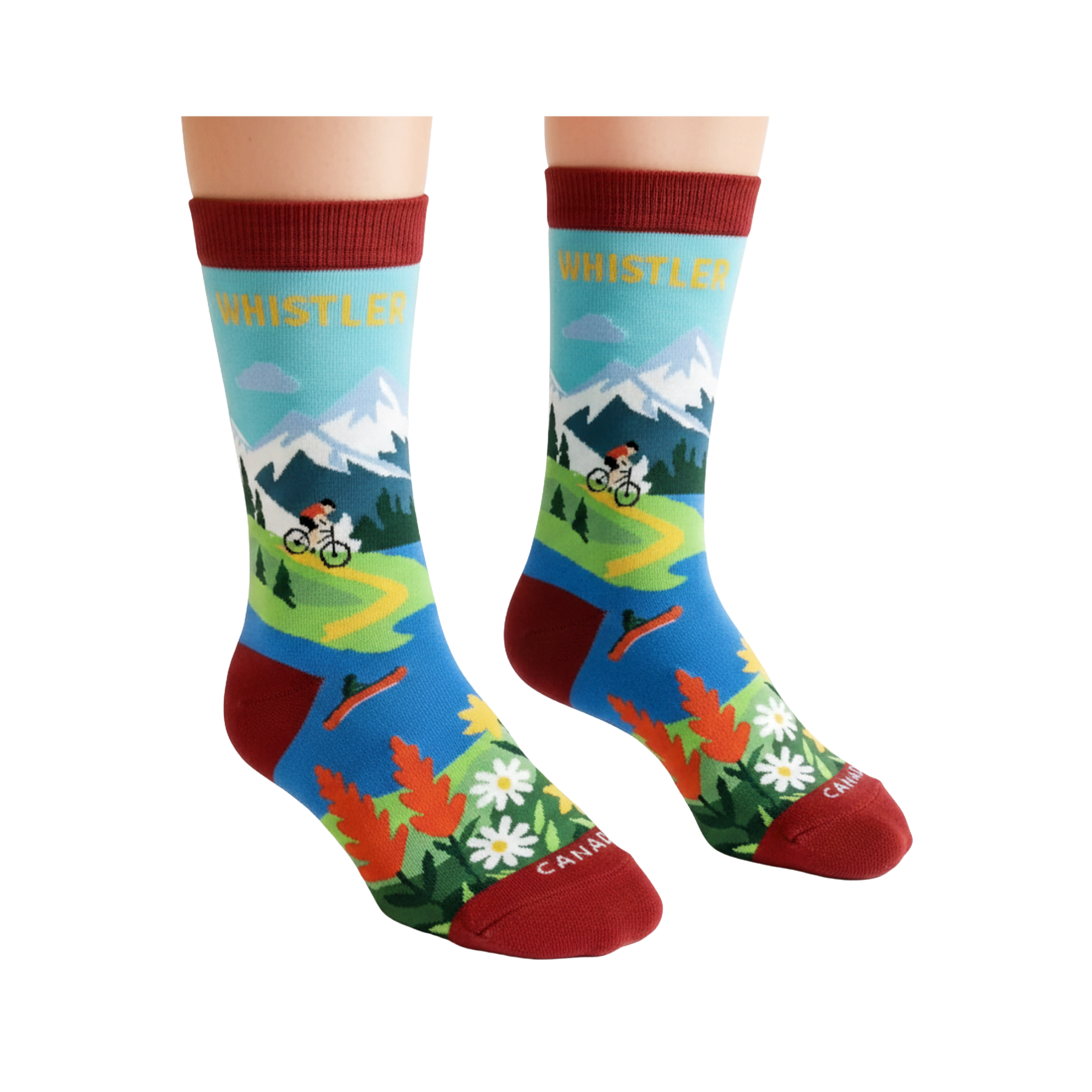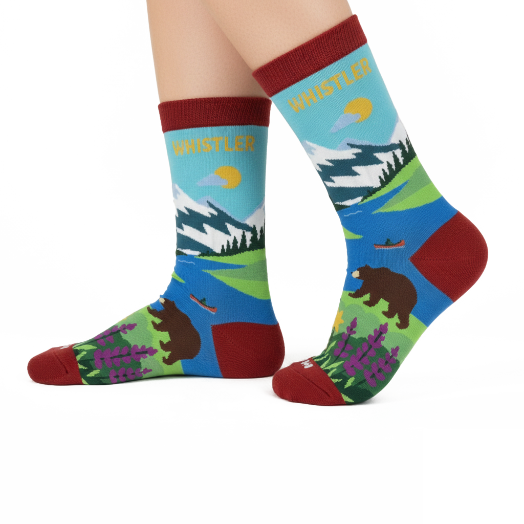 Inspired by the alpine landscapes of Whistler, these “Whistler” graphic crew socks capture the spirit of outdoor adventure and mountain escape. The design features snow-capped peaks, winding lakes, forested hills, and wildlife details, creating a layered scene that reflects the region’s connection to nature and exploration.